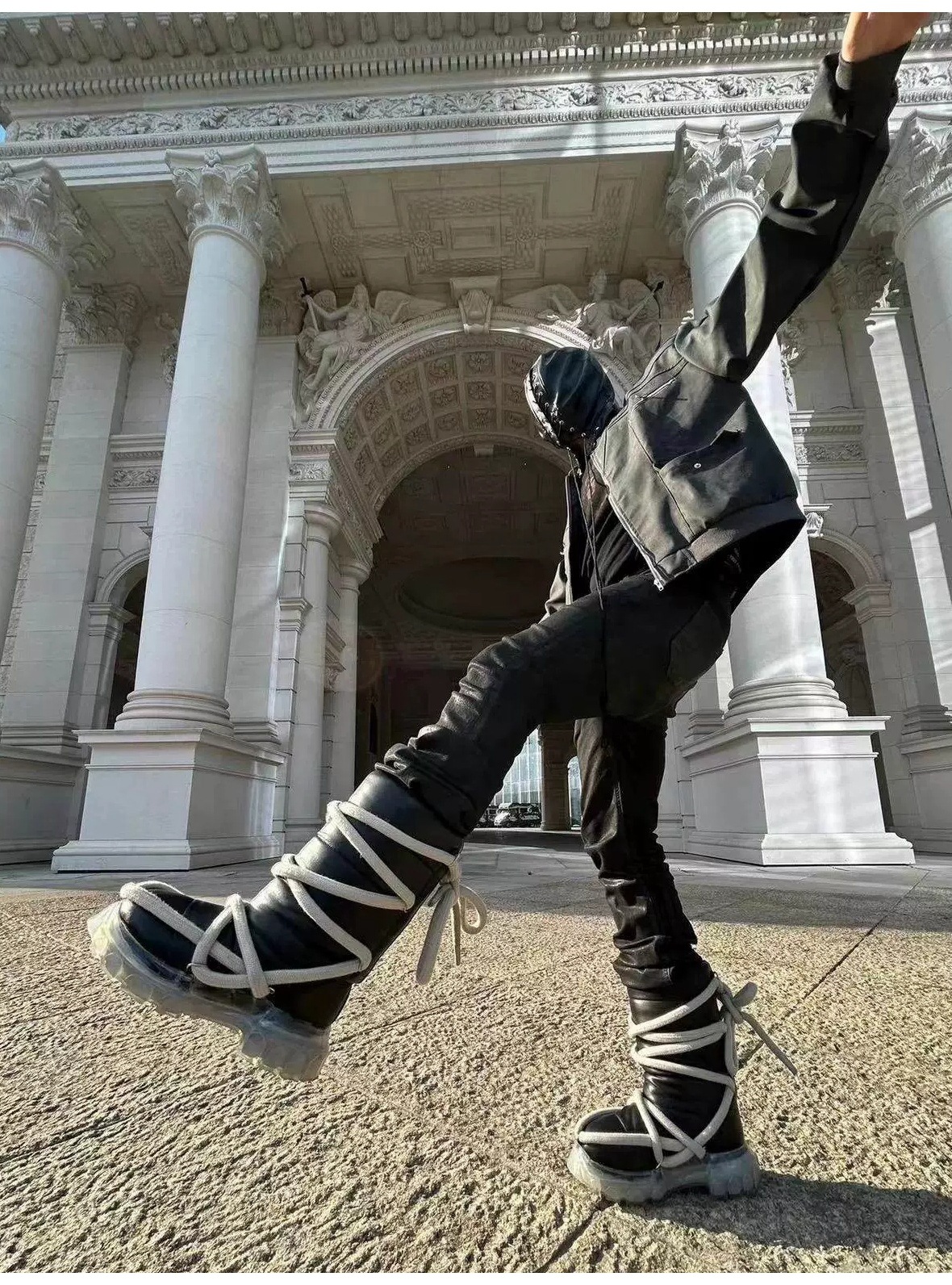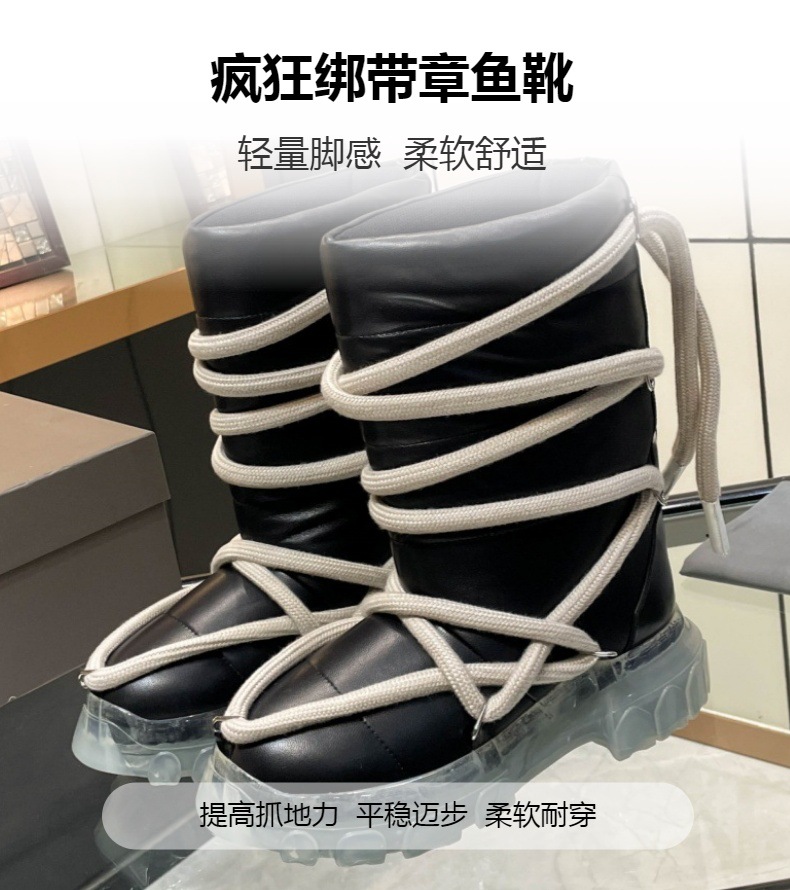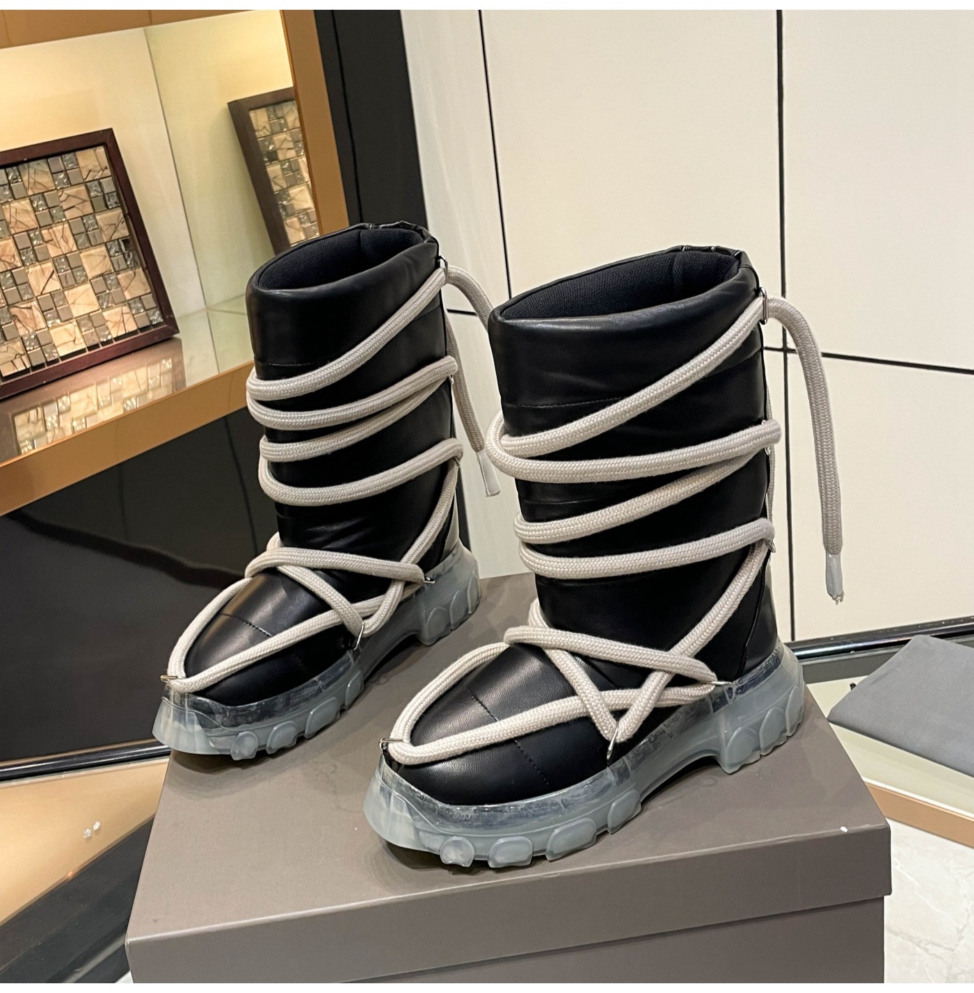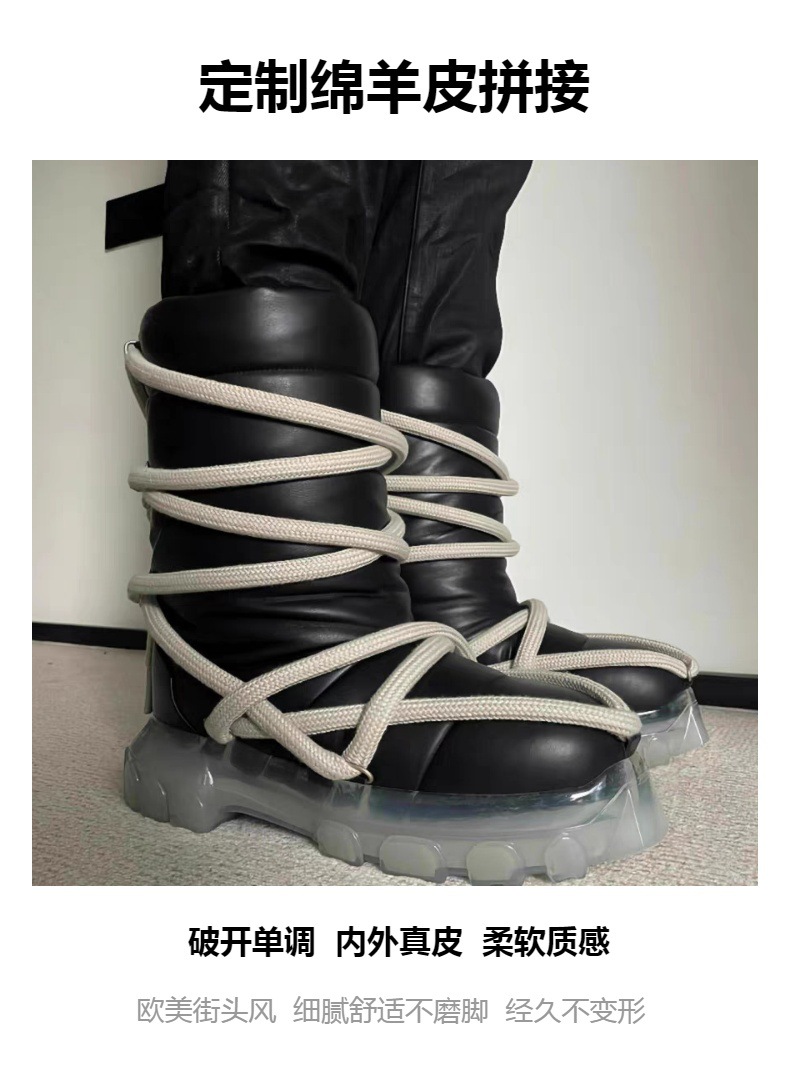 KUNG R 하이 세트 O 커플의 크레이지 스트랩 스노우 부츠 라운드 발가락 양가죽 크리스탈 하단 문어 부츠 미드 부츠