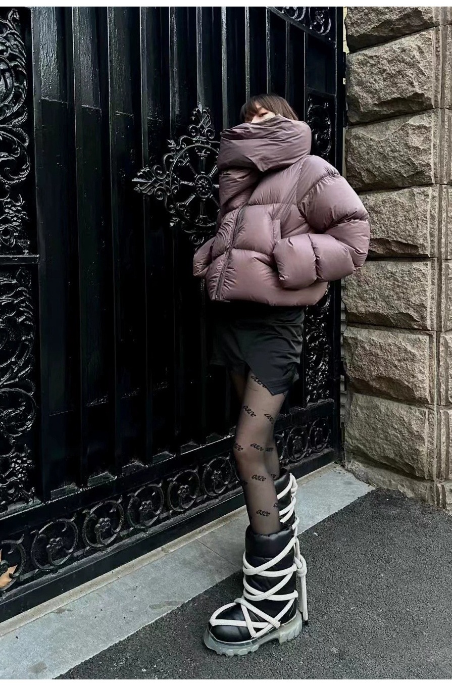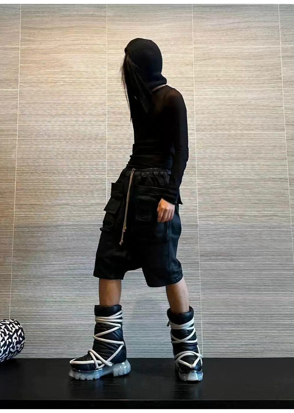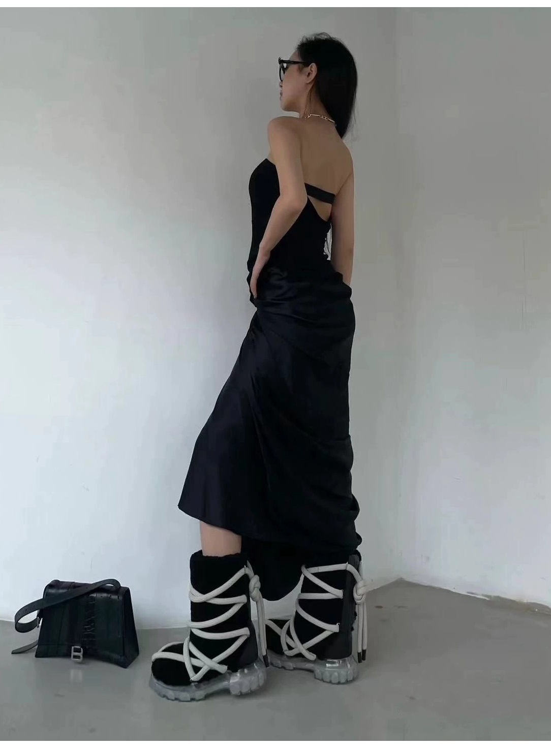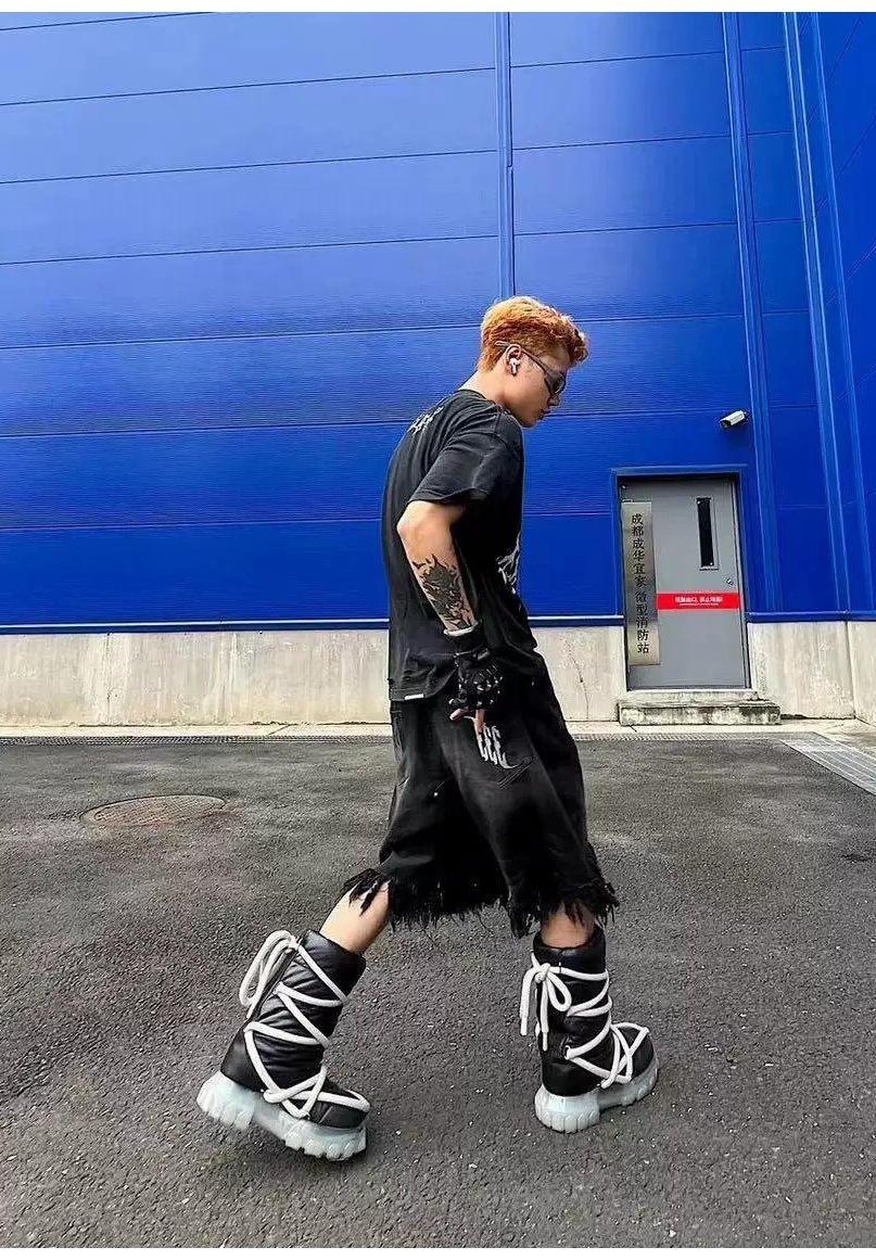 KUNG R 하이 세트 O 커플의 크레이지 스트랩 스노우 부츠 라운드 발가락 양가죽 크리스탈 하단 문어 부츠 미드 부츠