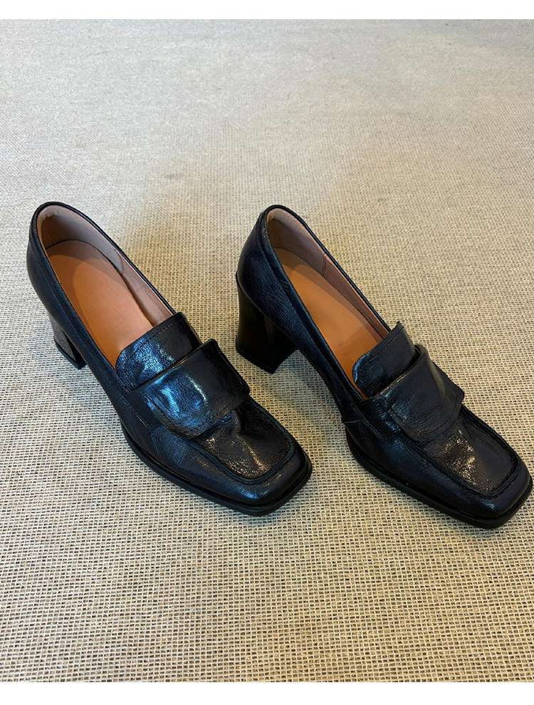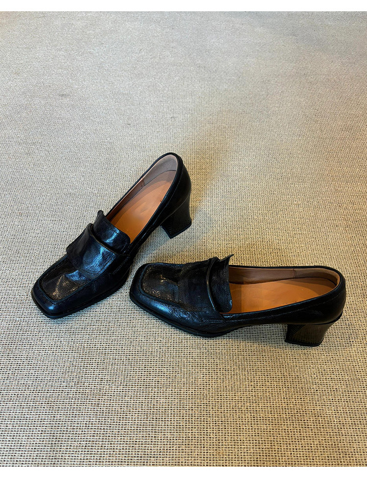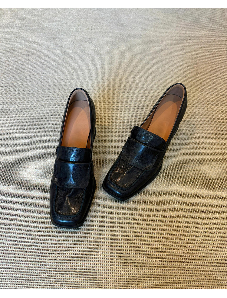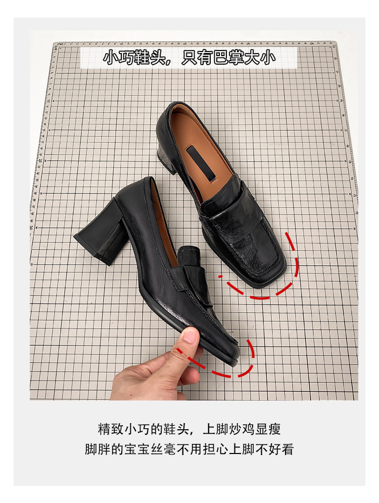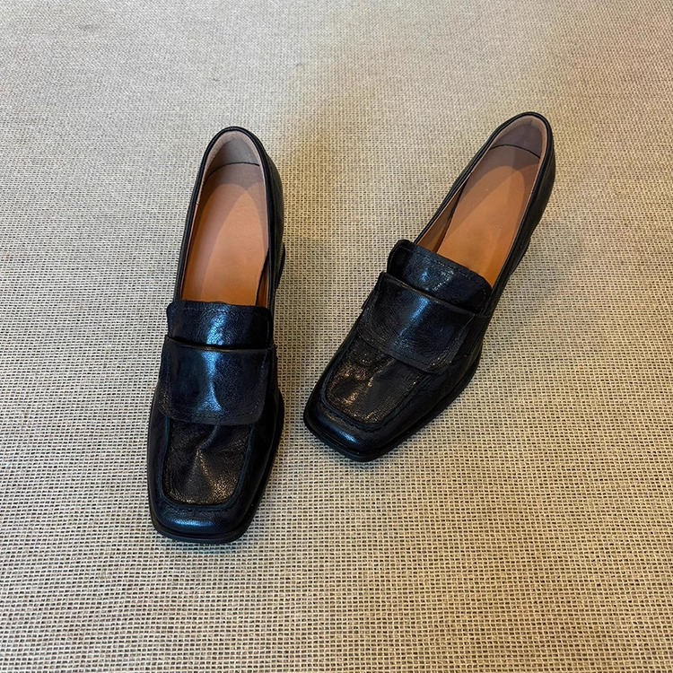 양가죽 버전 ~ 문학 복고풍 가죽 사각 발가락 작은 가죽 신발 여성 통근 하이힐 싱글 레이어 신발 원스텝 두꺼운 힐 로퍼
