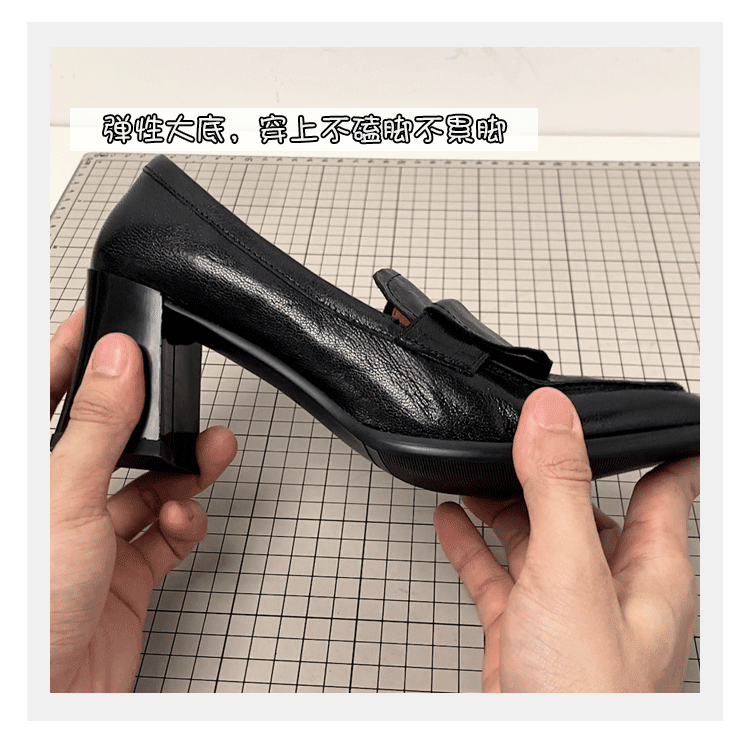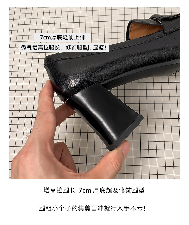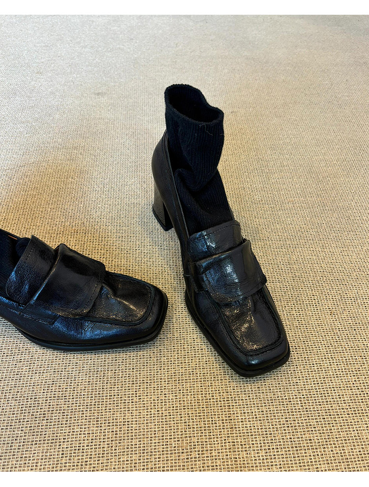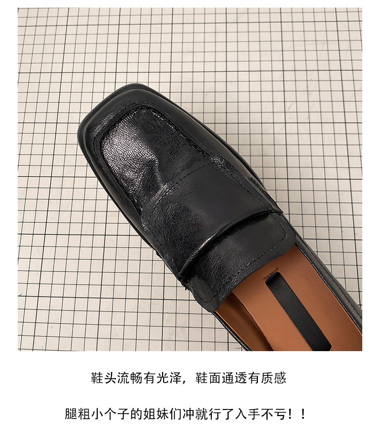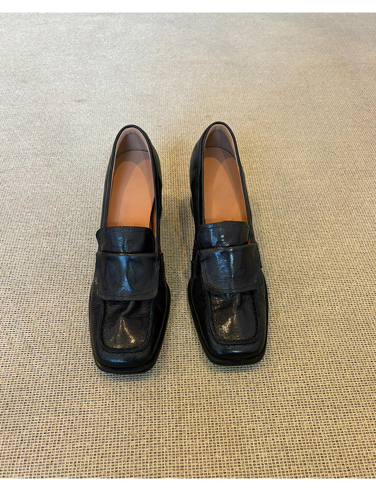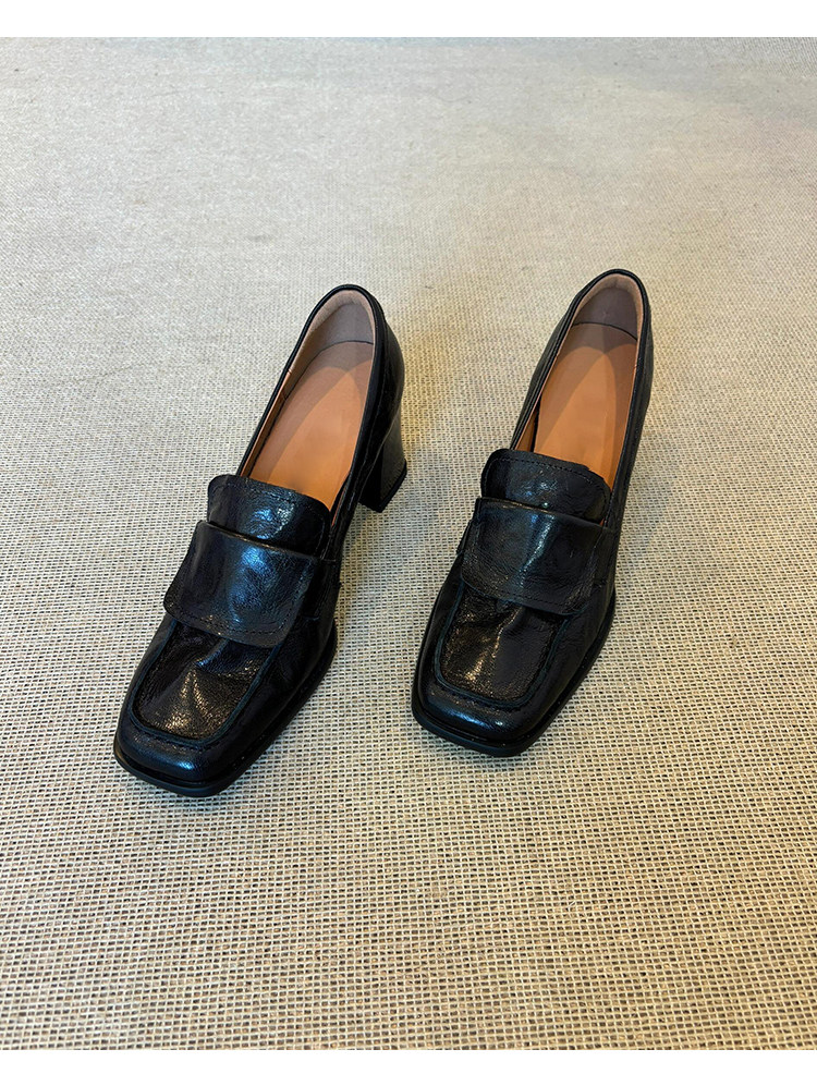 양가죽 버전 ~ 문학 복고풍 가죽 사각 발가락 작은 가죽 신발 여성 통근 하이힐 싱글 레이어 신발 원스텝 두꺼운 힐 로퍼