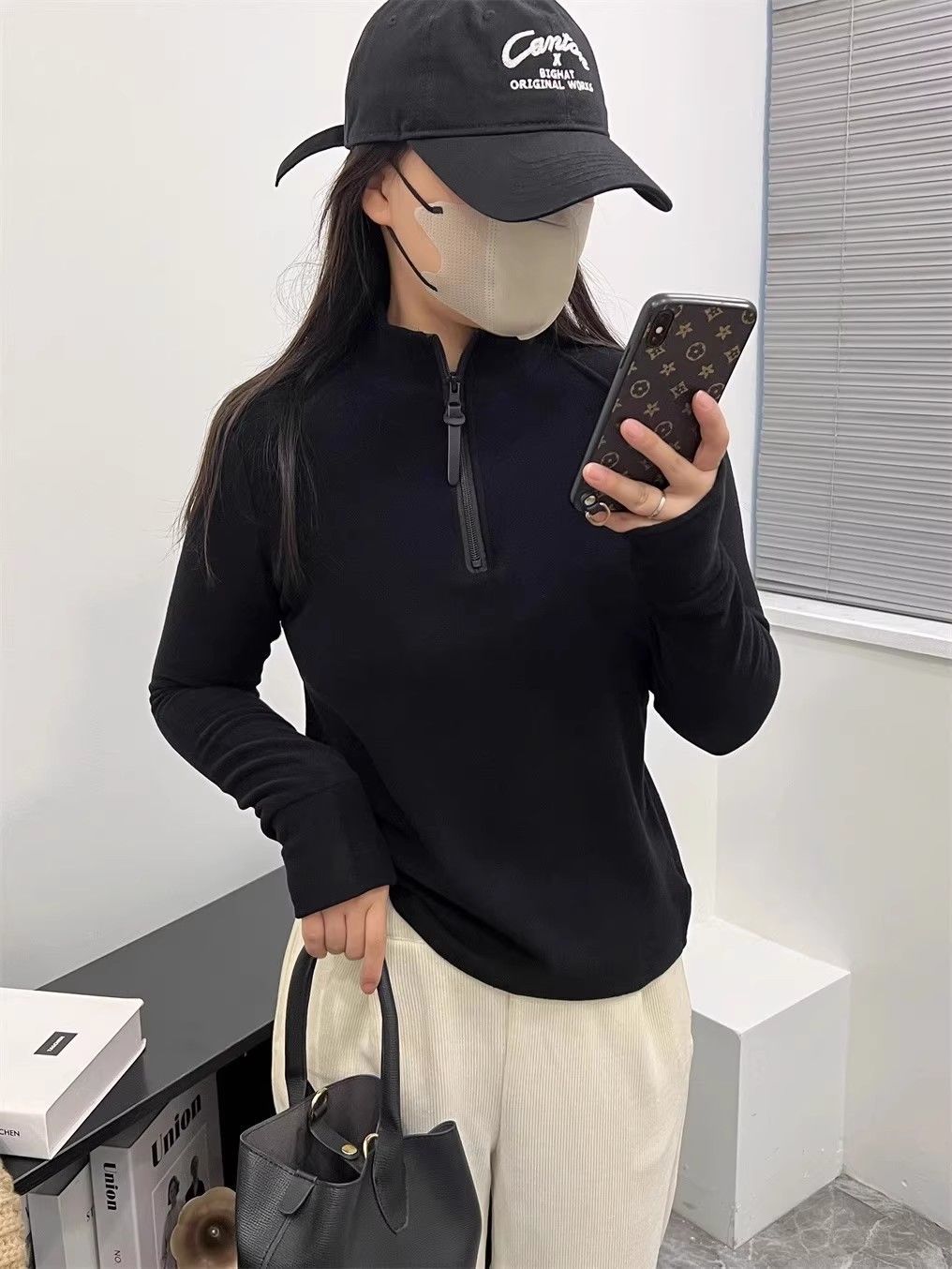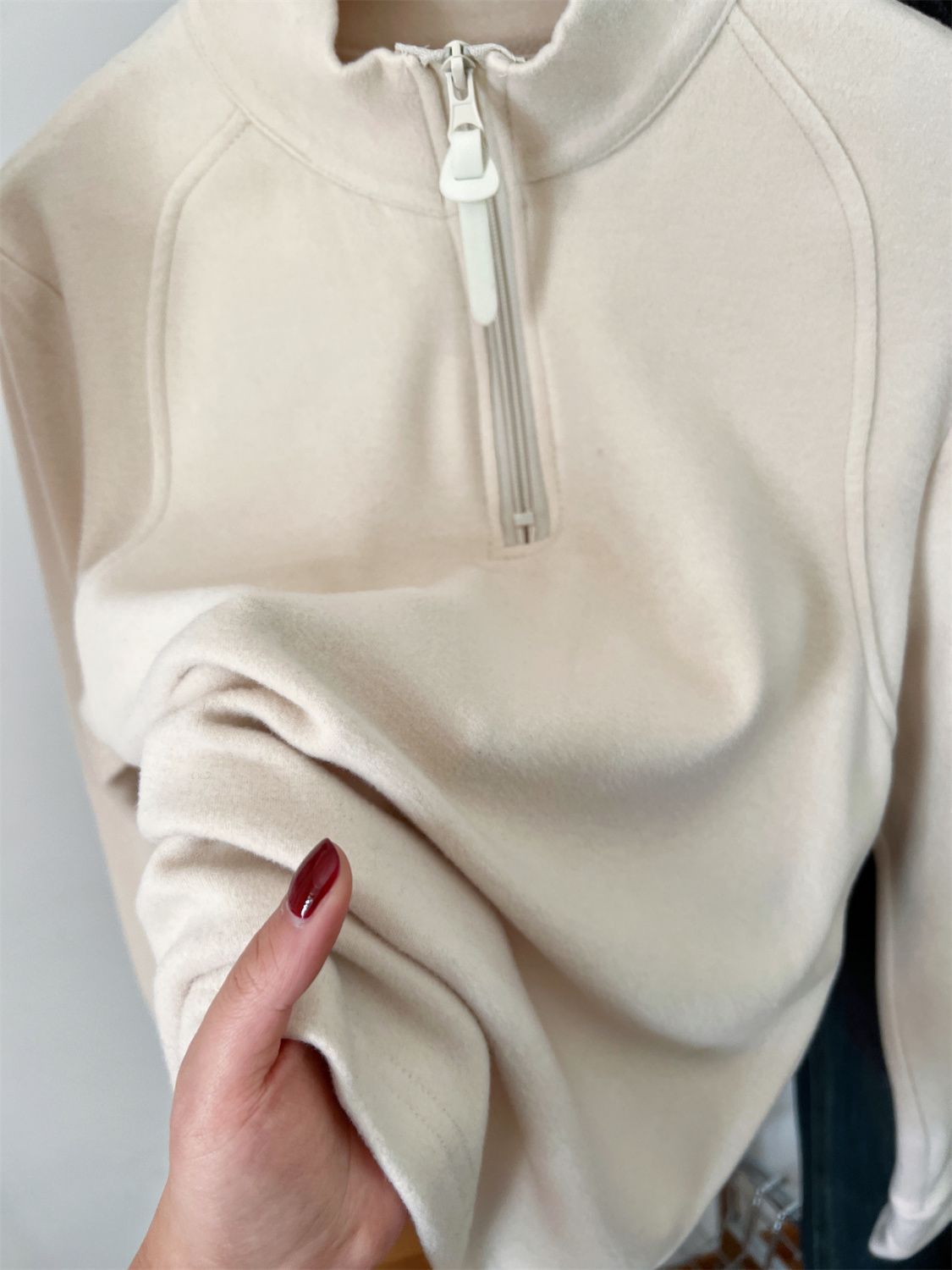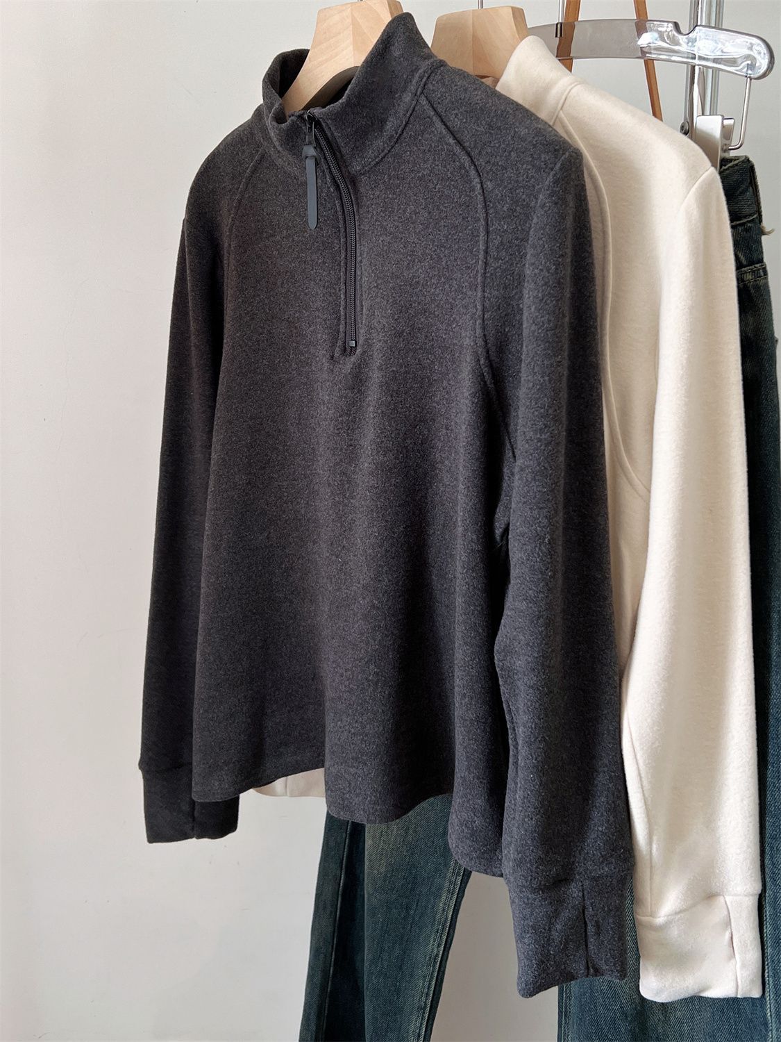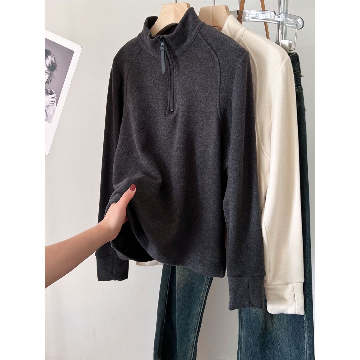 게으른 스타일 수직 칼라 반 지퍼 벨벳 내부 티셔츠 여성용 겨울 느슨한 캐주얼 고기 커버 긴팔 벨벳 탑 트렌디