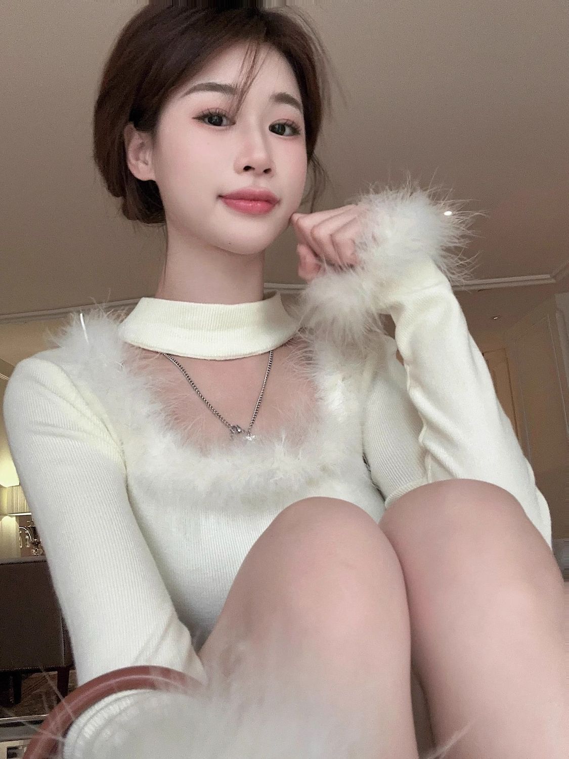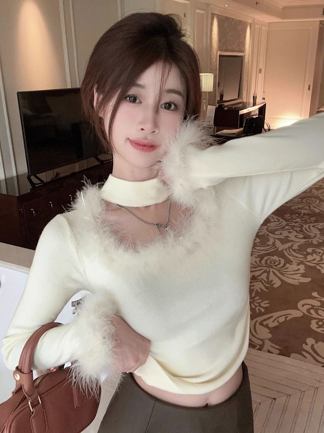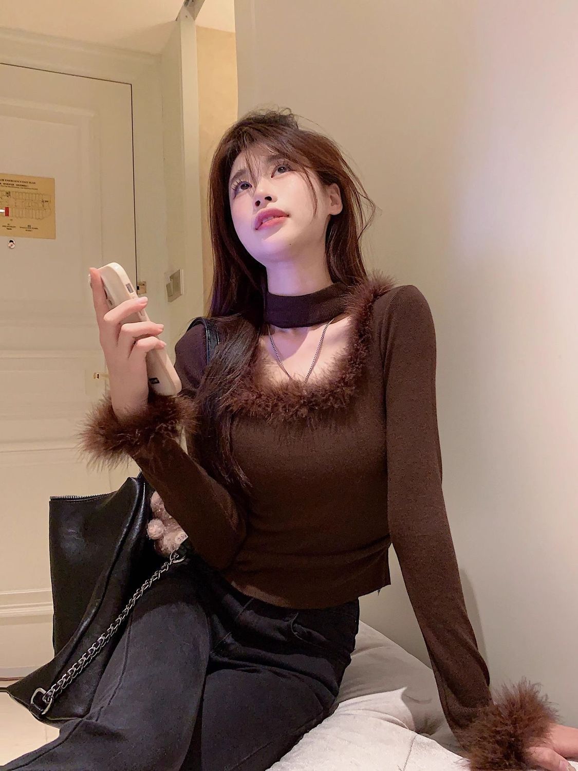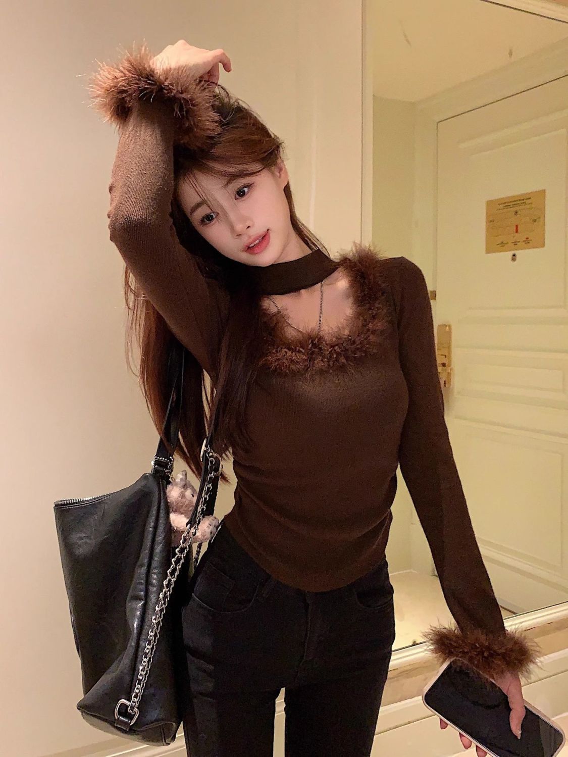 스파이스 걸 스퀘어 칼라 슈퍼 소프트 왁스 벨벳 여성의 가을과 겨울 새로운 슬림 핏 내베이스 짧은 다크 브라운 마오 마오 탑