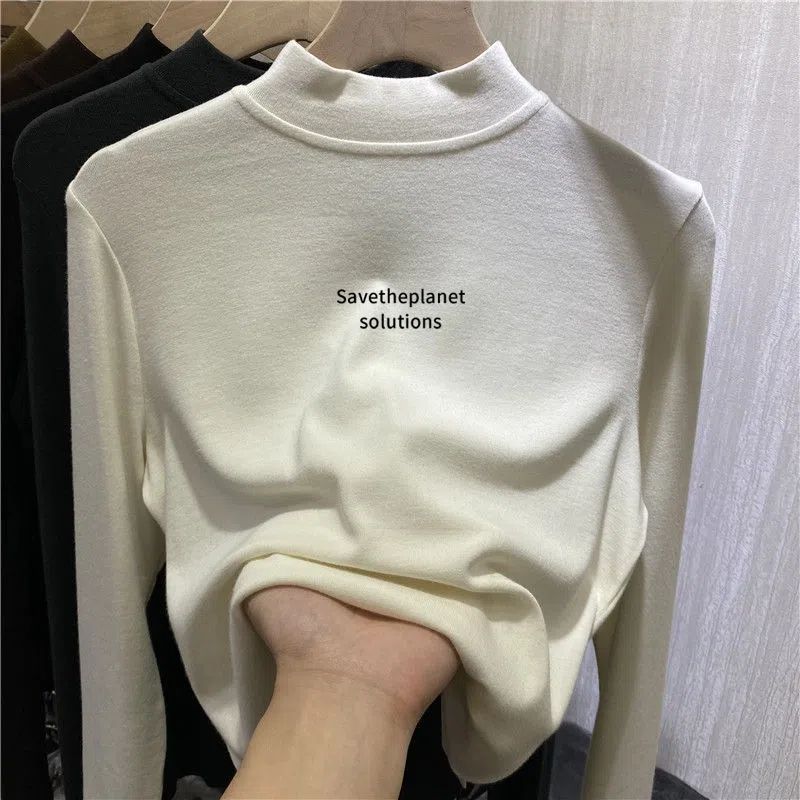 양면 벨벳 세미 하이 칼라베이스 셔츠 여성의 가을과 겨울 새로운 두꺼운 따뜻한 긴 소매 샌딩 티셔츠 내부 탑