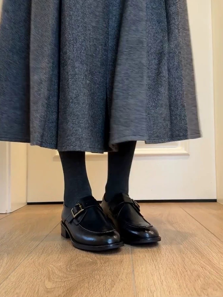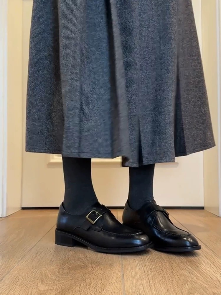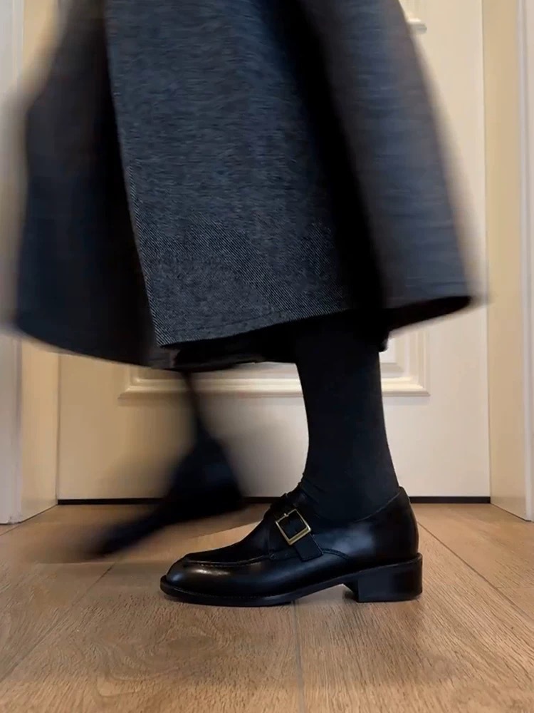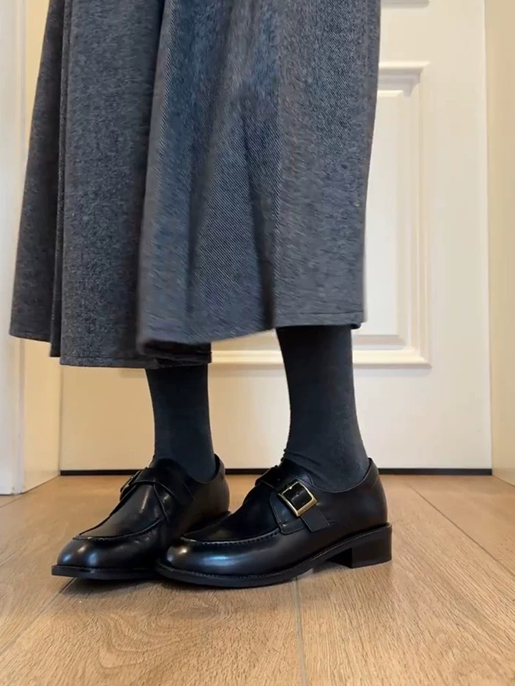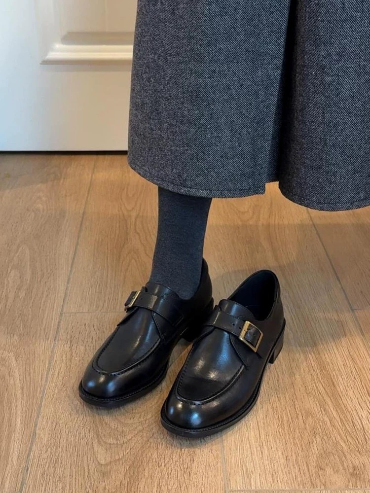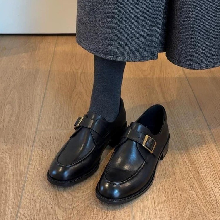 Cowhide Edition ~ Commuter Shoes 여성 벨트 버클 정품 가죽 로퍼 여성 레트로 스타일 슬리밍 로우 힐 조커 신발