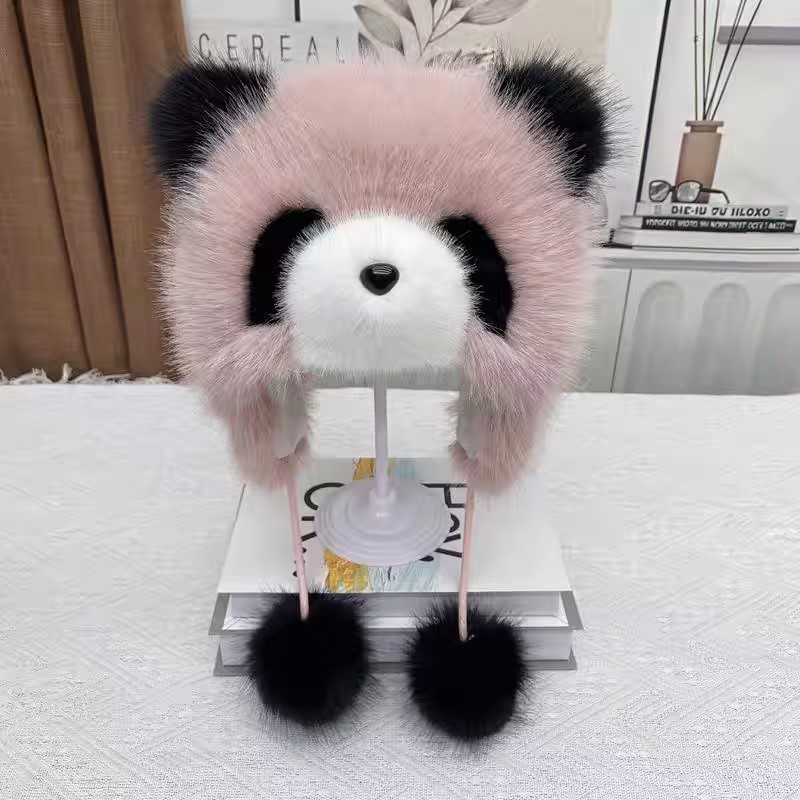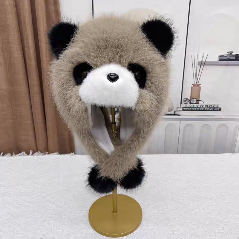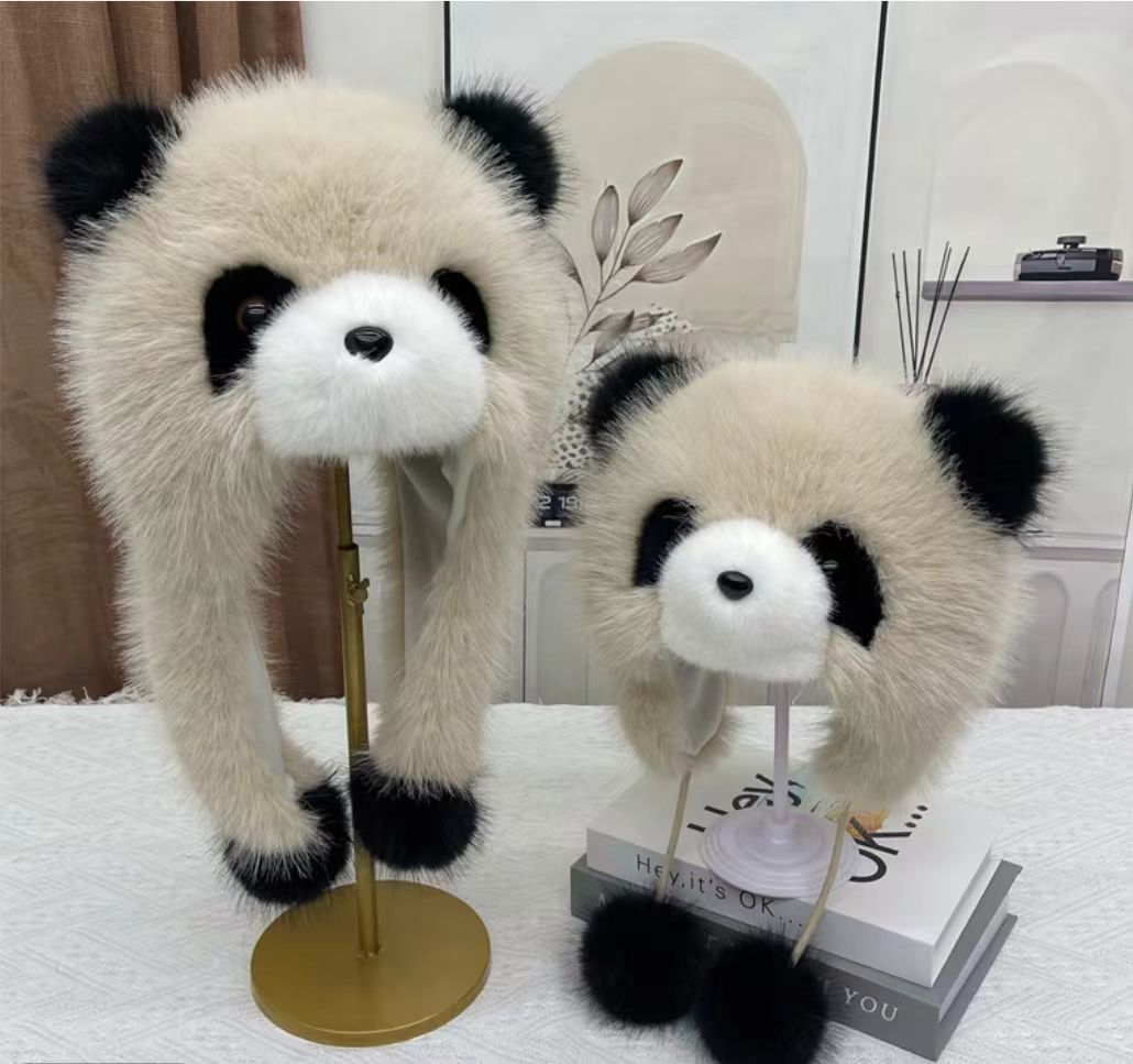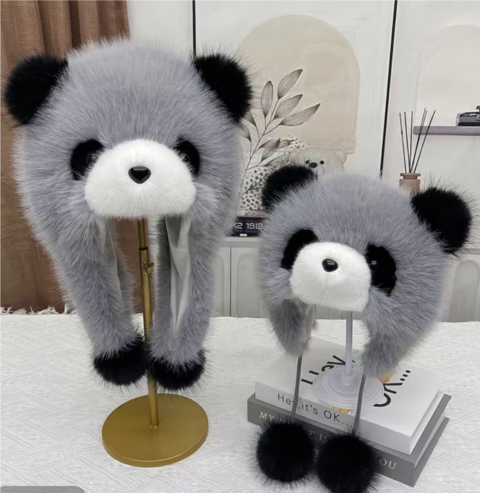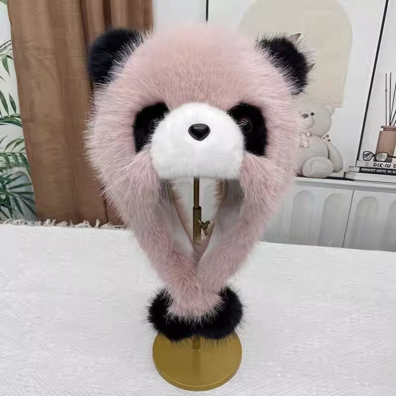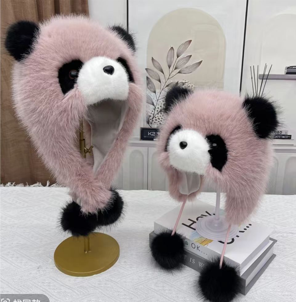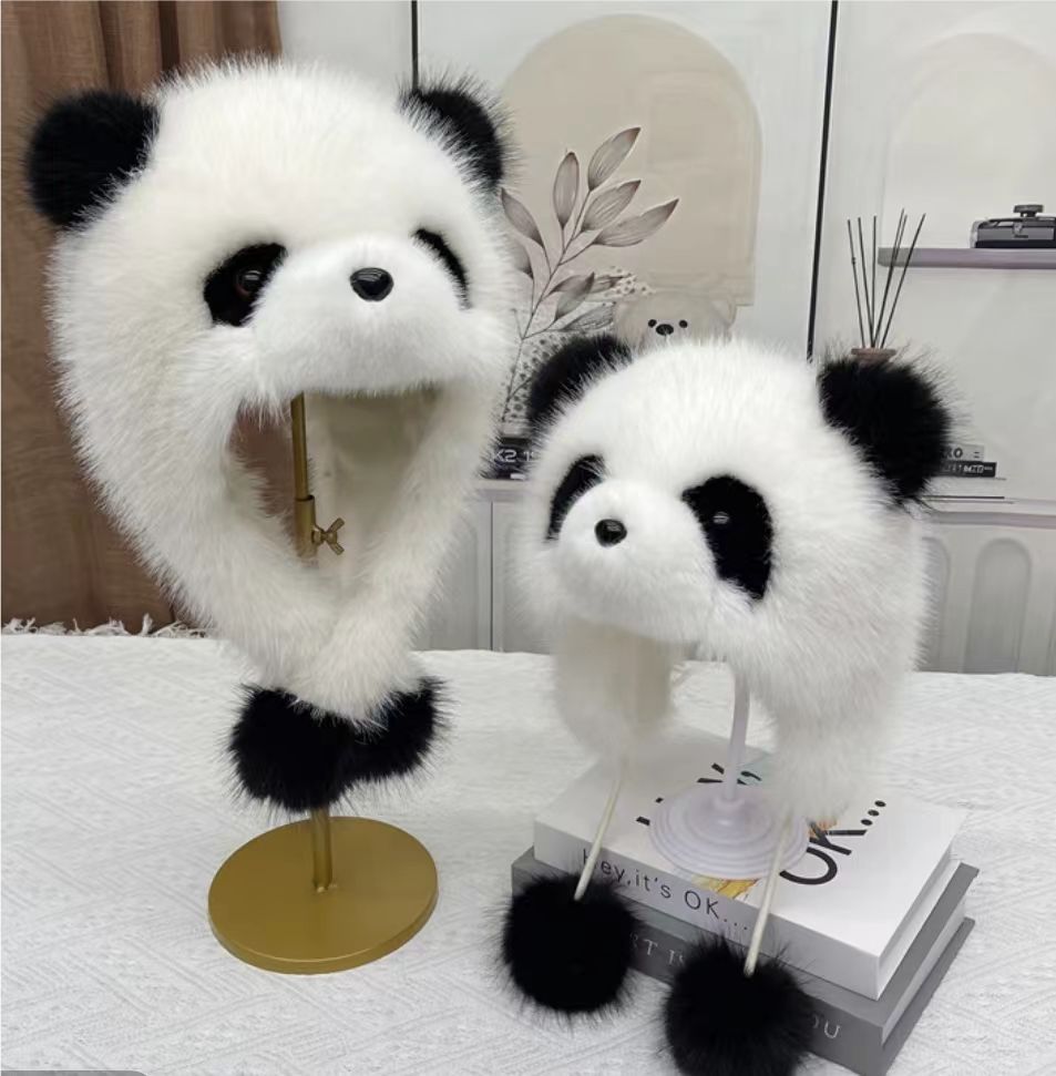 귀여운 팬더 모자 한 두 조각 세트 쇼 얼굴 작은 소녀 야외 겨울 푹신한 모자 만화 귀 보호자 Lei Feng 모자