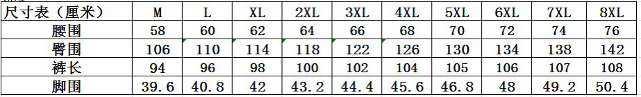 | 颜色 | 黑色 | 尺码 | M, L, XL, 2XL, 3XL, 4XL, 5XL, 6XL, 7XL, 8XL |