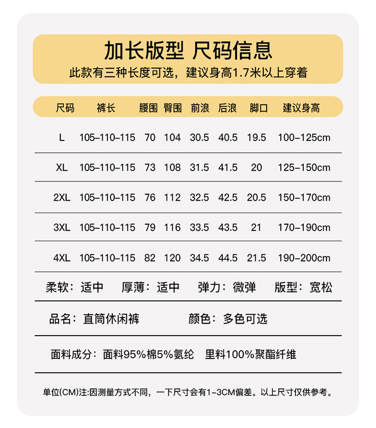 | 颜色 | 黑色【裤长105CM】, 深灰【裤长 105CM】, 深蓝【裤长105CM】, 灰色【裤长105CM】, 浅灰【裤长105CM】, 黑色【裤长110CM】, 深灰【裤长110CM】, 深兰【裤长110CM】, 深灰【裤长 110CM】, 灰色【裤长110CM】, 浅灰【裤长 110CM】, 黑色【裤长115CM】, 深灰【裤长115CM】, 深兰【裤长115CM】, 灰色【裤长115CM】, 浅灰【裤长115CM】, 黑色加绒加厚【裤长105CM】, 深灰加绒加厚【105CM】, 深兰加绒加厚【105CM】, 浅灰加绒加厚【105CM】, 黑色加绒加厚【裤长110CM】, 深灰加绒加厚【110CM】, 深兰加绒加厚【110CM】, 浅灰加绒加厚【110CM】, 黑色加绒加厚【115CM】, 深灰加绒加厚【115CM】, 深兰加入加厚【115CM】, 浅灰加绒加厚【115CM】 | 尺码 | L【100-125斤】, XL【125-150斤】, XXL【150-170斤】, XXXL【170-190斤】, 4XL【190-210斤】 |