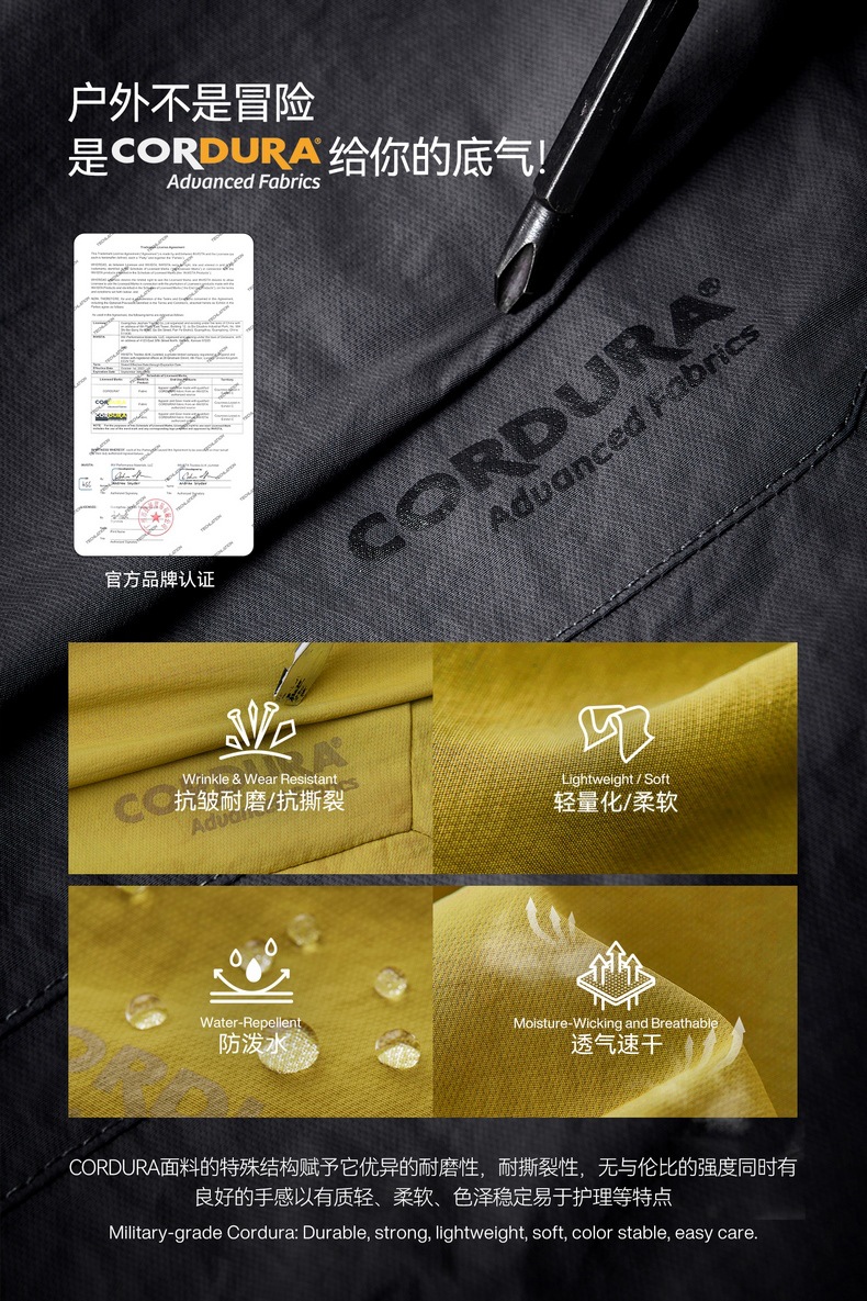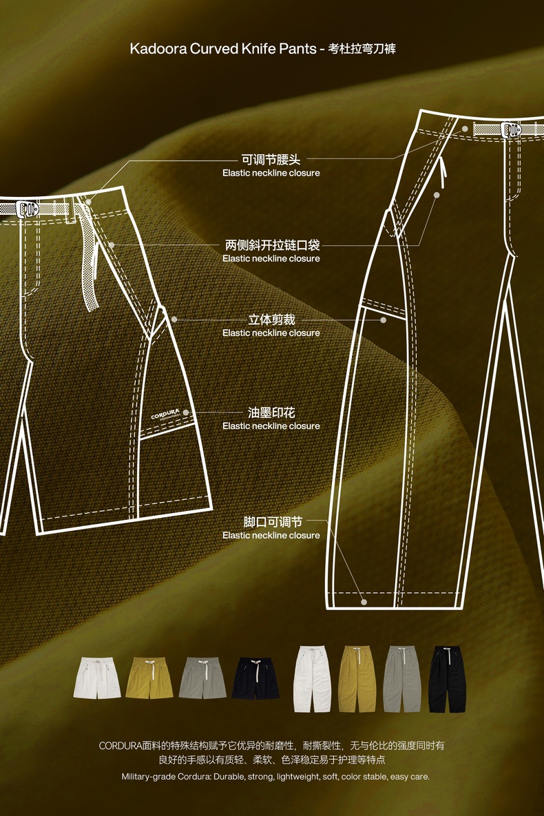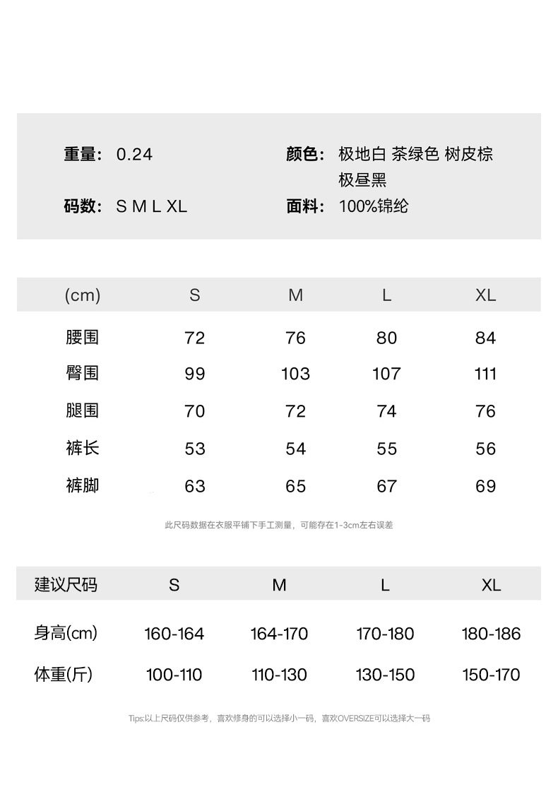 | 面料 | 尼龙面料 | 颜色 | 极地白-长裤款, 茶绿色-长裤款, 树皮棕-长裤款, 极昼黑-长裤款, 极地白-短裤款, 茶绿色-短裤款, 树皮棕-短裤款, 极昼黑-短裤款, 极地白-短袖, 茶绿色-短袖, 树皮棕-短袖, 极昼黑-短袖, 极地白-直筒短裤款, 极昼黑-直筒短裤款, 定制 |