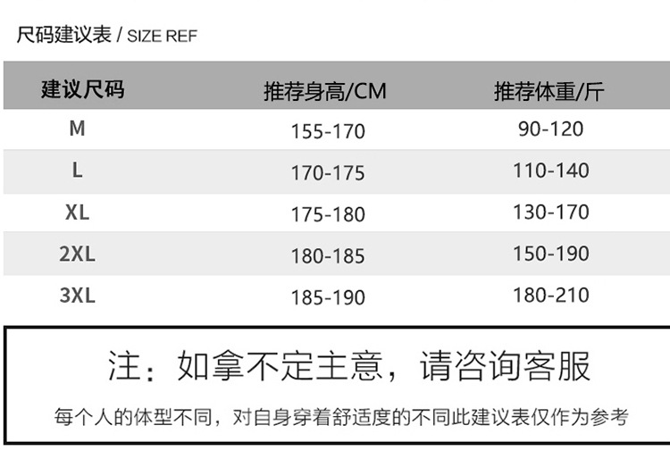 | 尺码 | M(建议90-120斤), L(建议110-140), XL(建议130-170斤), 2XL(建议150-190斤), 3XL(建议180-210斤) | 是否跨境出口专供货源 | 否 |