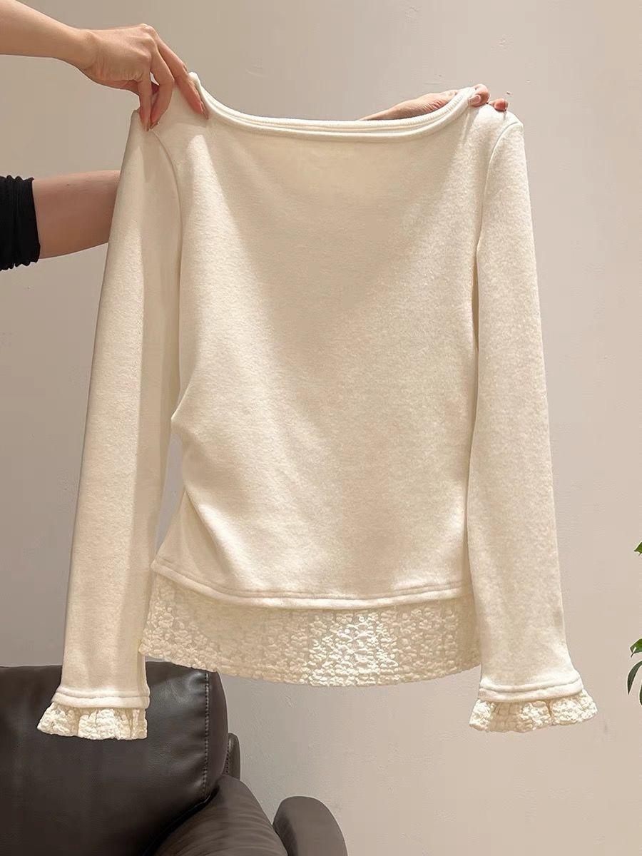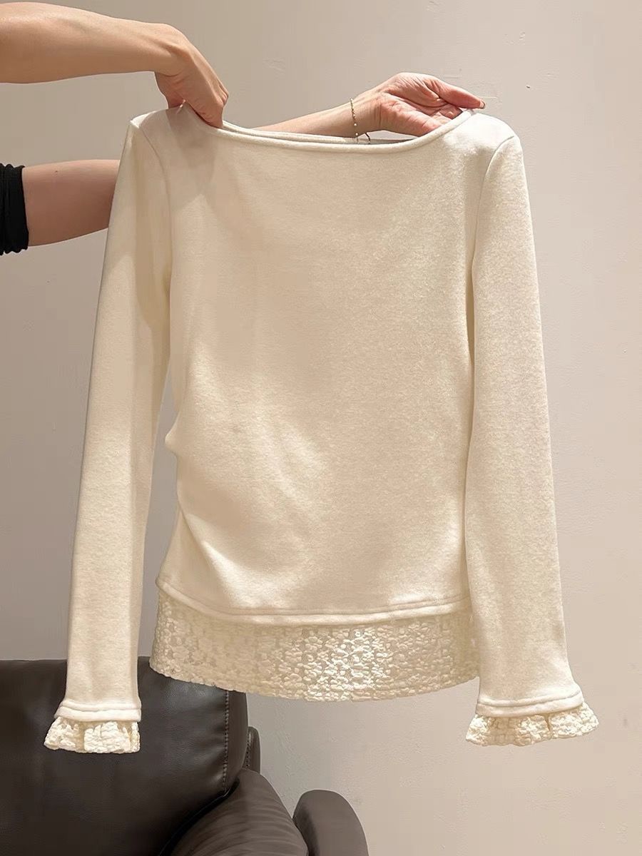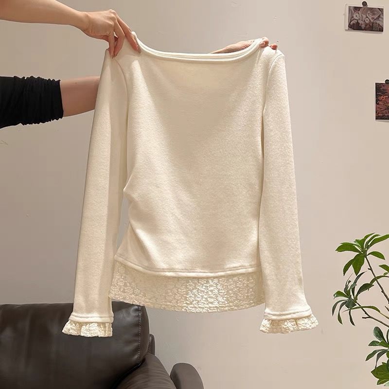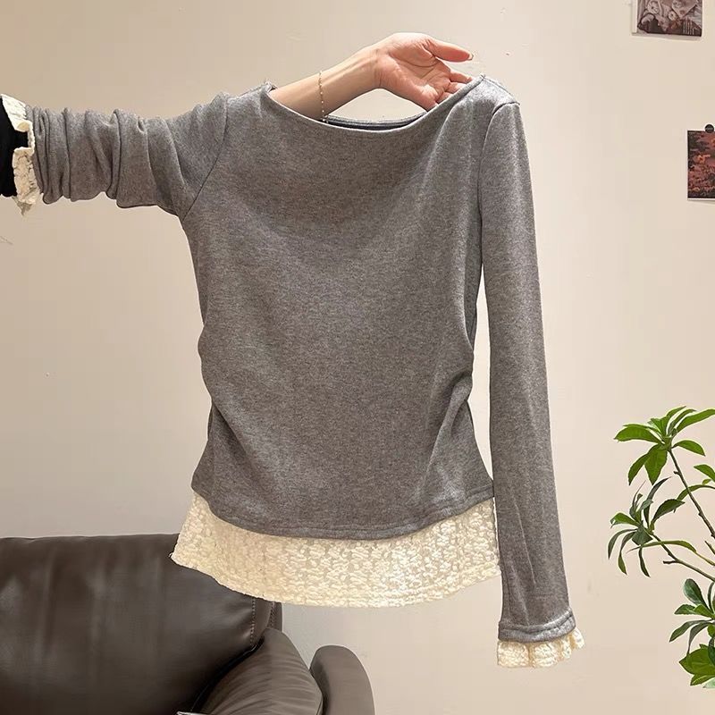 한 어깨 긴팔 내면베이스 셔츠 여성의 이른 봄 새로운 주름 허리 레이스 머리 디자인 감각 작은 탑