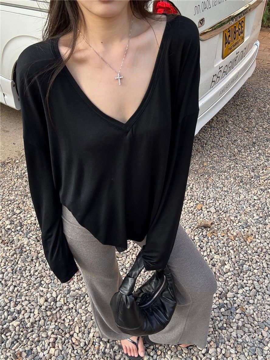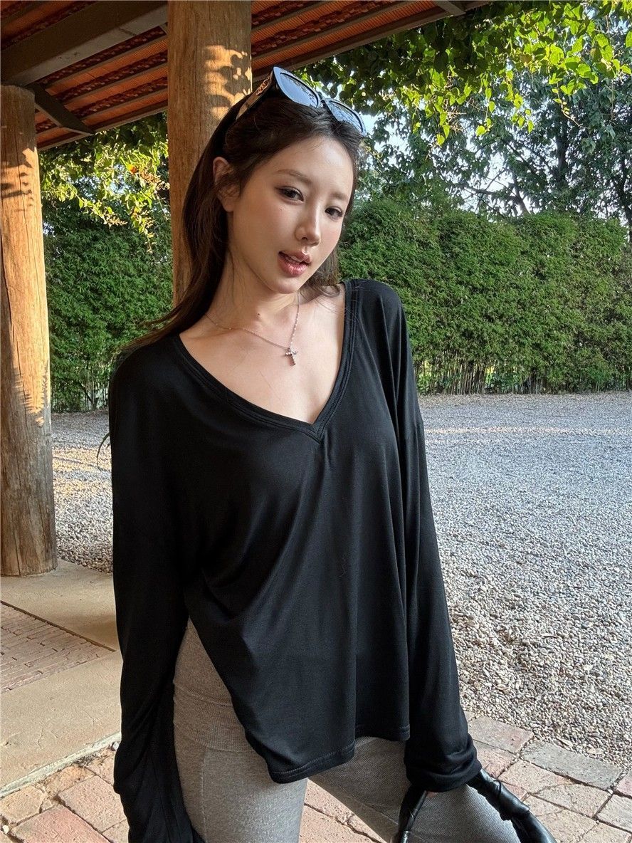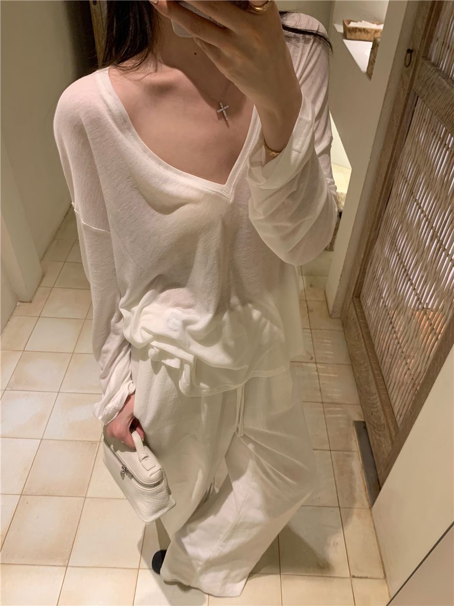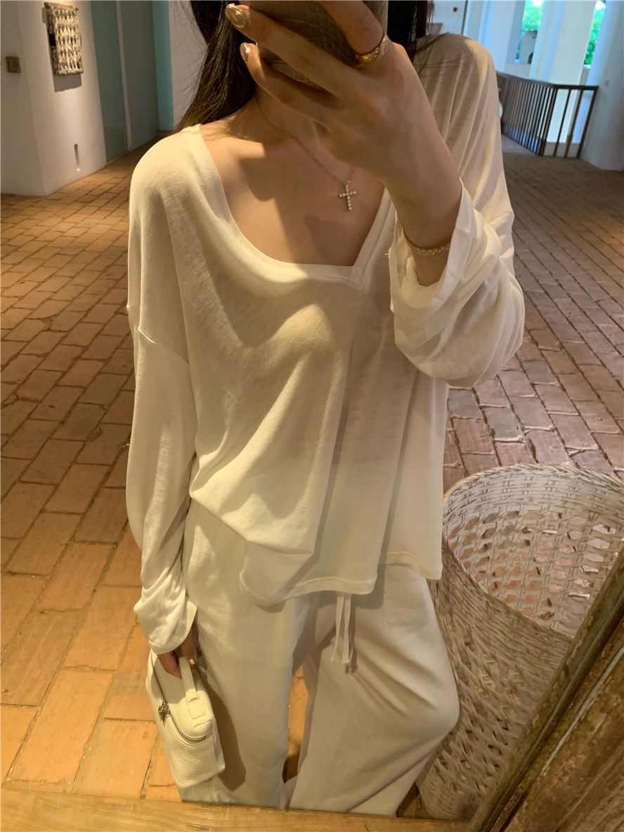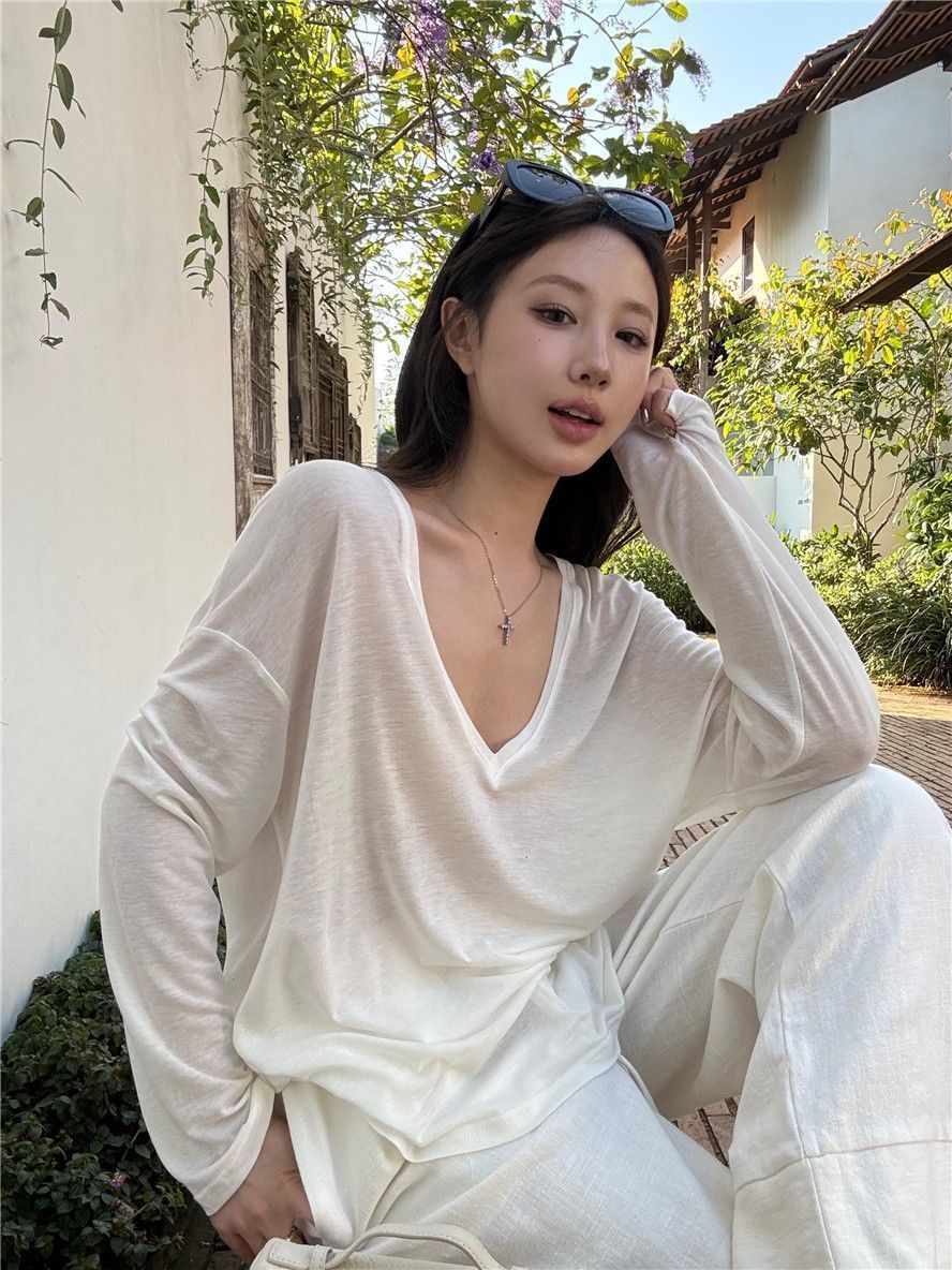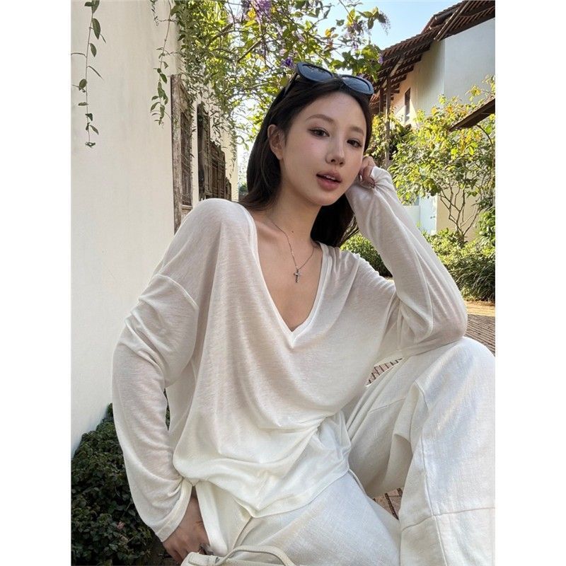 게으른 스타일 흰색 긴팔 티셔츠 여성 봄과 여름 새로운 디자인 센스 V 넥 루즈 스킨 스크린 베이스 블라우스 탑
