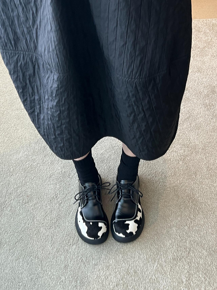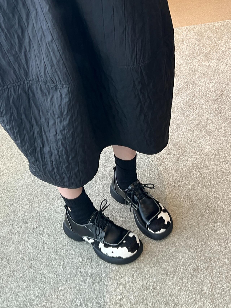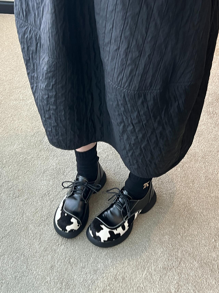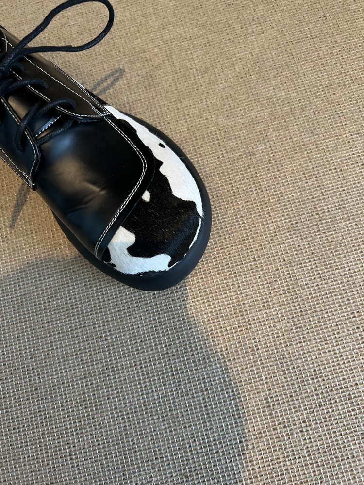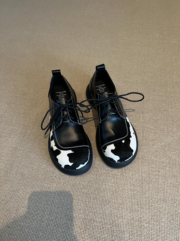 양가죽 버전 ~ 큰 머리 작은 가죽 신발 여성용 복고풍 암소 스티칭 두꺼운 밑창 로퍼 레이스 업 두꺼운 발 뒤꿈치 깊은 입 싱글 레이어 신발