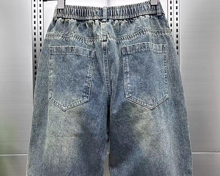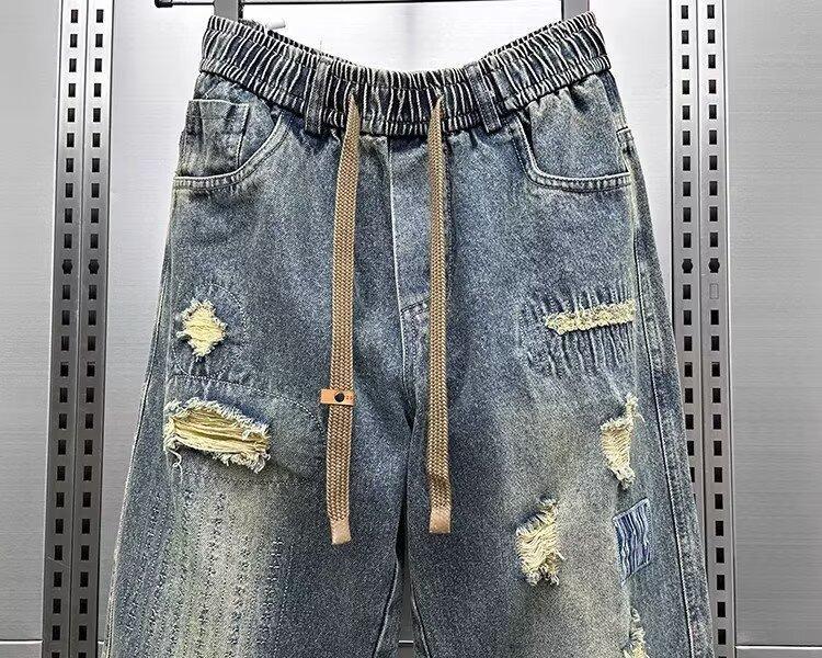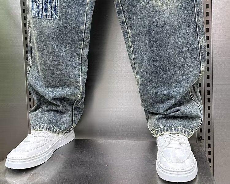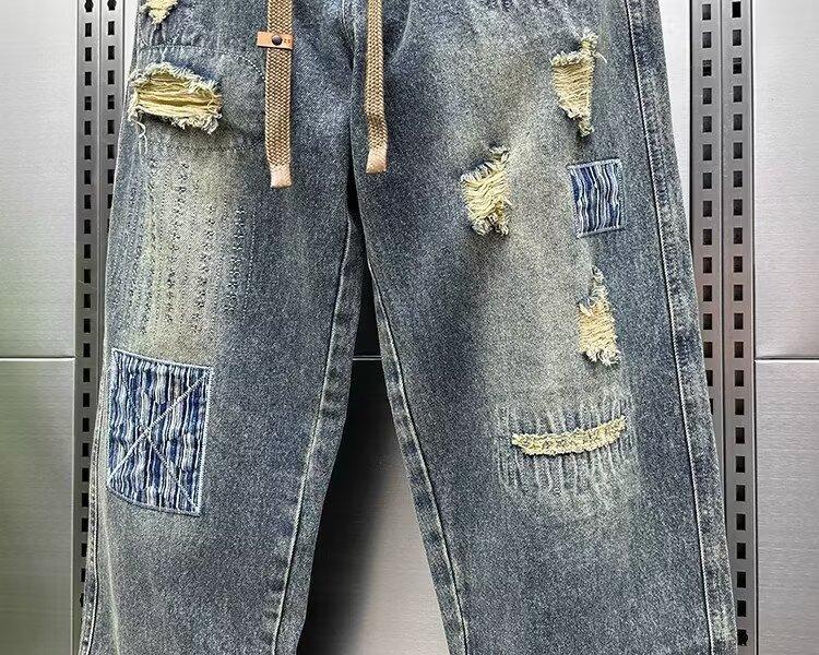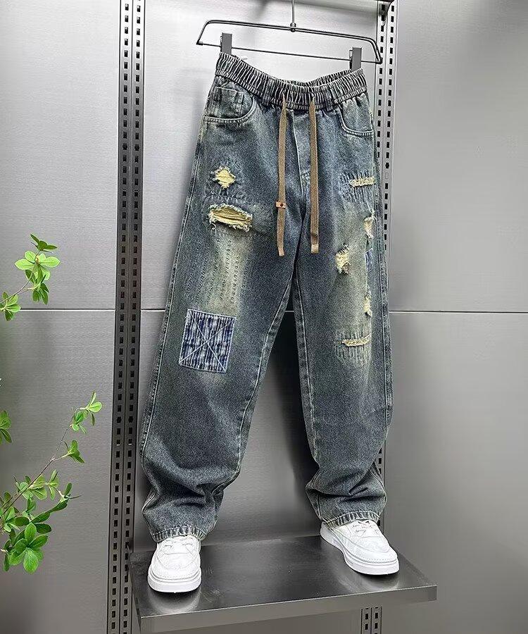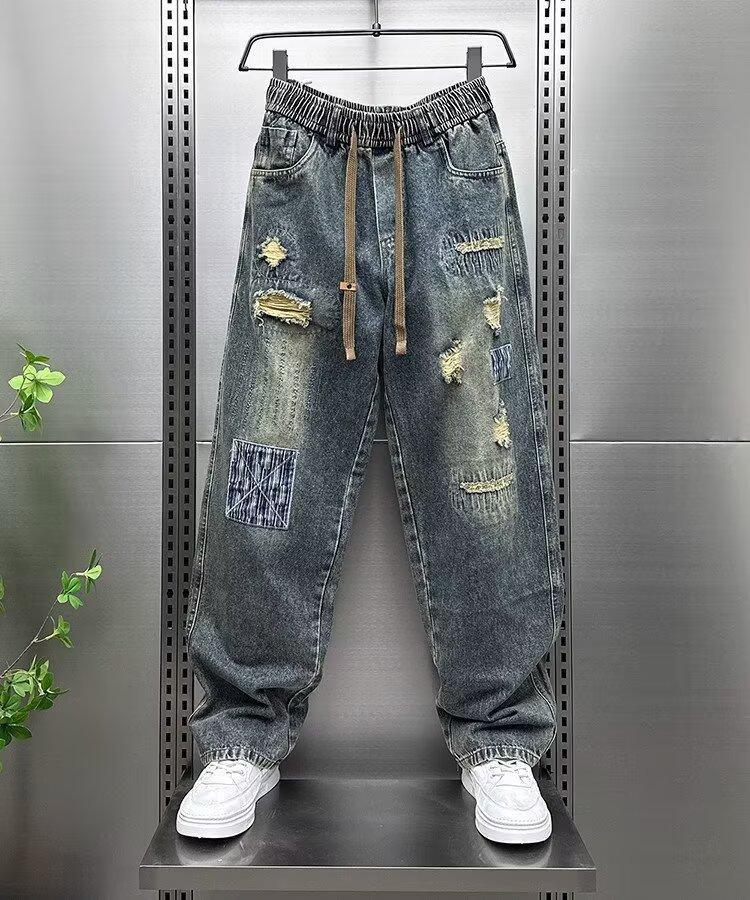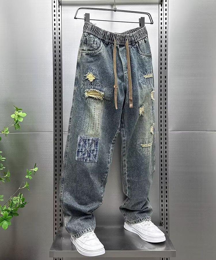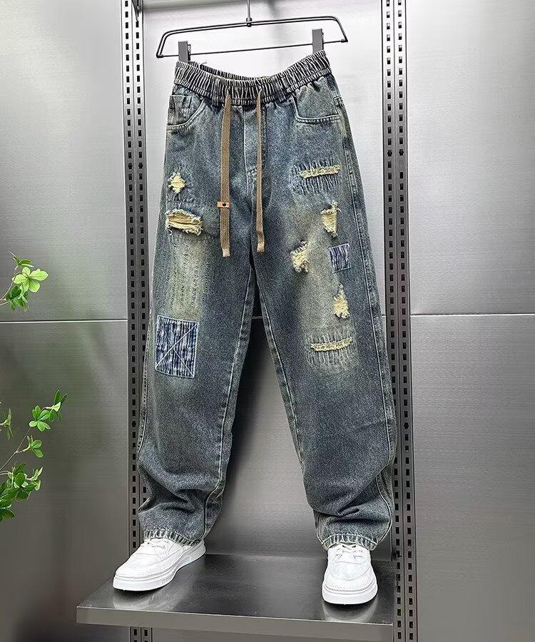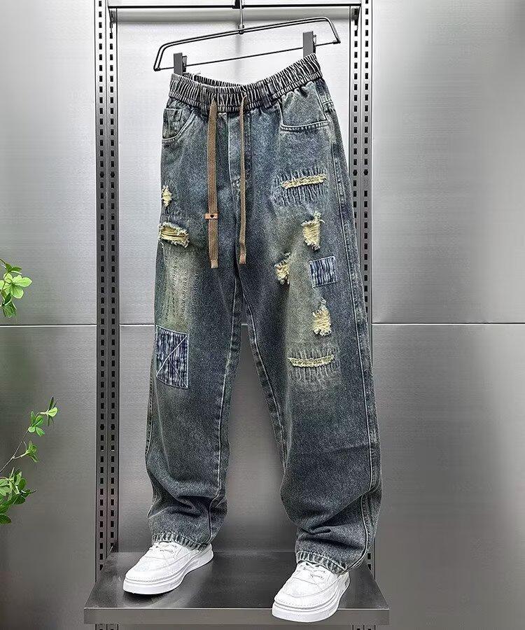 가을 트렌드의 남성을 위한 트렌디한 아메리칸 디자인 찢어진 청바지, 멋스러운 레트로 패치 패치 루즈 스트레이트 팬츠