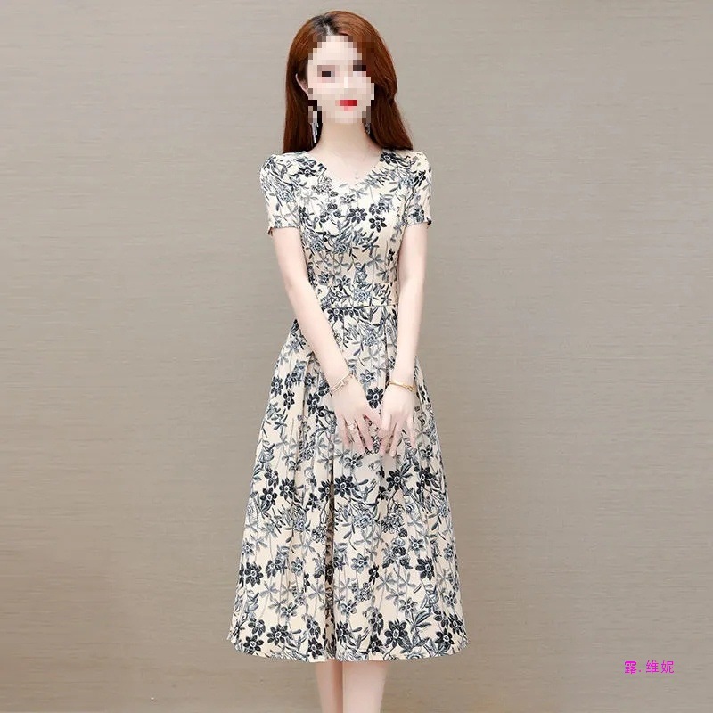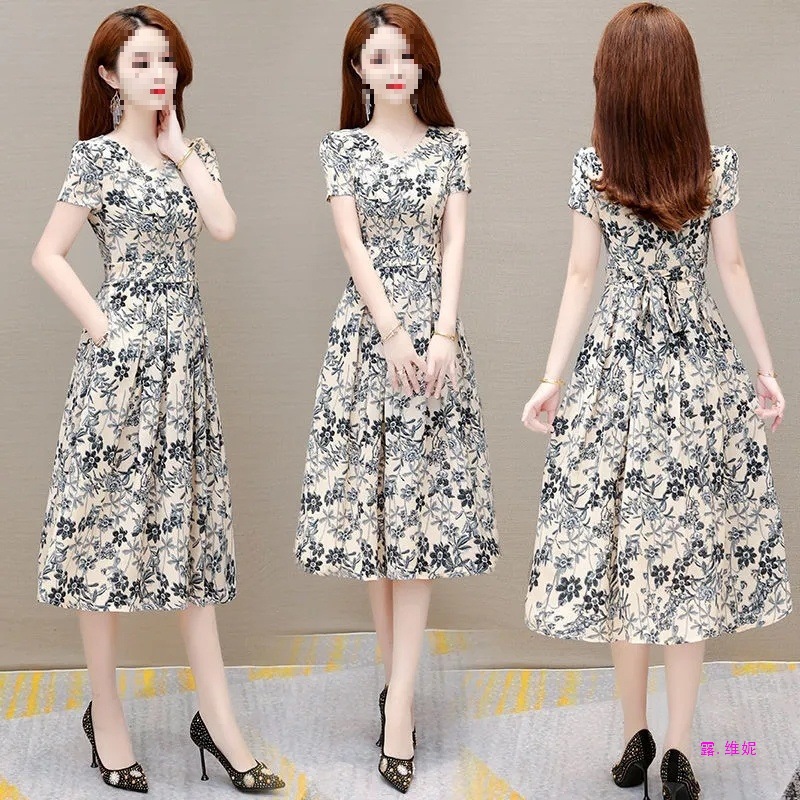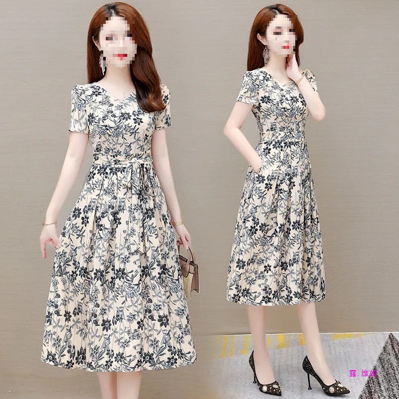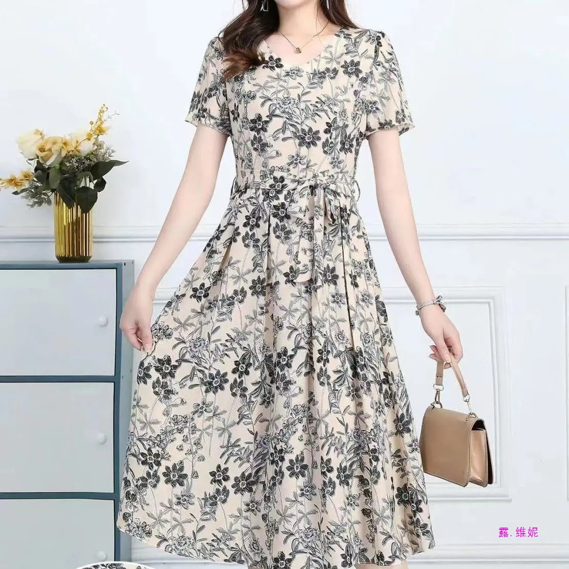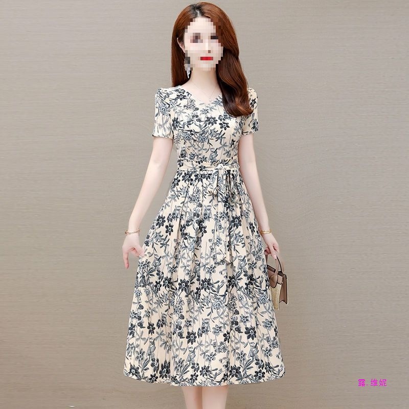 아이스 실크 꽃 칼라 레이스 업 반팔 중간 길이 드레스 여성 여름 새로운 슬림 홀 코튼 캐주얼 스커트