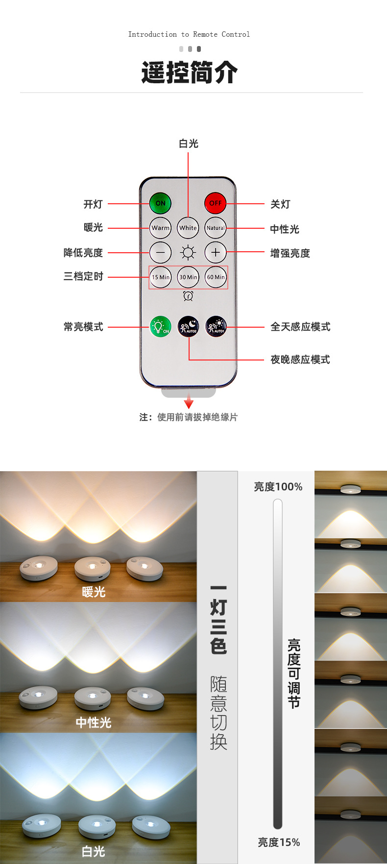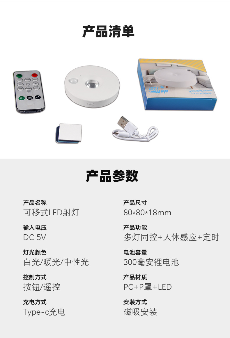 | 开关类型 | 按钮式 | 灯光颜色 | 白色无线遥控小射灯(人体感应+三色变光)不含遥控, 红外遥控器 |