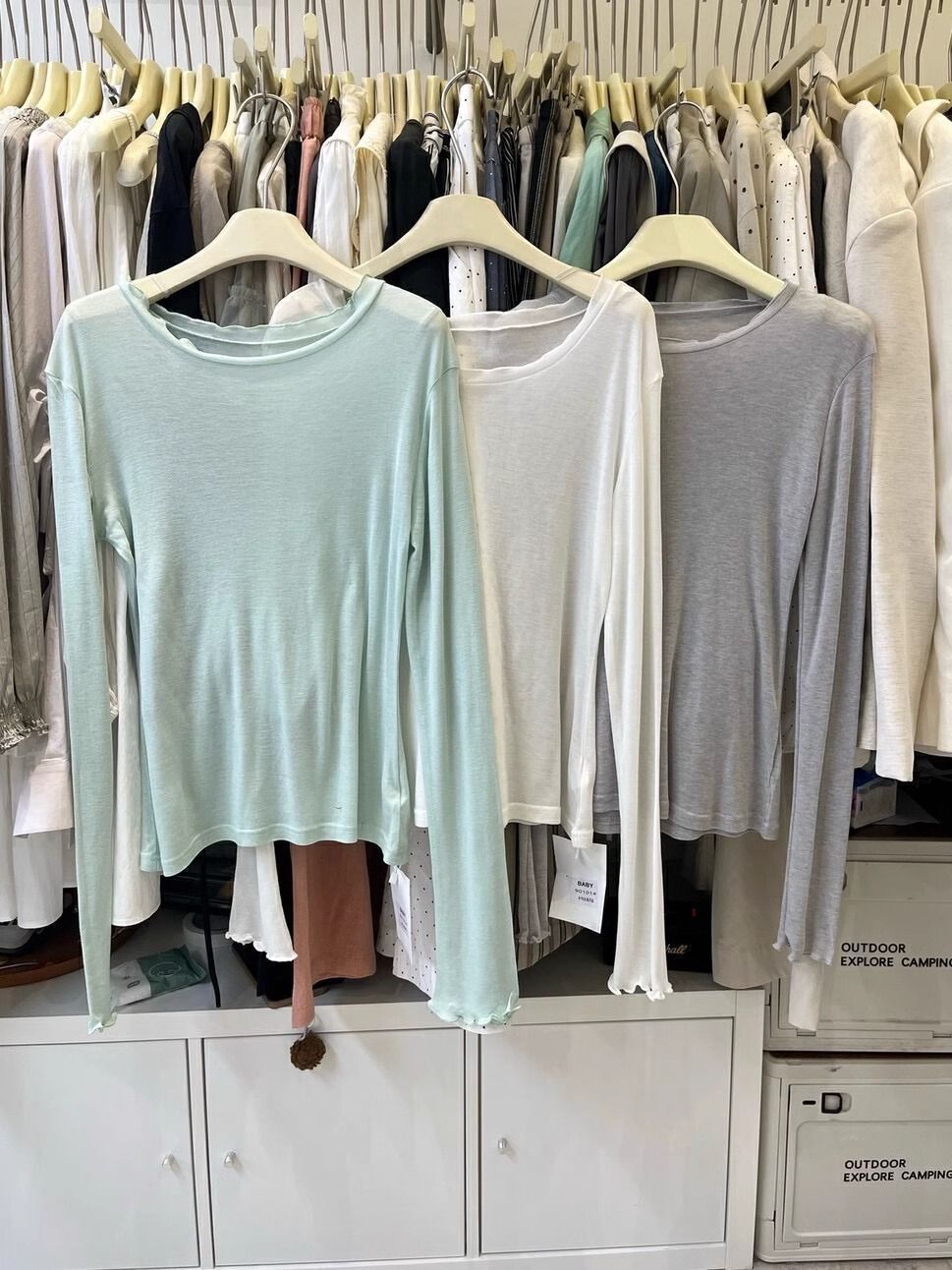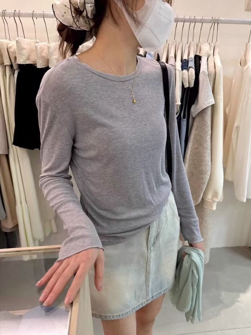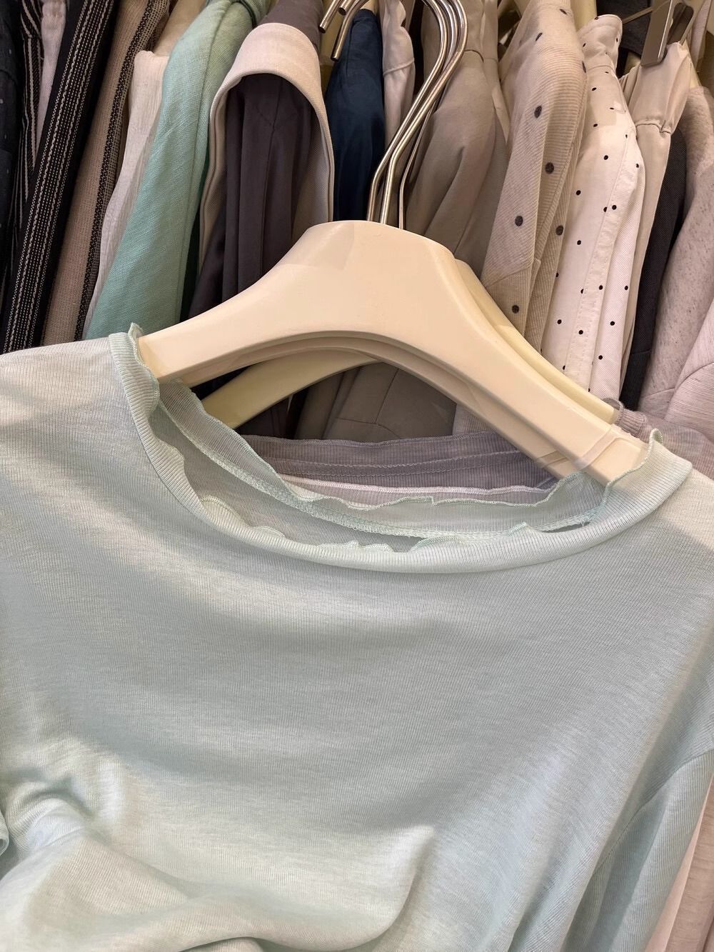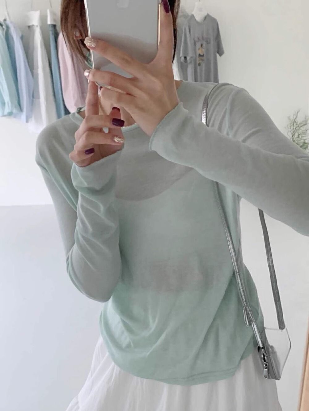 한국 스타일 우드 이어 크루 넥 모델 면 긴팔 티셔츠 여성용 민트 그린 마이크로 투명 경량 스택 슬림 핏 베이스 셔츠