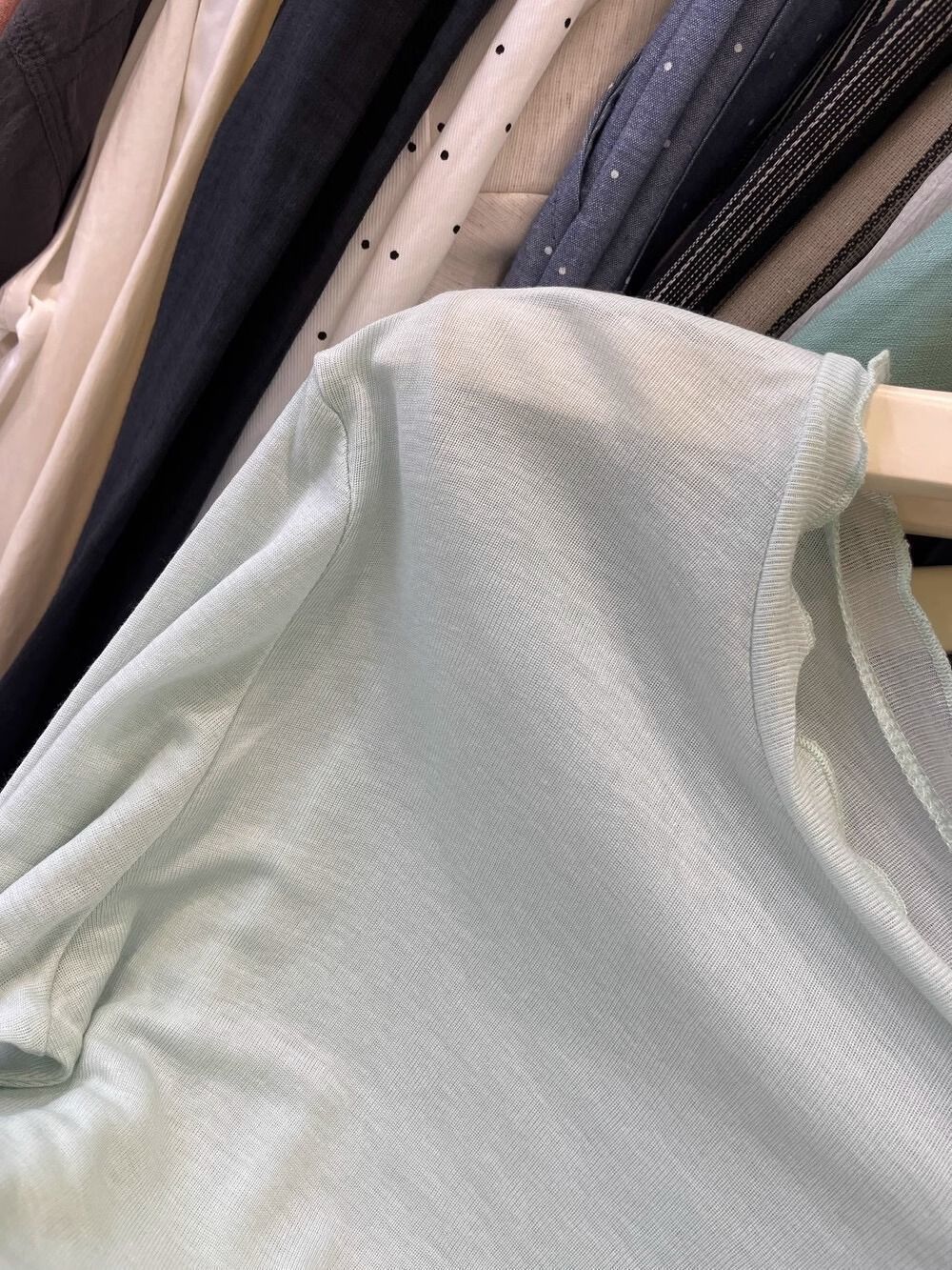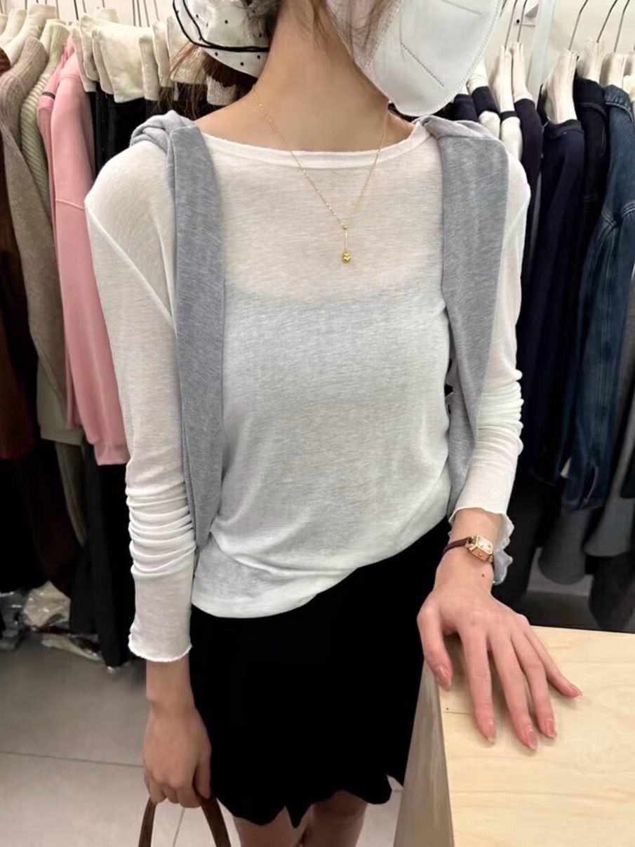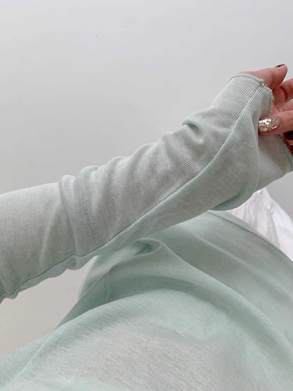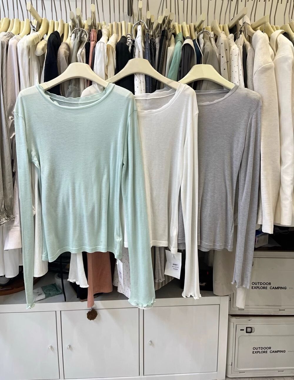 한국 스타일 우드 이어 크루 넥 모델 면 긴팔 티셔츠 여성용 민트 그린 마이크로 투명 경량 스택 슬림 핏 베이스 셔츠