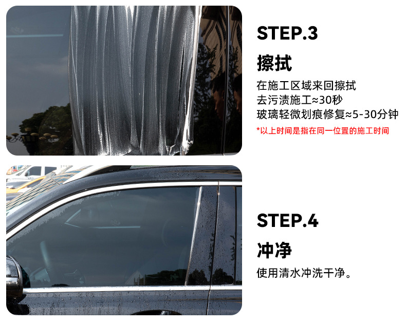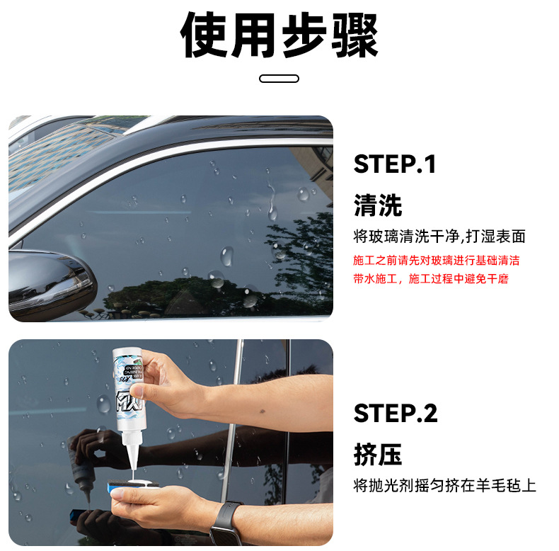【使用方法】:倒在玻璃表面用羊毛毡来回擦拭直到玻璃干净之后用清水冲洗干净既可。
