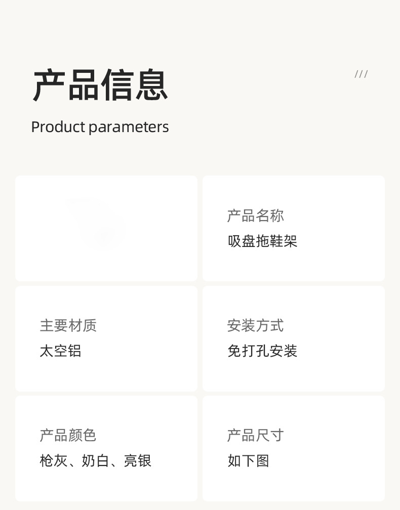 | 颜色 | 枪灰色吸盘太空铝拖鞋架【单个装】, 奶白色吸盘太空铝拖鞋架【单个装】, 枪灰色吸盘太空铝拖鞋架【两个装】, 奶白色吸盘太空铝拖鞋架【两个装】, 枪灰色吸盘太空铝拖鞋架【三个装】, 奶白色吸盘太空铝拖鞋架【三个装】 | 专利 | 否 |