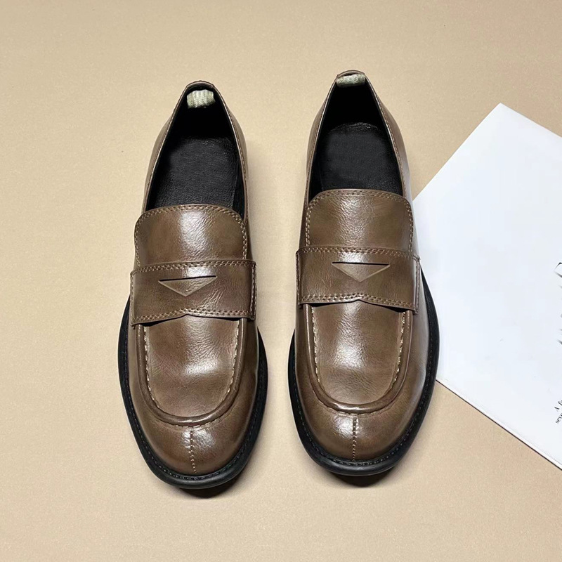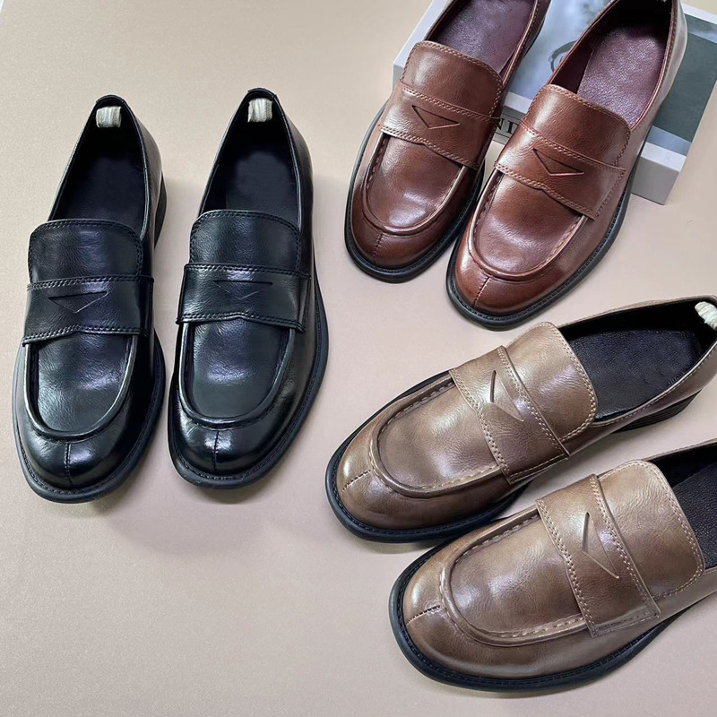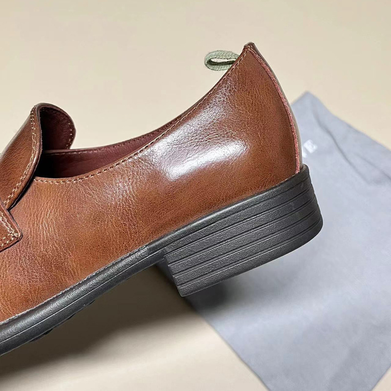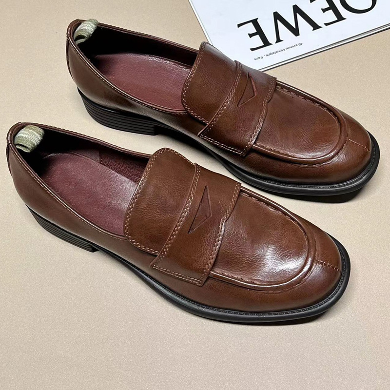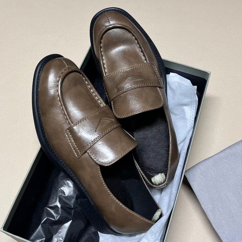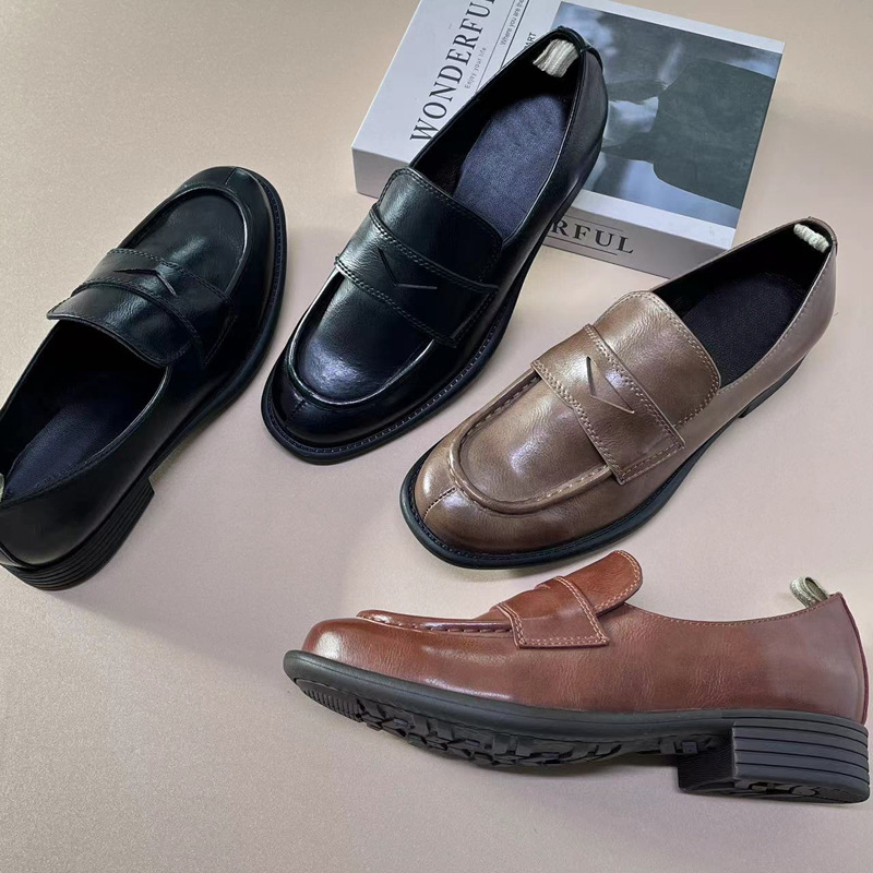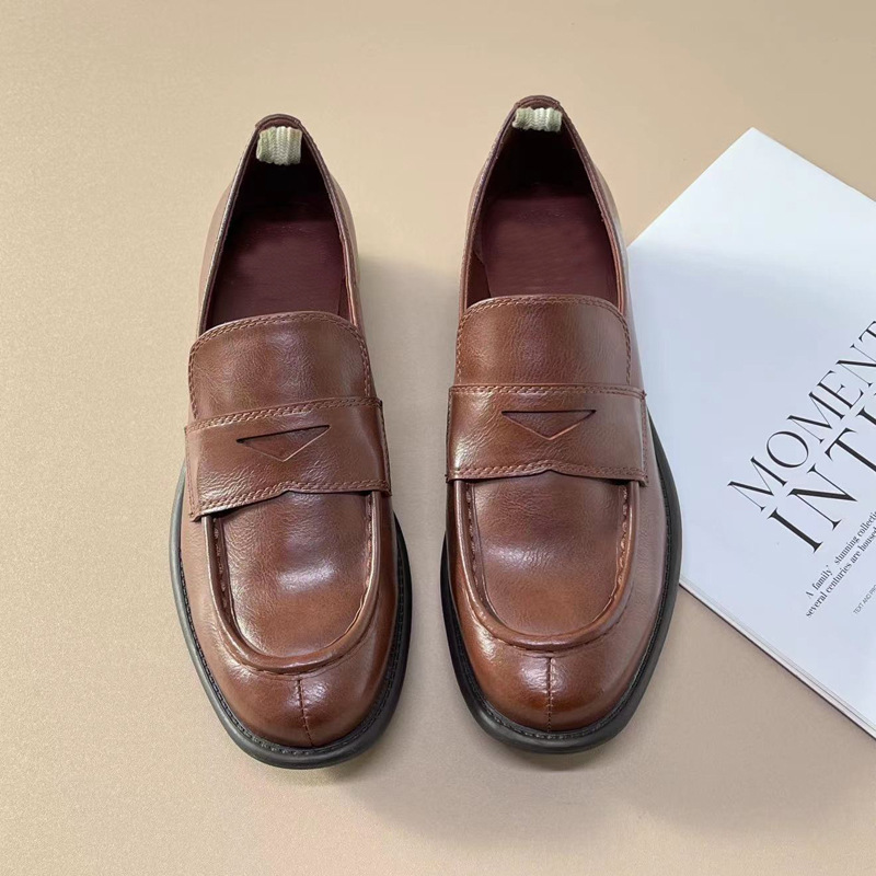 이탈리아 수제 신발 Cowhide 레트로 영국 올드 가죽 로퍼 Maillard 로우 힐 라운드 발가락 신발 여성
