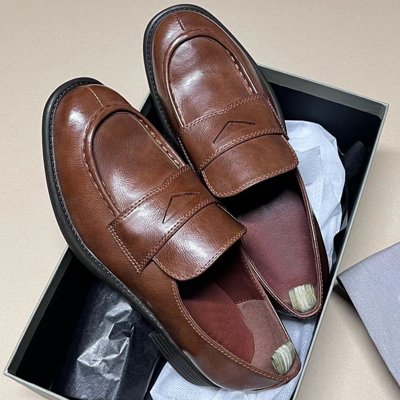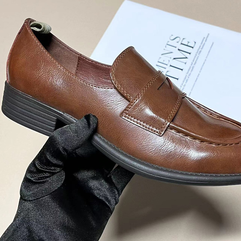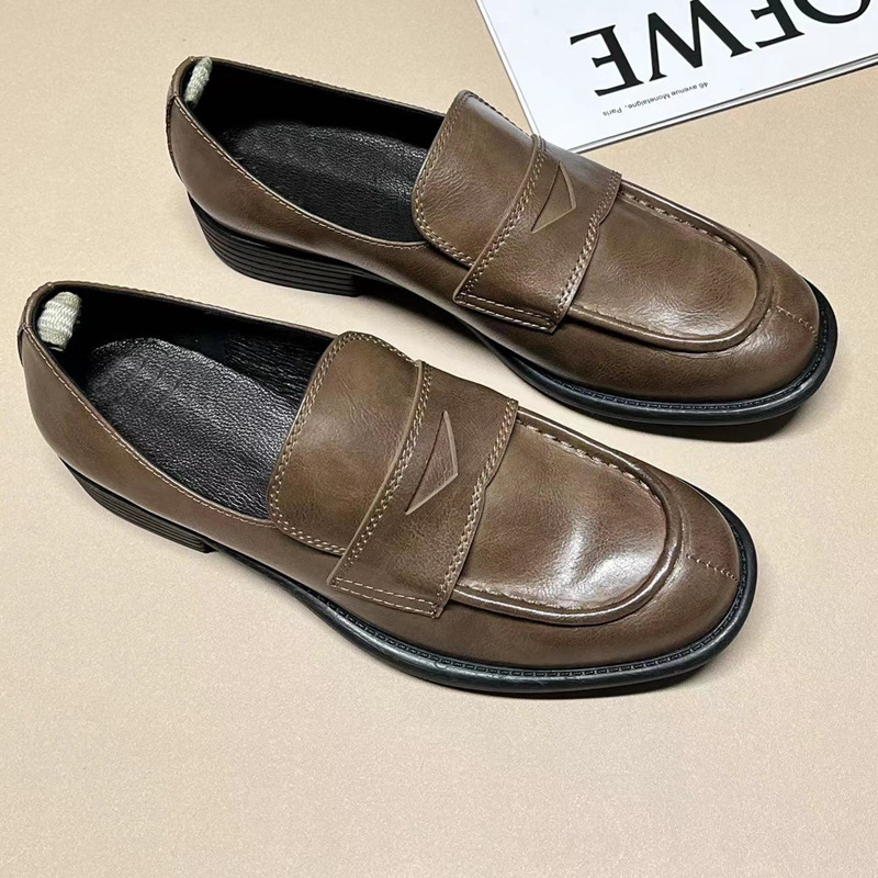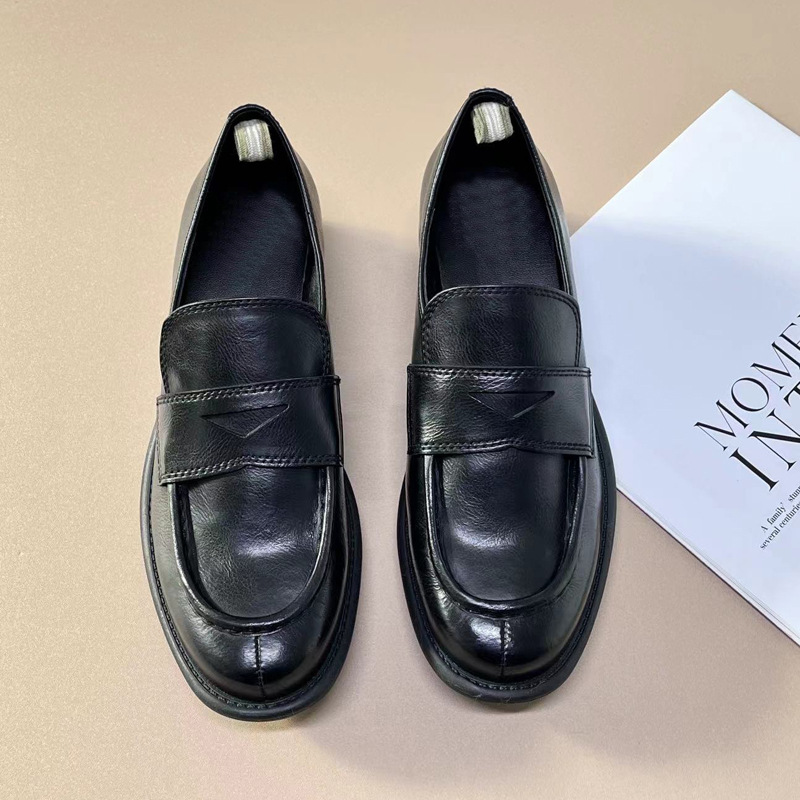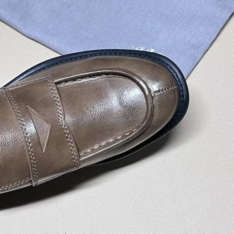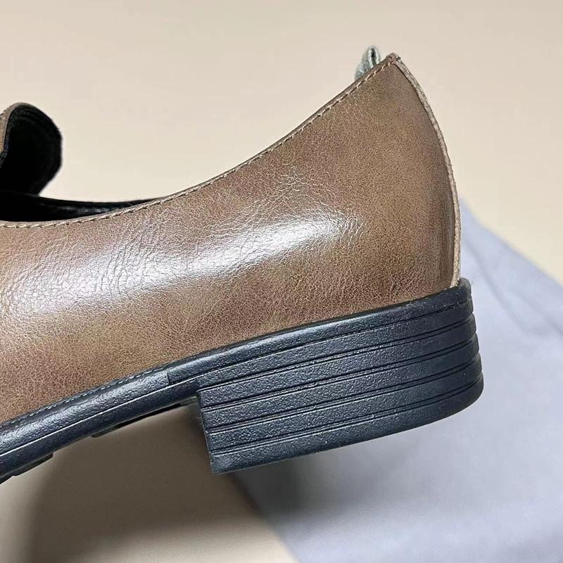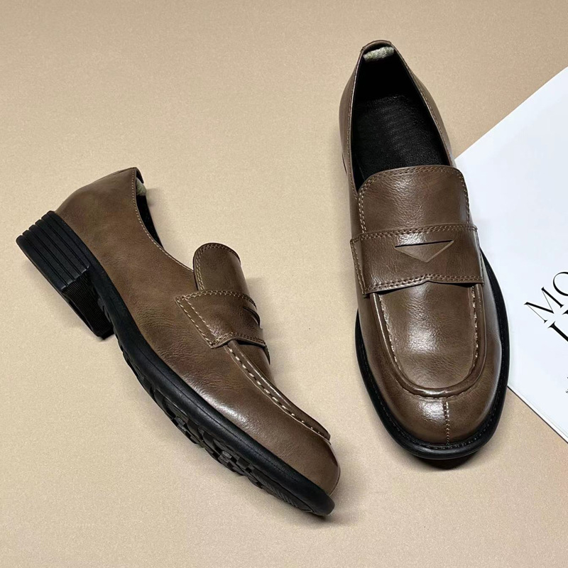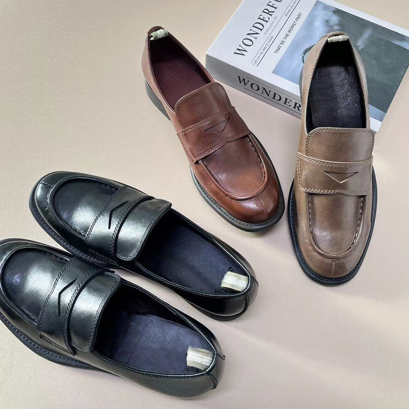 이탈리아 수제 신발 Cowhide 레트로 영국 올드 가죽 로퍼 Maillard 로우 힐 라운드 발가락 신발 여성