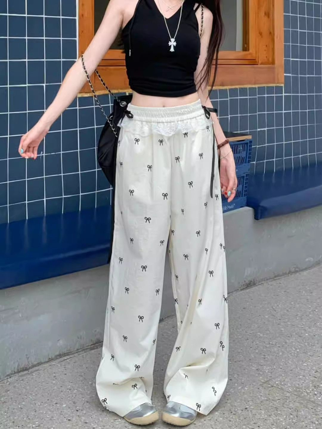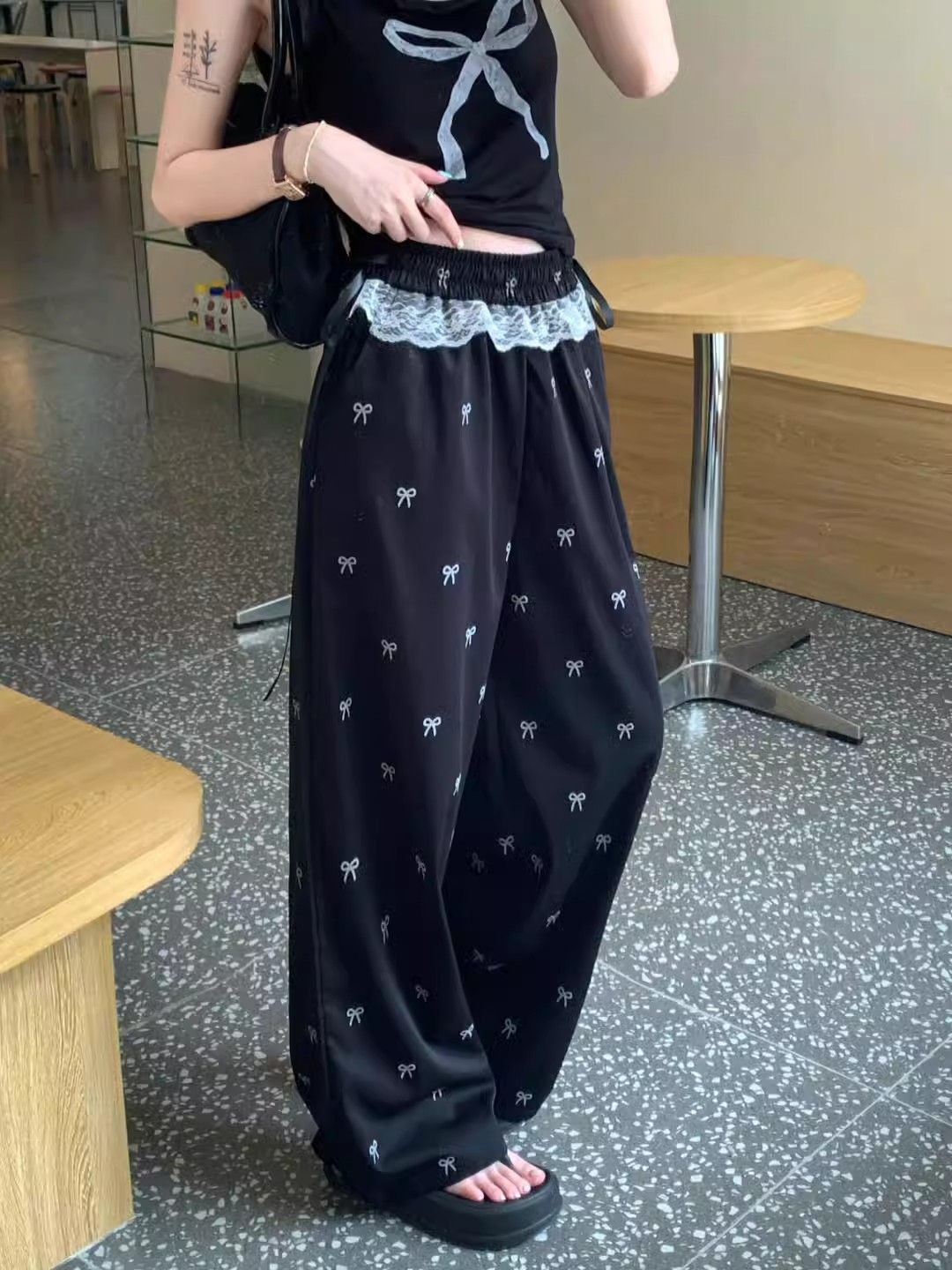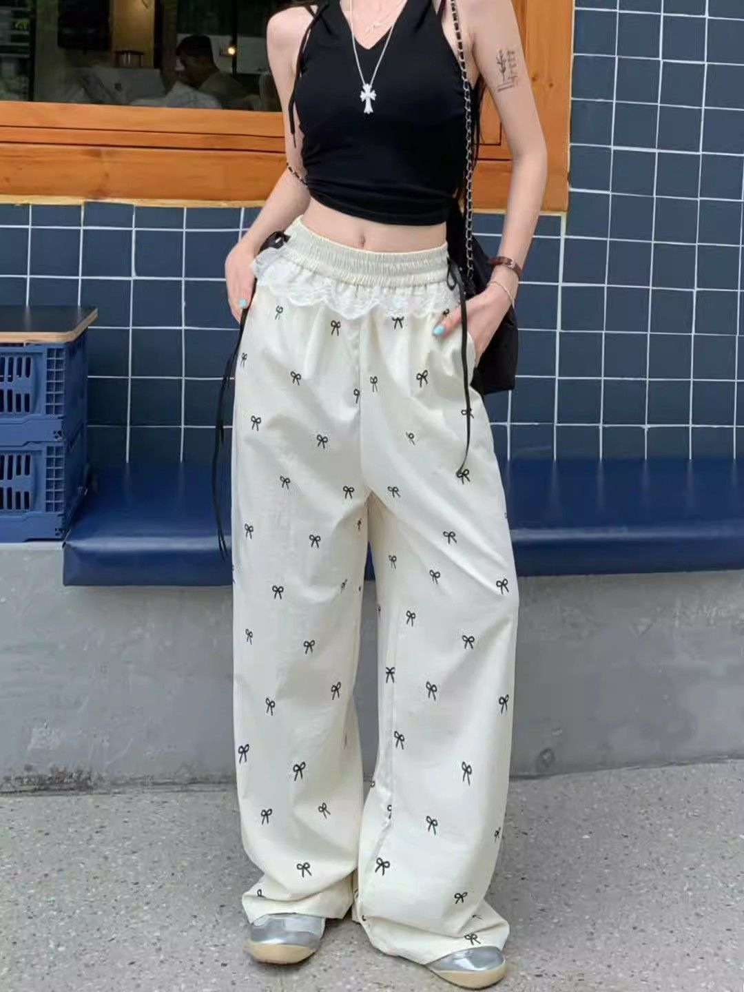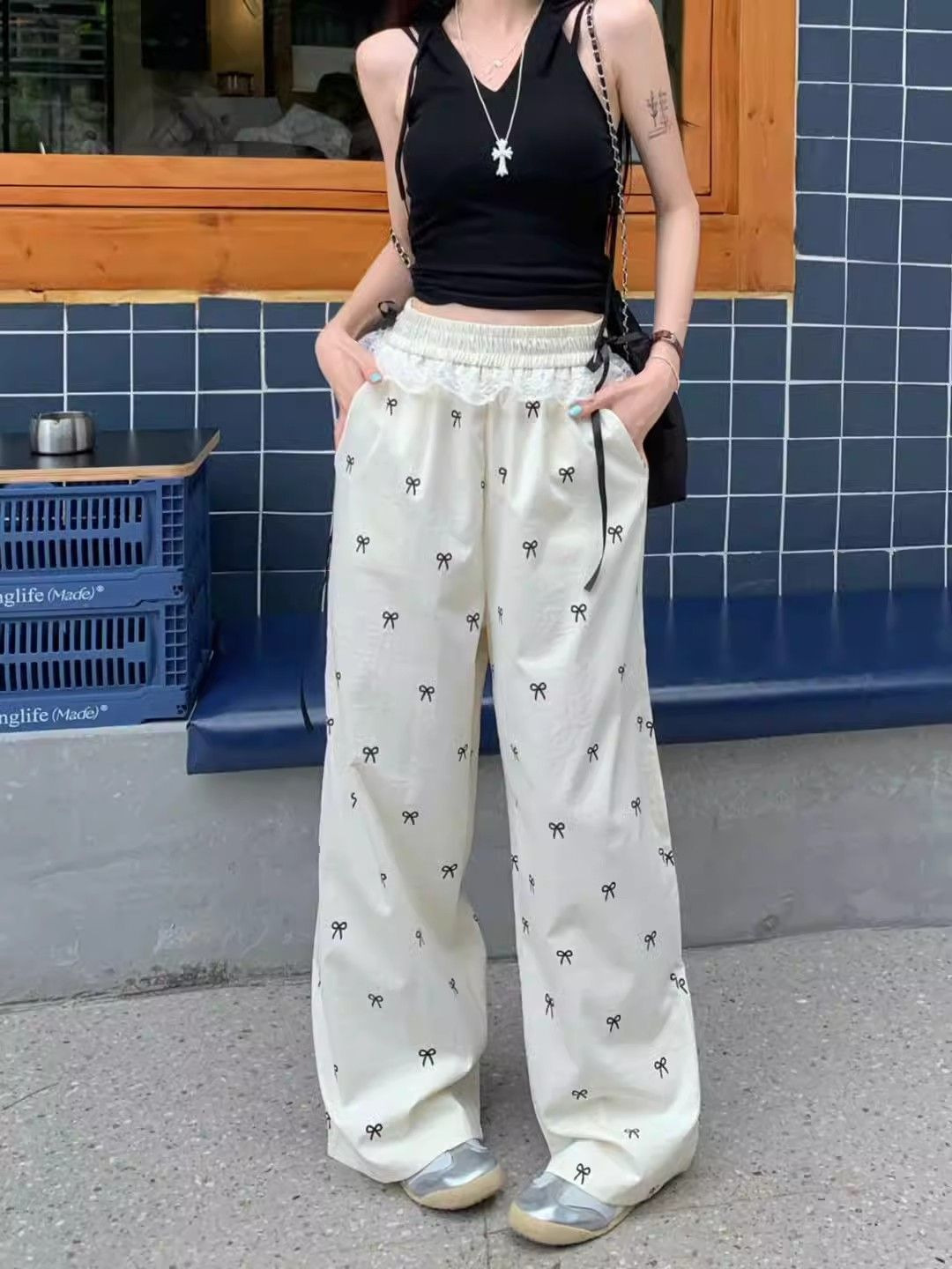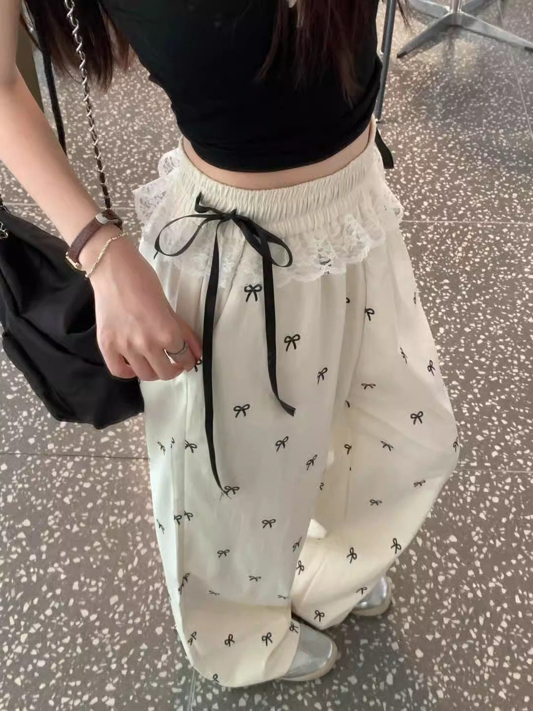 달콤한 핫걸 레이스 스플라이싱 캐주얼 팬츠 보우 팬츠 여성 여름 루즈한 신축성 있는 허리 와이드 팬츠 스트레이트 팬츠