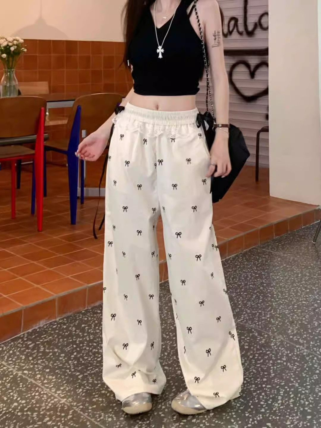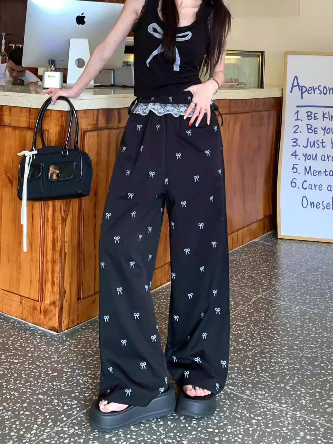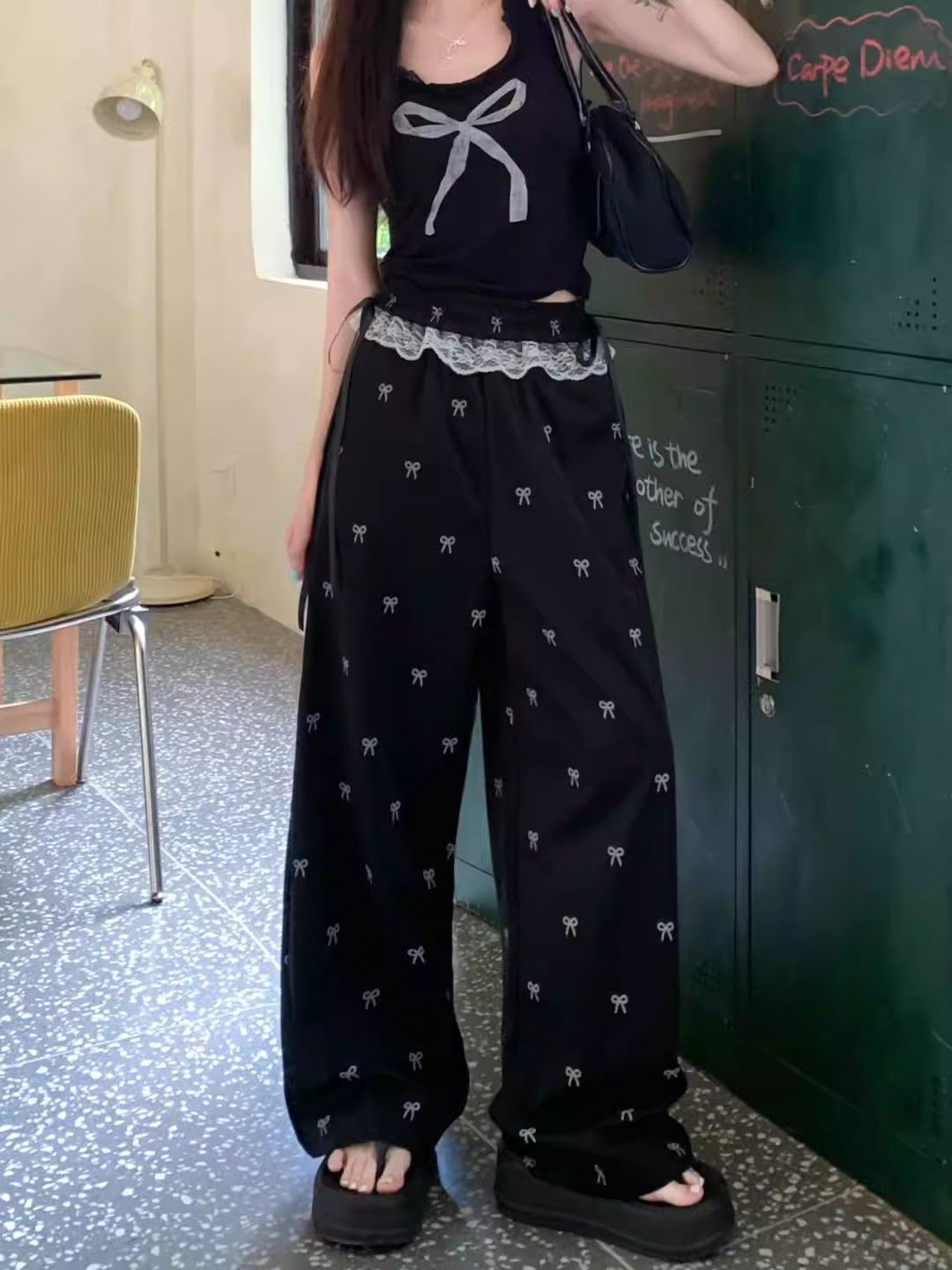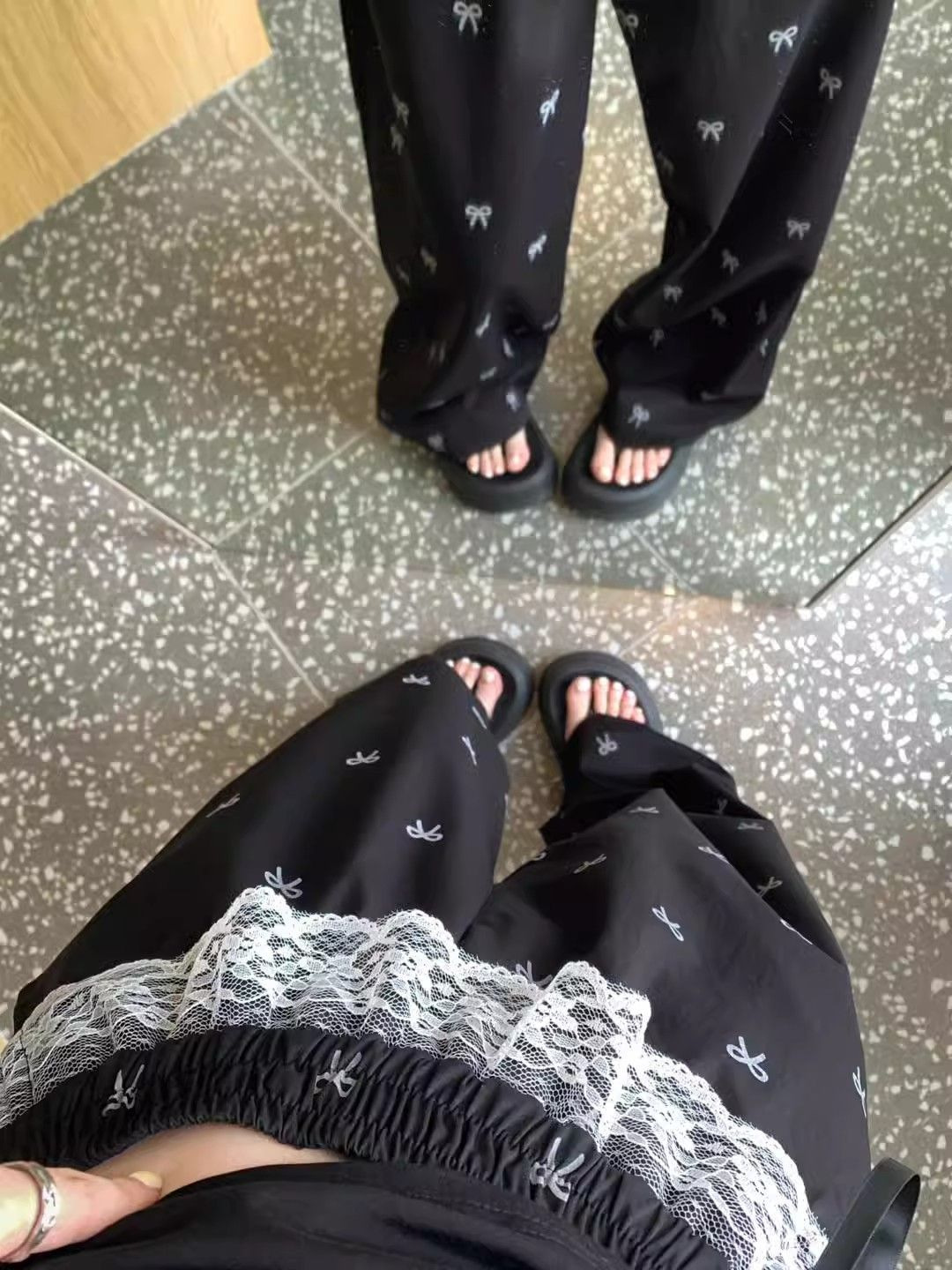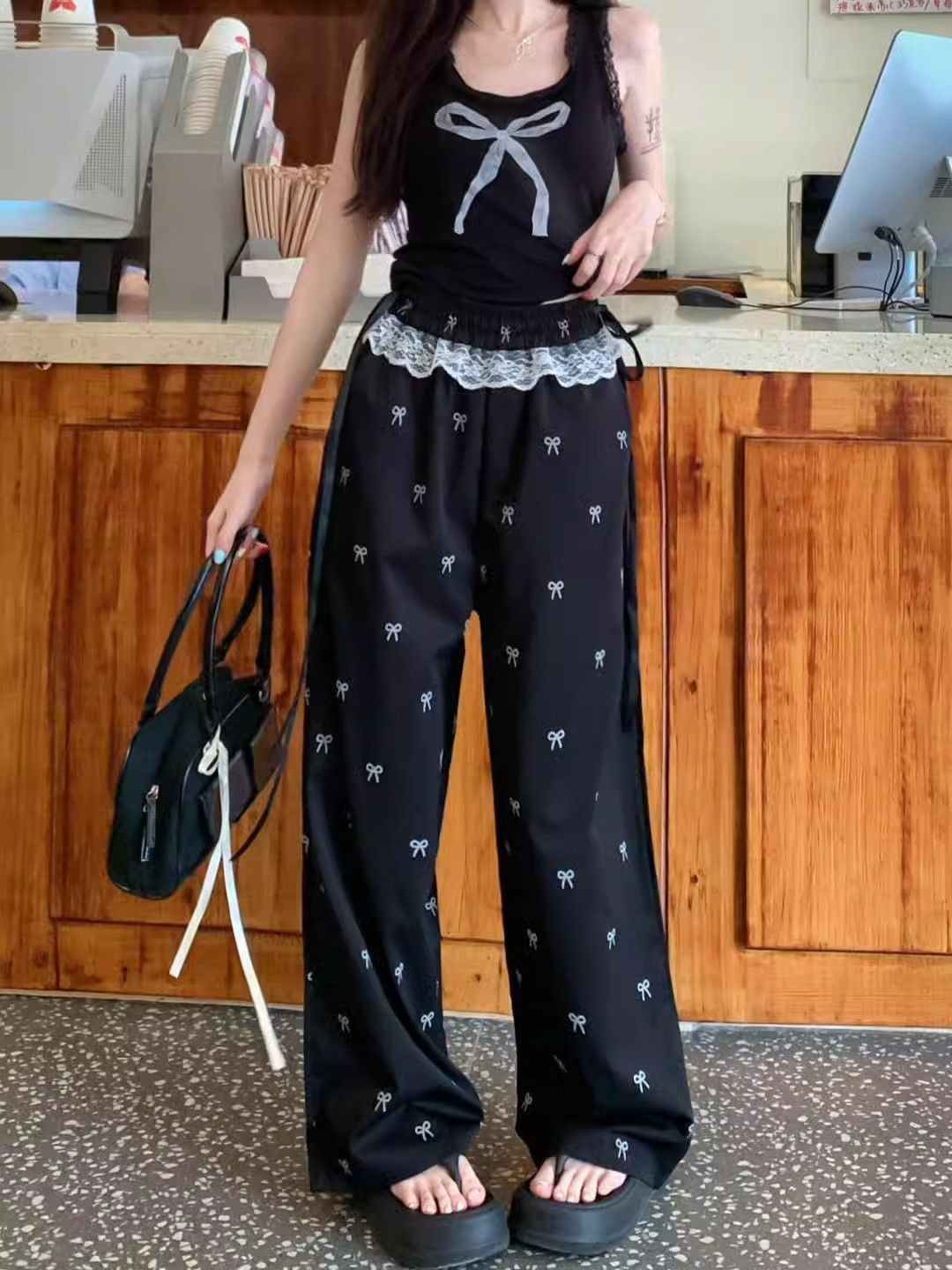 달콤한 핫걸 레이스 스플라이싱 캐주얼 팬츠 보우 팬츠 여성 여름 루즈한 신축성 있는 허리 와이드 팬츠 스트레이트 팬츠