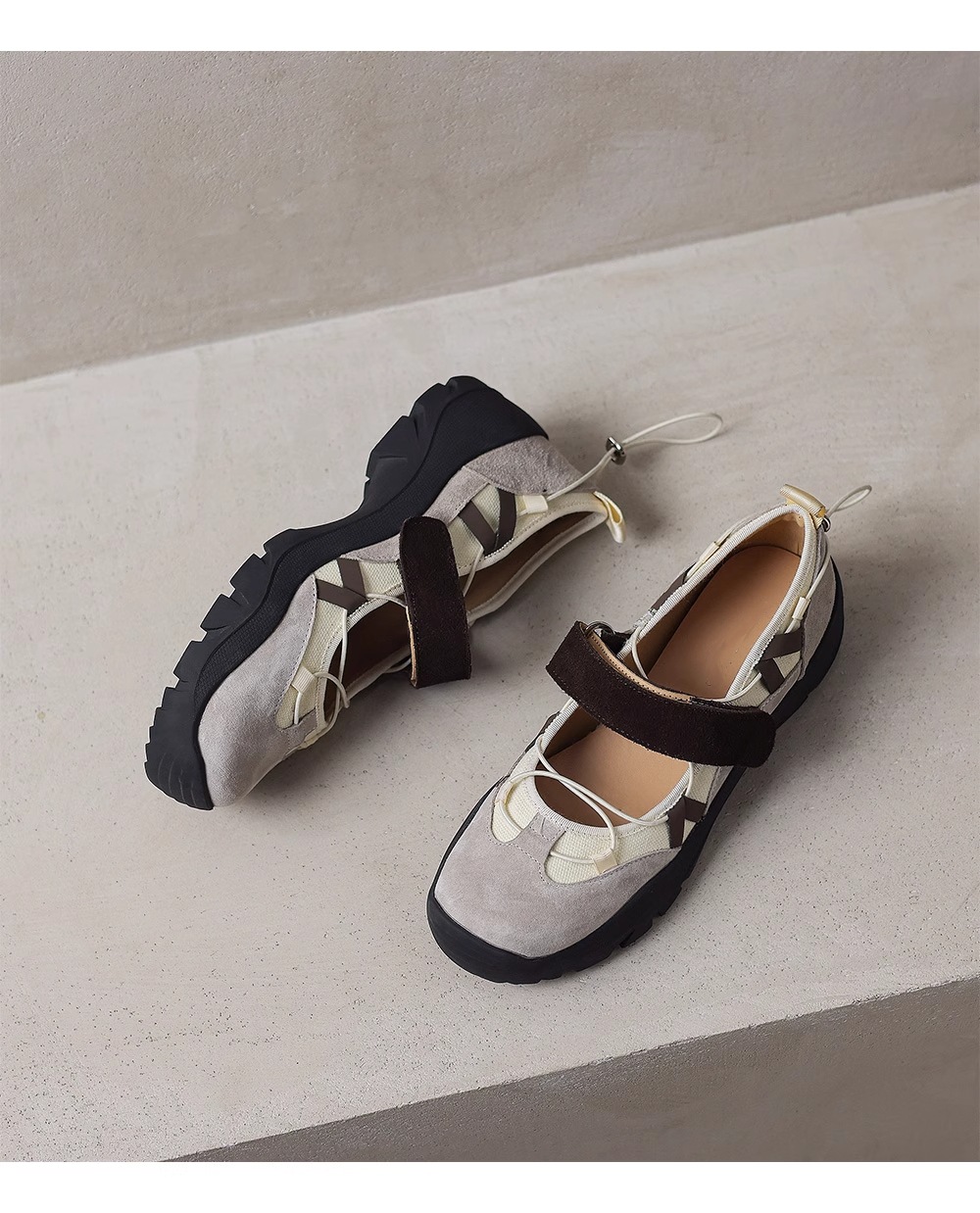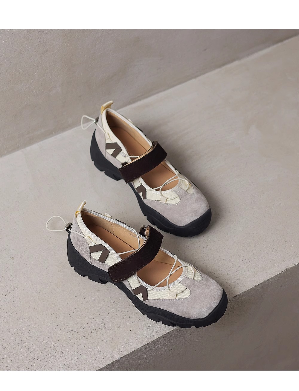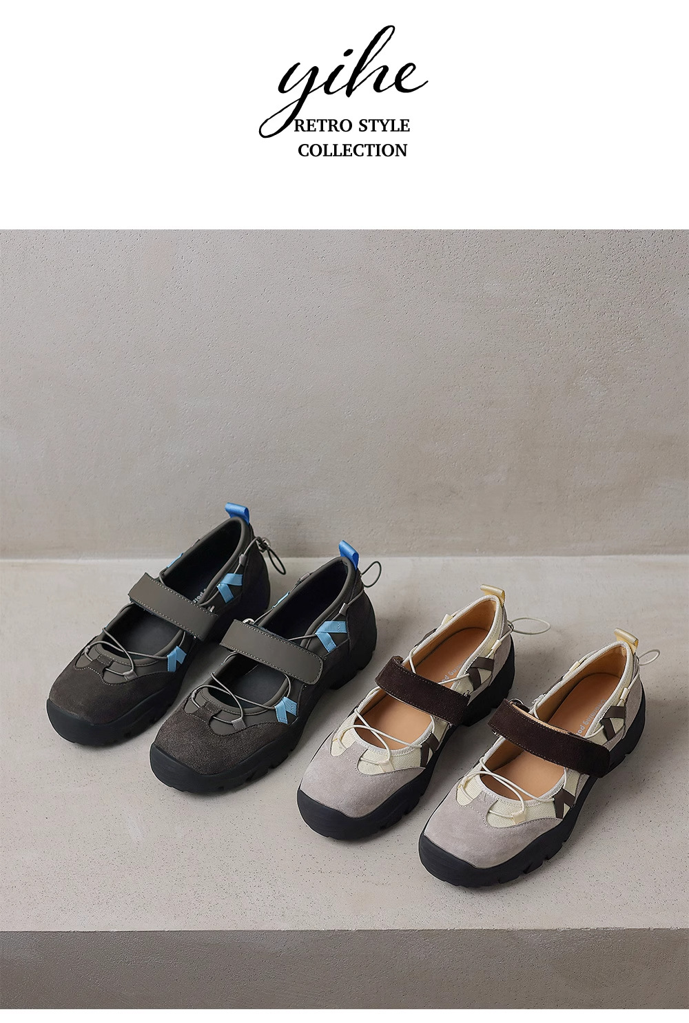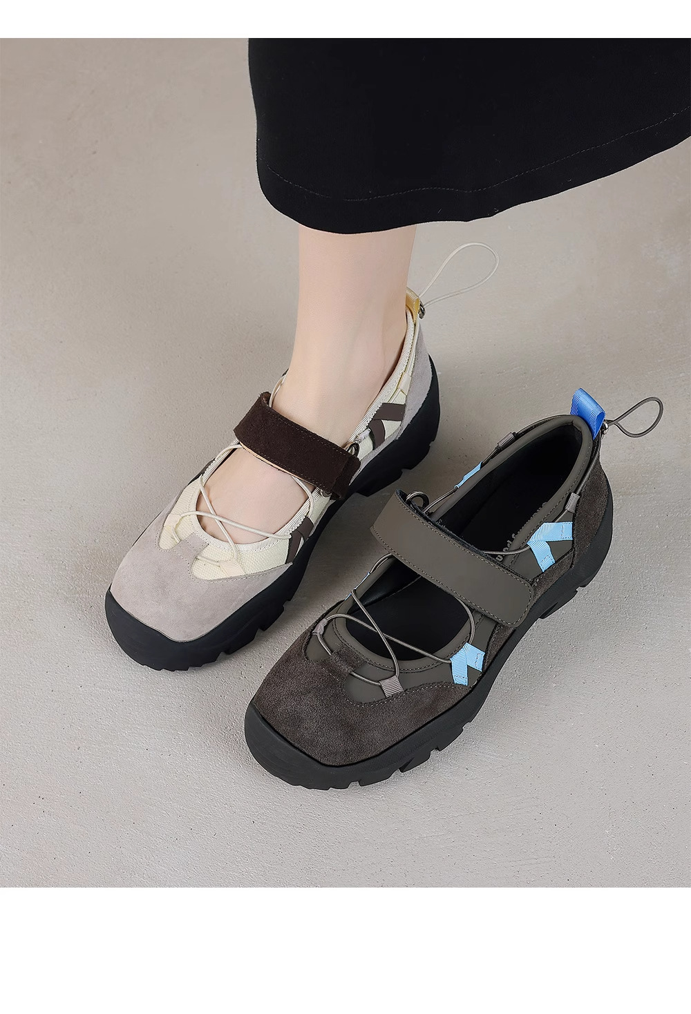 Cowhide 버전 ~ 두꺼운 밑창 색상 일치하는 스포츠 후크와 루프 Mary Jane 신발 여성 복고풍 가죽 다목적 기능성 바람 단일 신발