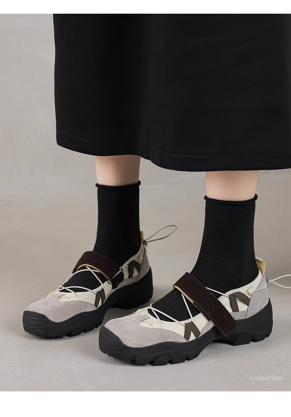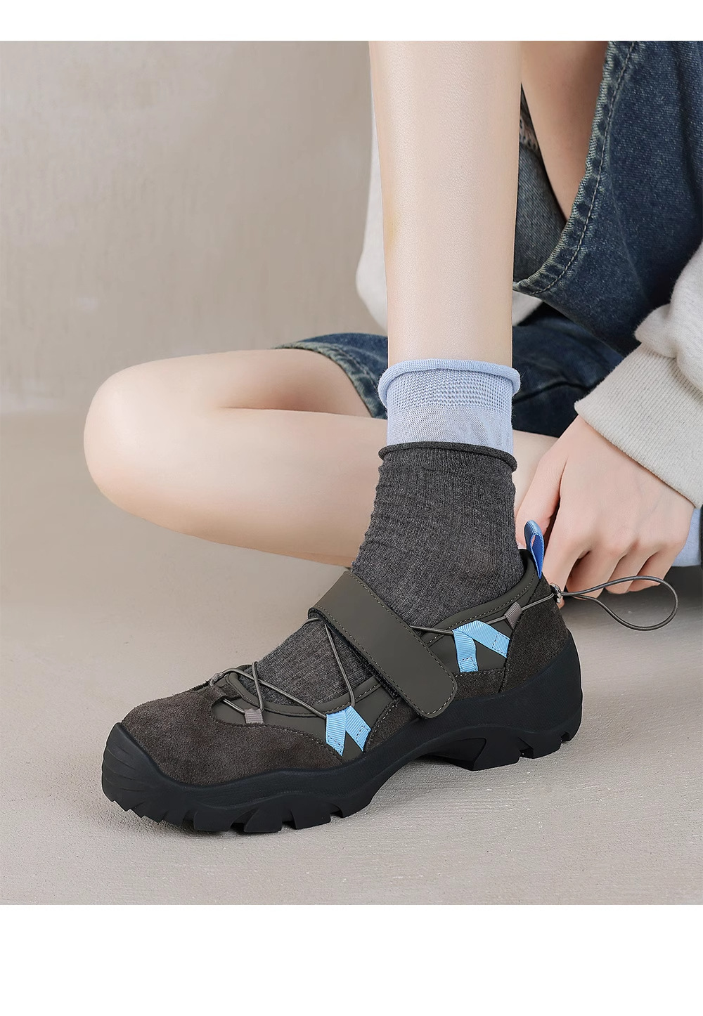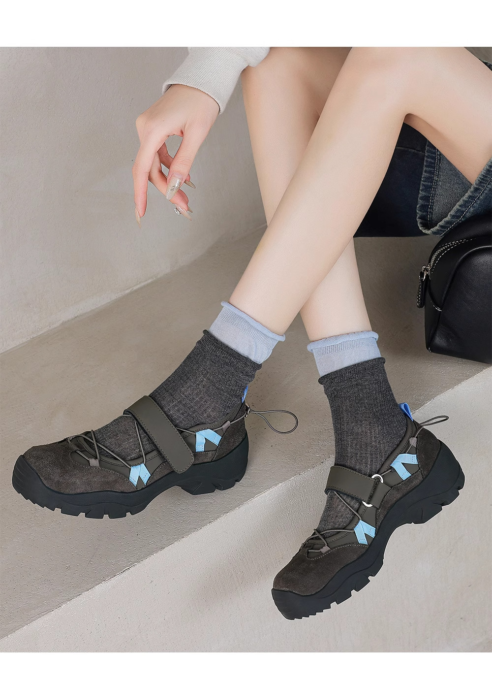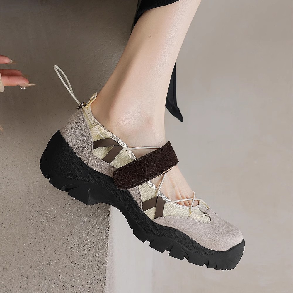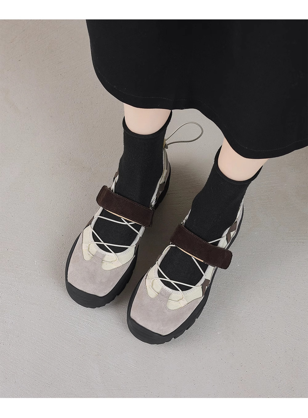 Cowhide 버전 ~ 두꺼운 밑창 색상 일치하는 스포츠 후크와 루프 Mary Jane 신발 여성 복고풍 가죽 다목적 기능성 바람 단일 신발