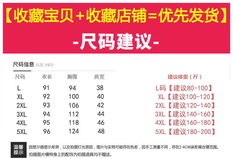 | 颜色 | 图片色 | 尺码 | L, XL, 2XL, 3XL, 4XL, 5XL |
