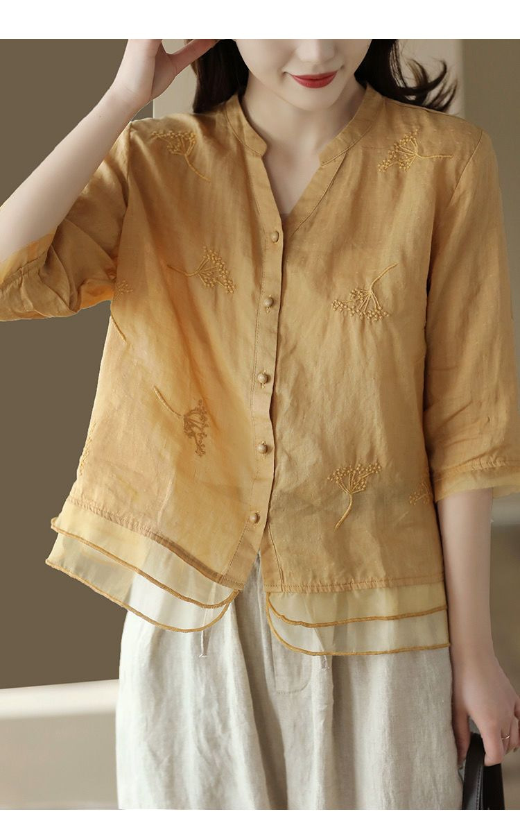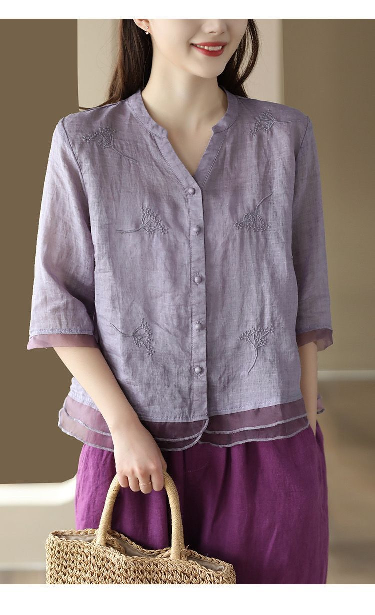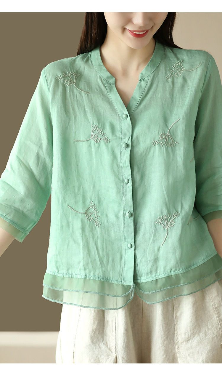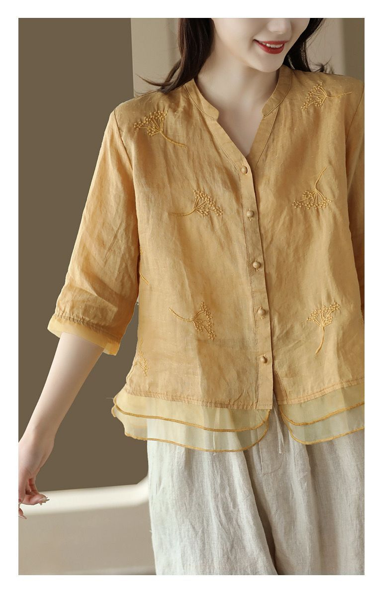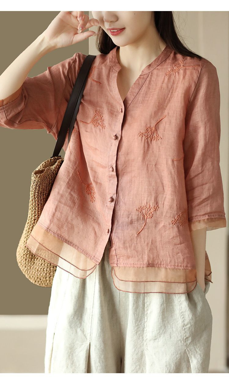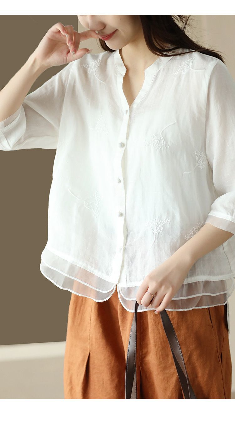 2025 새로운 빈티지 코튼 및 리넨 셔츠 여성용 예술적 카디건 셔츠 기질 스티칭 디자인 센스 슬림 탑