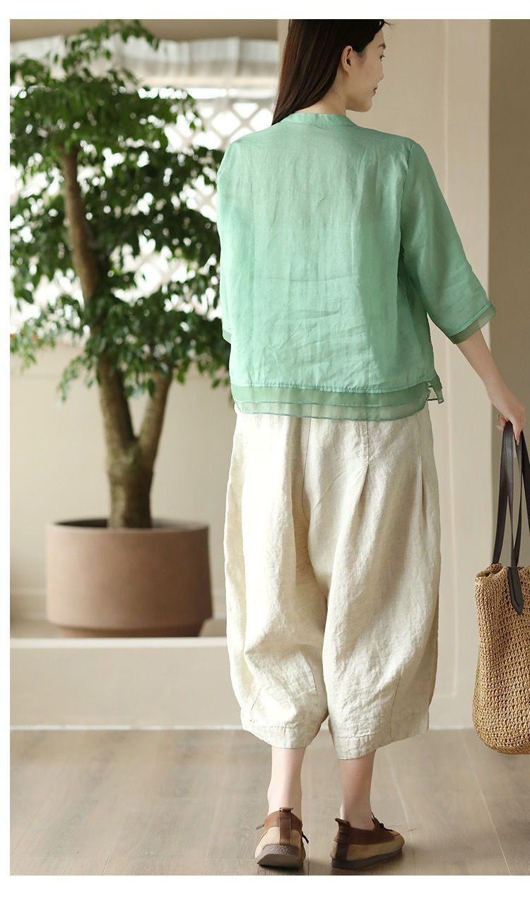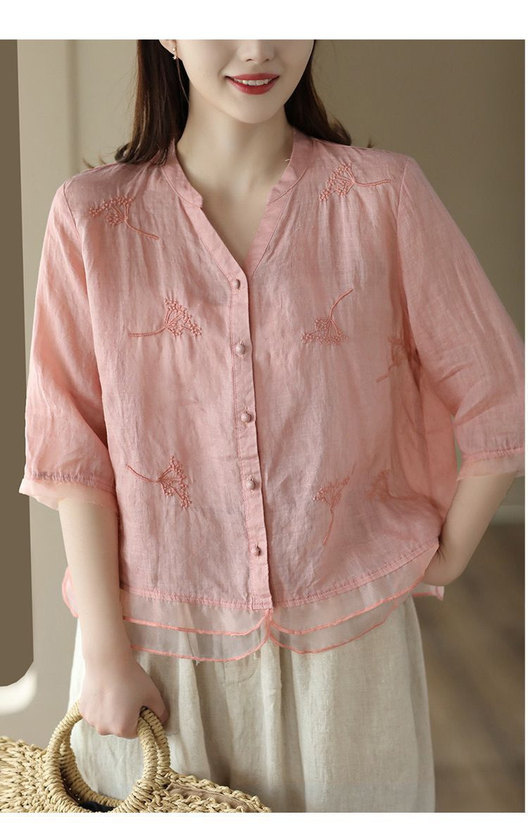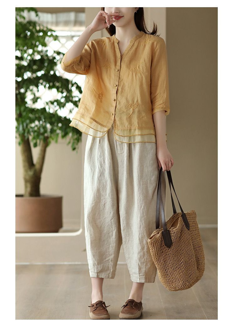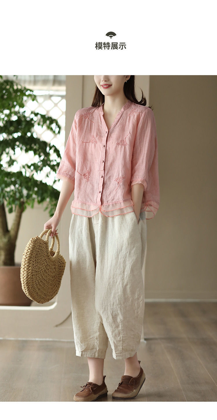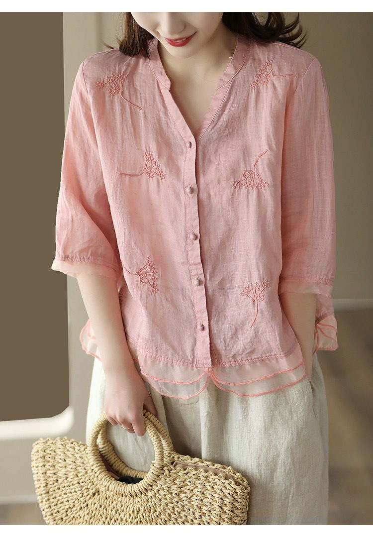2025 새로운 빈티지 코튼 및 리넨 셔츠 여성용 예술적 카디건 셔츠 기질 스티칭 디자인 센스 슬림 탑