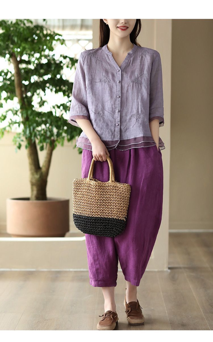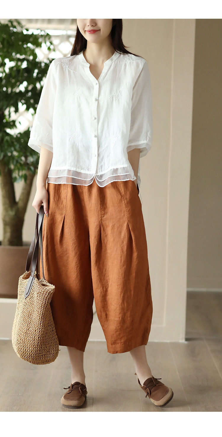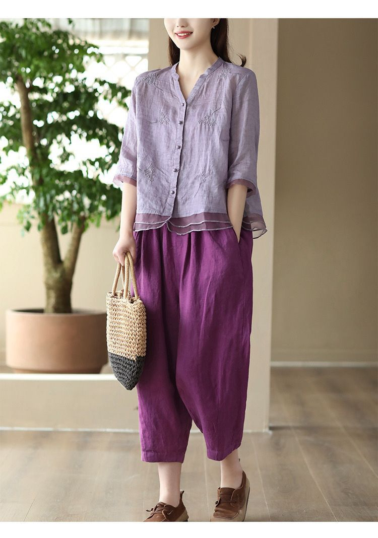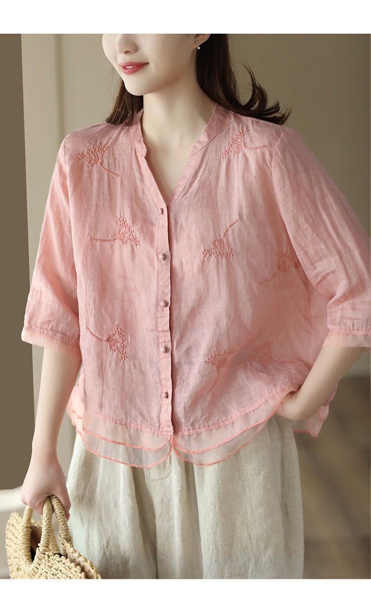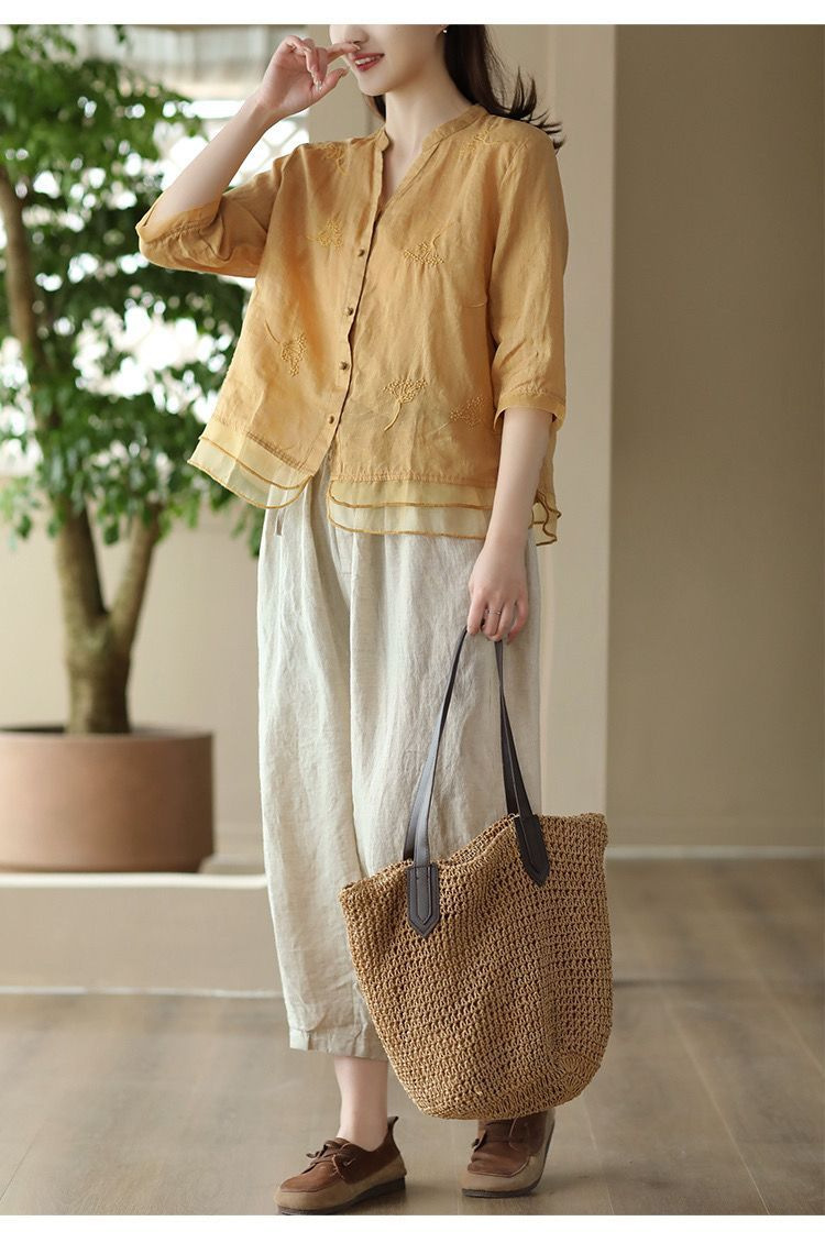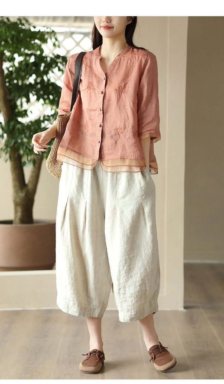 2025 새로운 빈티지 코튼 및 리넨 셔츠 여성용 예술적 카디건 셔츠 기질 스티칭 디자인 센스 슬림 탑