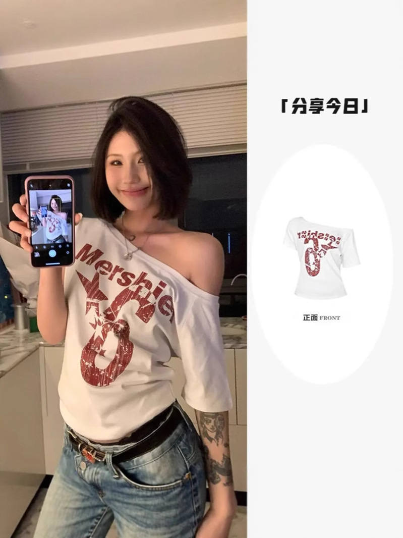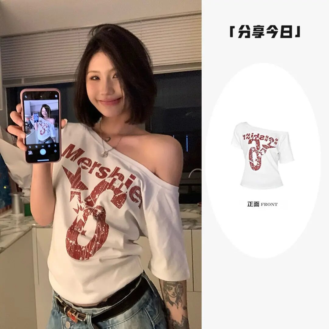 아메리칸 스타일 스파이스 걸스 숄더 레터 프린트 반팔 티셔츠 여성용 여름 게으른 스타일 슬림 핏 쇼트 탑