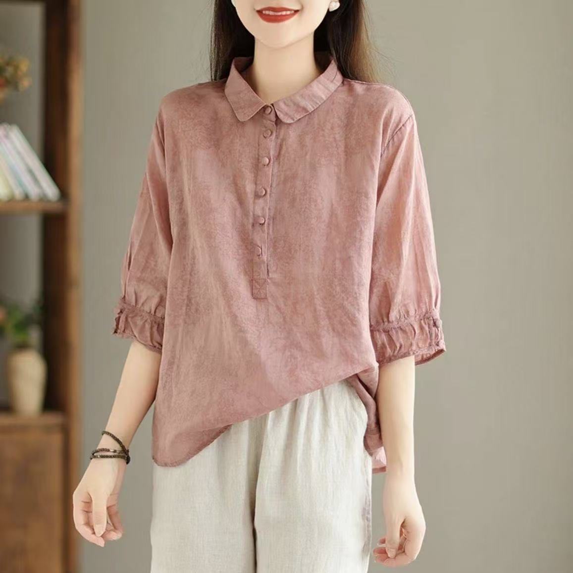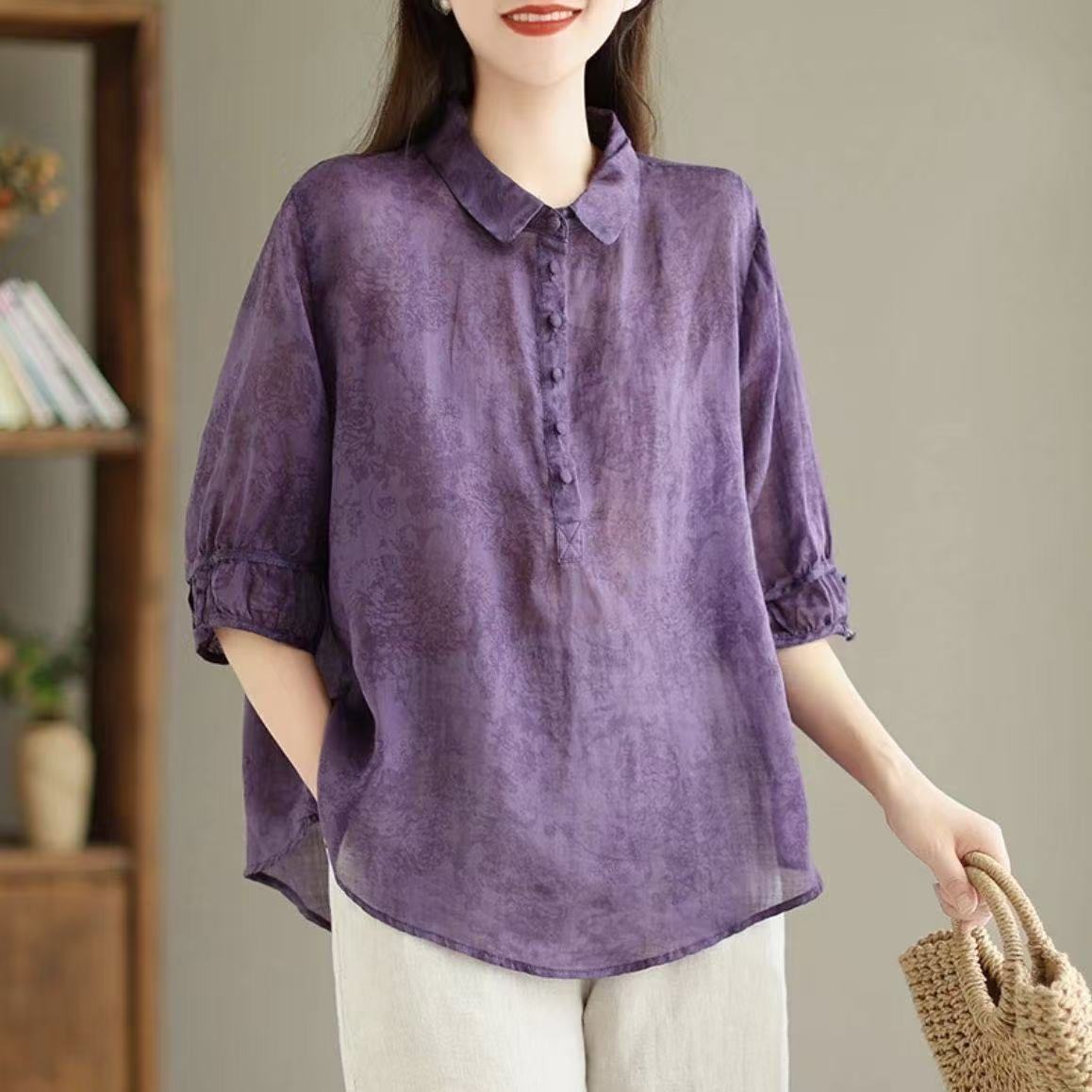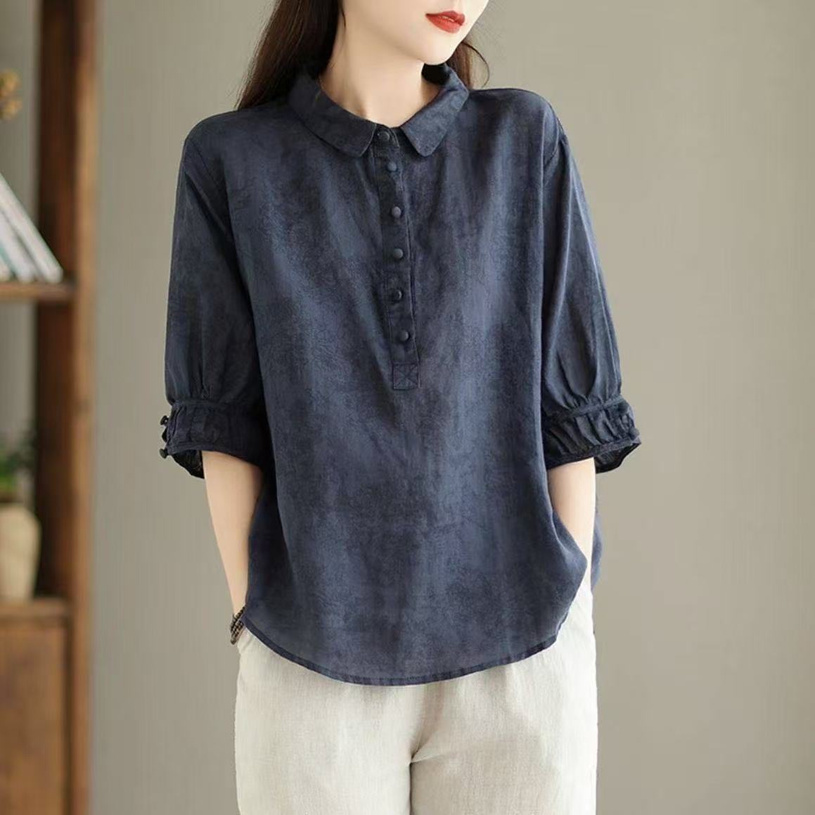 패셔너블한 프린트 라펠 셔츠, 레트로 스타일 여성용 중간 소매 셔츠, 슬림하고 몸매를 가려주는 얇은 셔츠