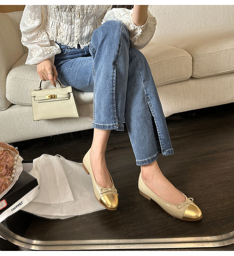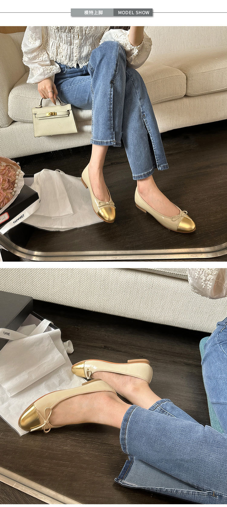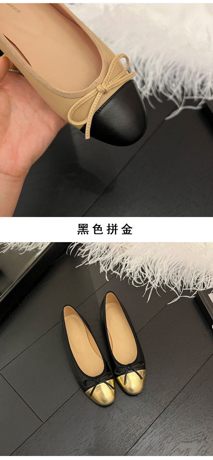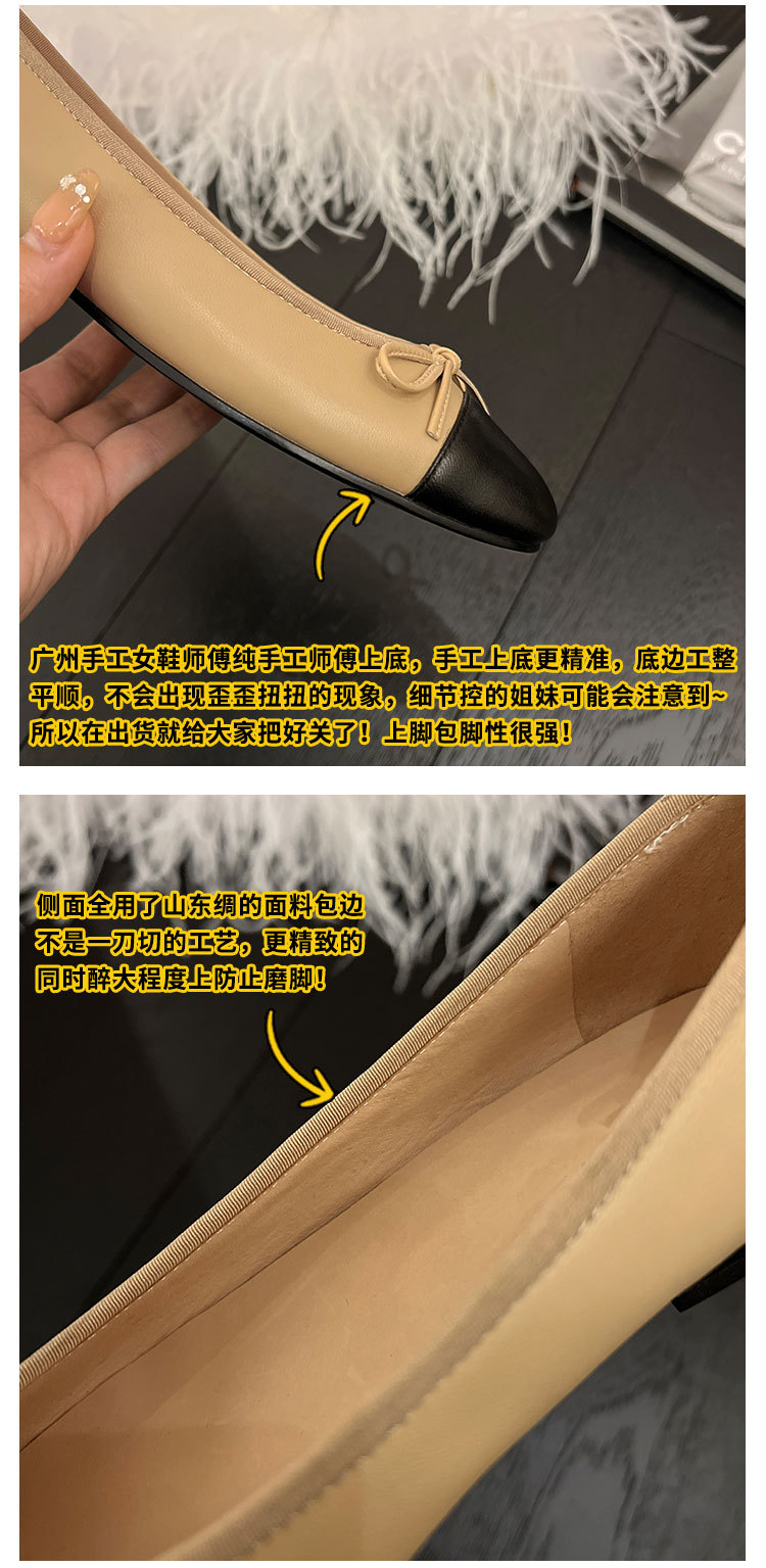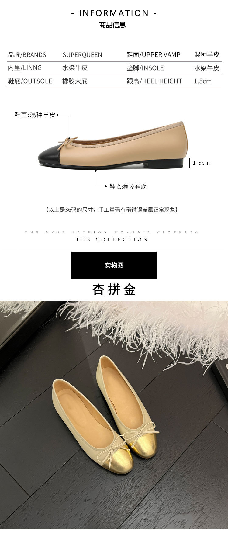 2025년 신상 Xiaoxiangfeng 여성용 정품 가죽 펌프스 라운드 토 신발, 여성용 다용도 통근 컬러 블록 보우 발레 슈즈