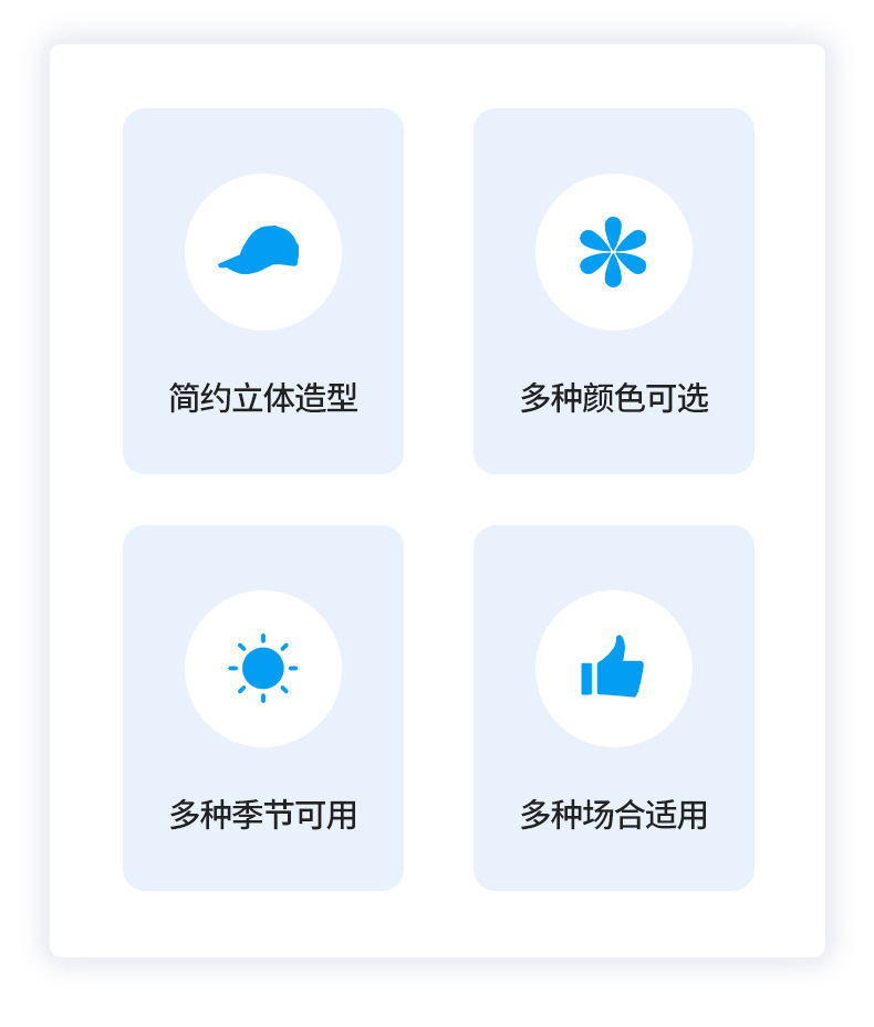 | 帽檐款式 | 弯檐 | 颜色 | 白色, 宝蓝色, 藏蓝色, 黑色, 玫红色, 米色, 浅灰色, 深灰色 |