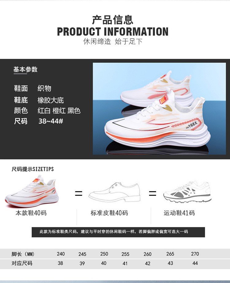 | 颜色 | 123456-白色, 123456-橘色, 123456-黑色 | 尺码 | 39, 40, 41, 42, 43, 44 |