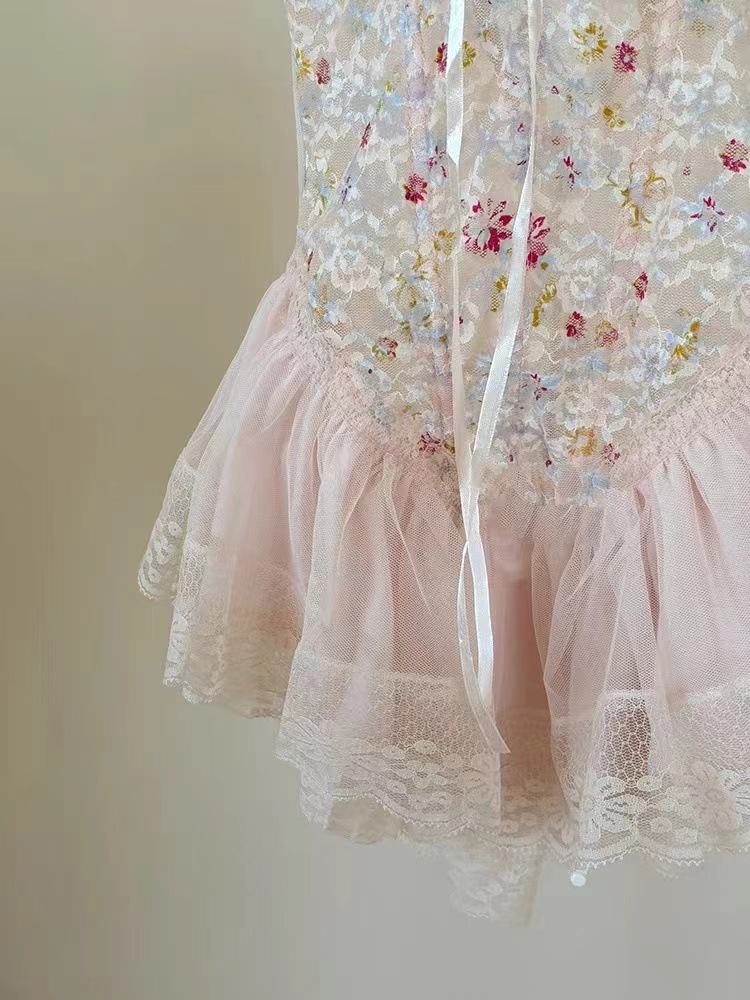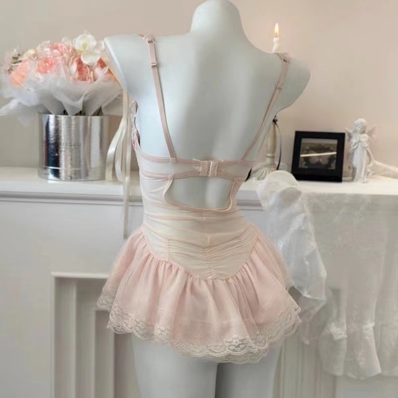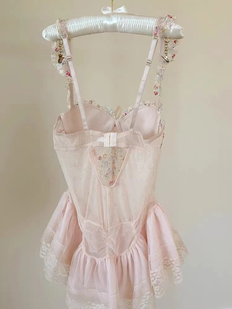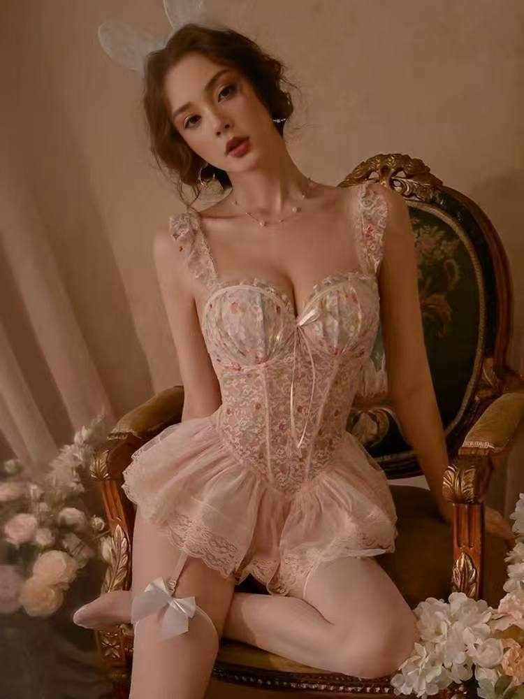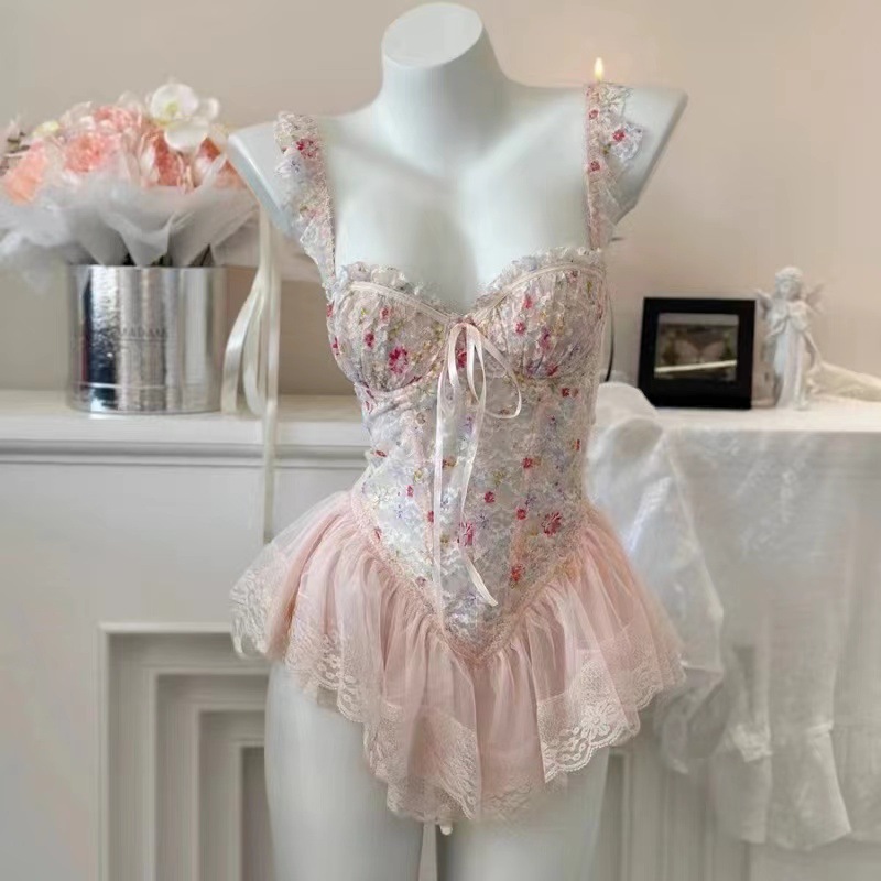 카메이쉐 섹시 란제리 여름 달콤한 바비 플로럴 피쉬본 브라 슬림핏 푸쉬업 섹시 슬립웨어 9960