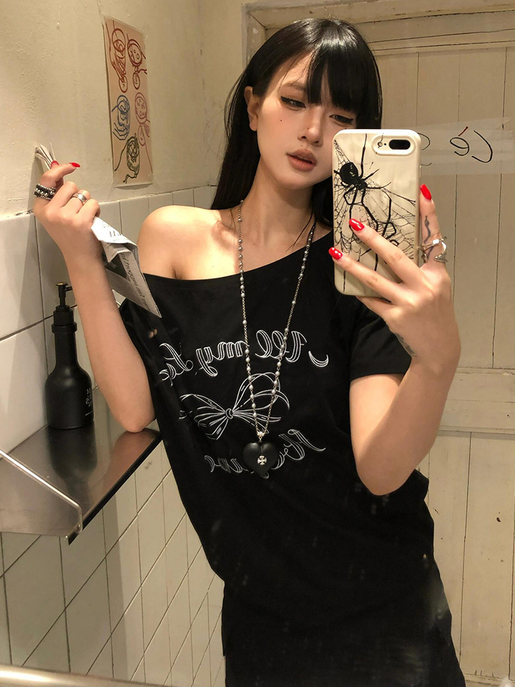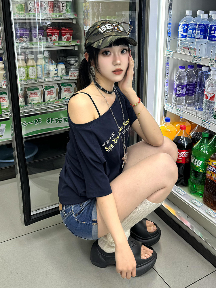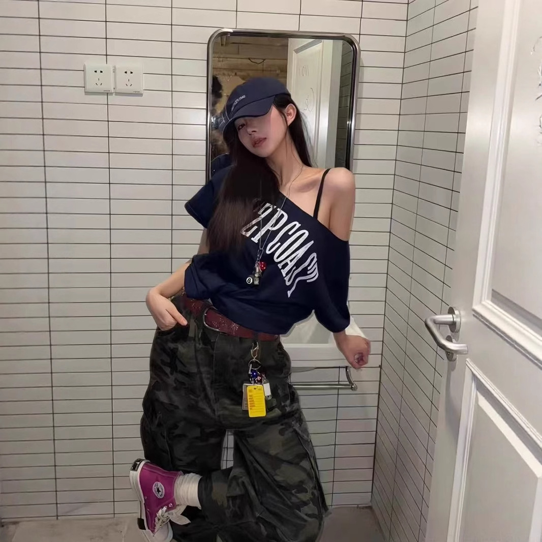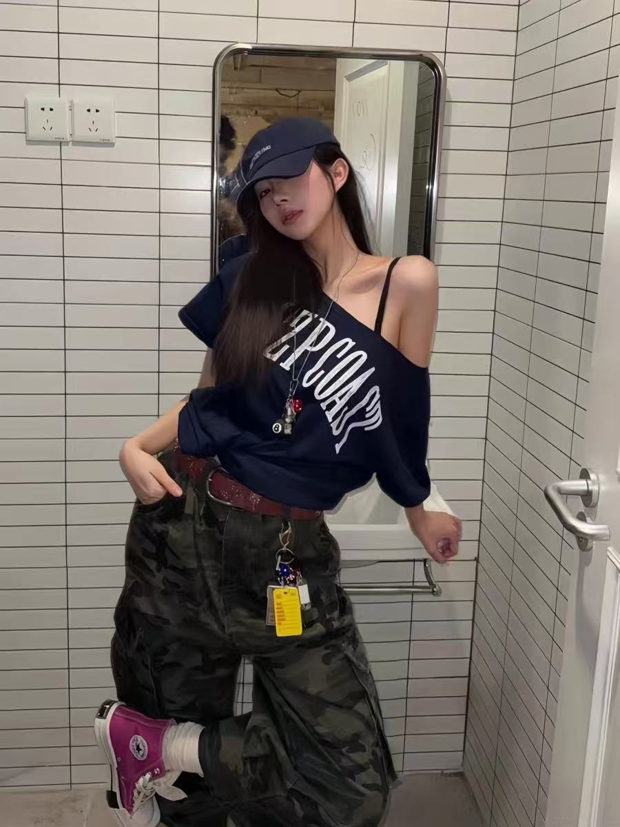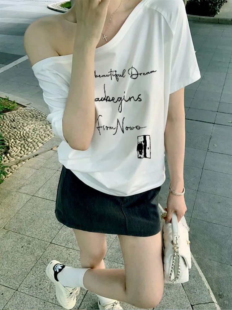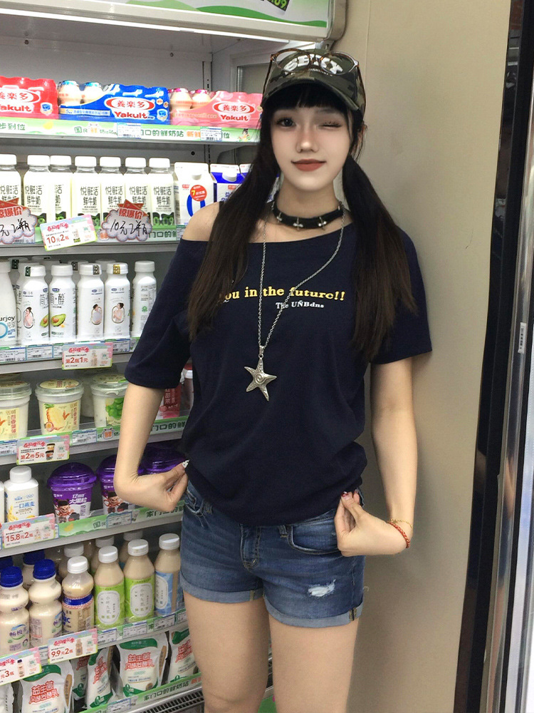 미국 복고풍 네이비 블루 문자 인쇄 기울어 진 어깨 반팔 오른쪽 어깨 티셔츠 여성 여름 느슨한 독특하고 아름다운 탑
