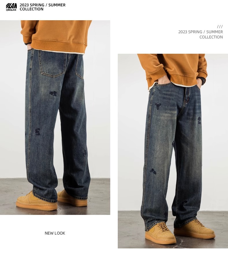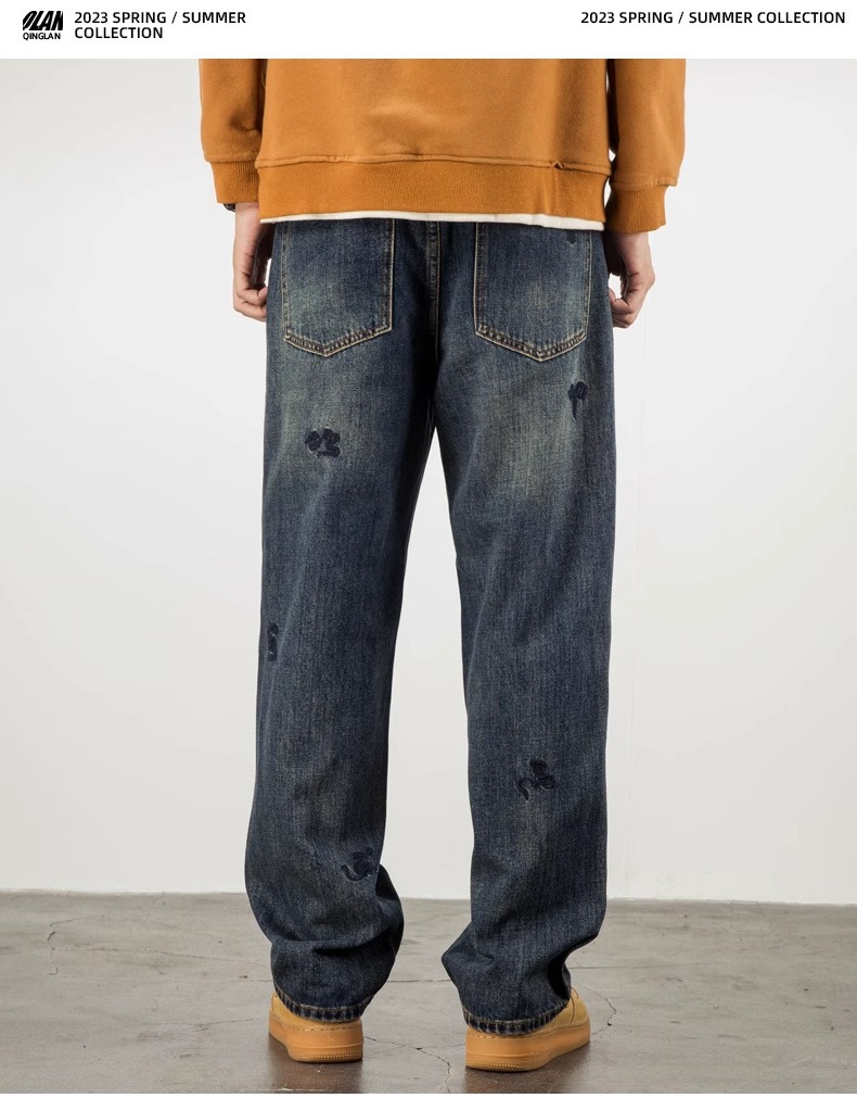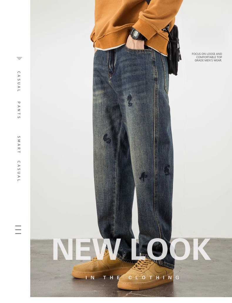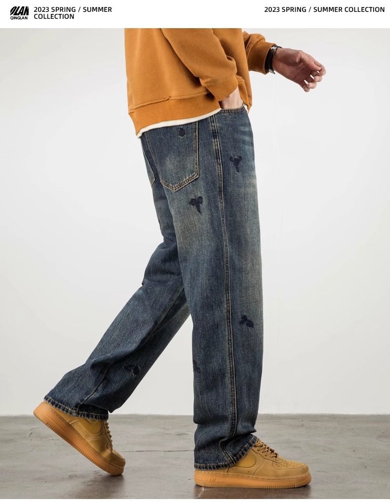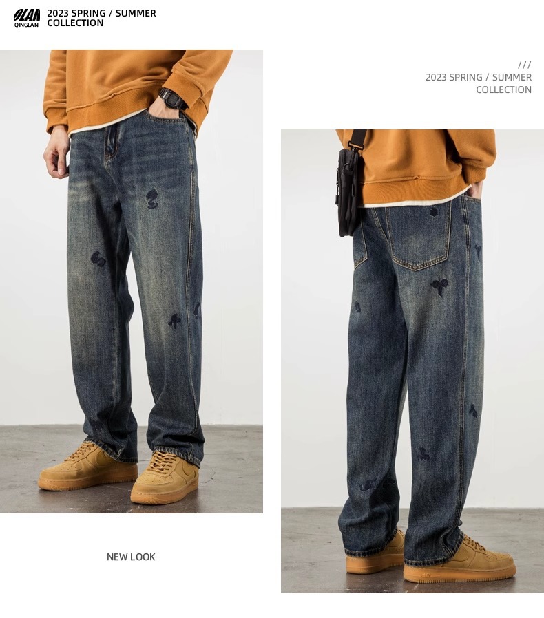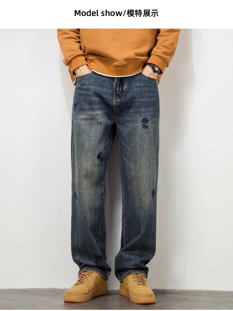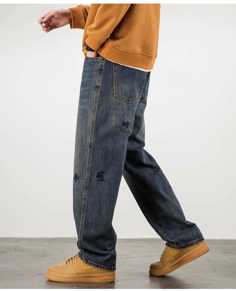 트렌디 한 청바지 남자의 봄과 가을 2025 새로운 하이 스트리트 독특한 자수 플러스 사이즈 바지 느슨한 스트레이트 바지
