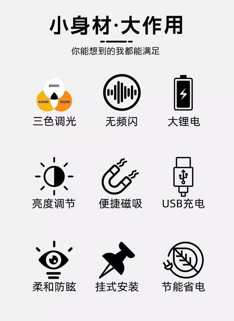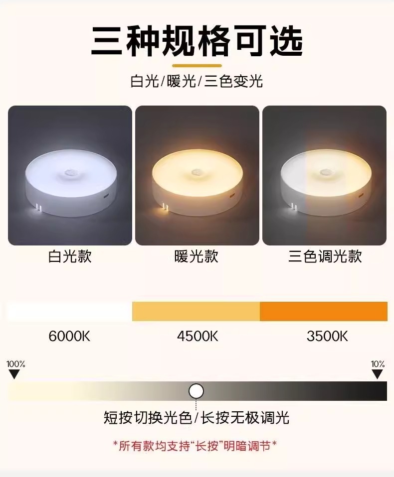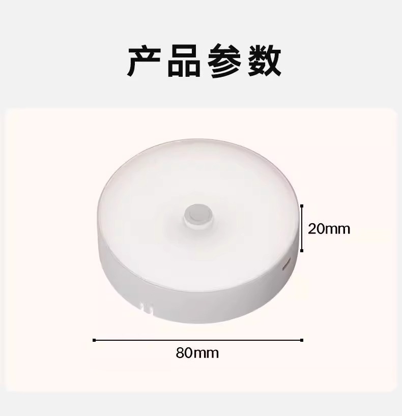 | 灯光颜色 | 白光按键款【1个装】可调亮度(送充电线+磁贴), 暖光按键款【1个装】可调亮度(送充电线+磁贴), 三色变光按键款【1个装】可调亮度(送充电线+磁贴), 按键磁吸款【1个装】三色变光+充电线, 感应灯白光【1只装】送充电线+磁贴, 感应灯暖光【1只装】送充电线+磁贴, 黄光感应灯【感应+常亮+C口】1250毫安, 白光感应灯【感应+常亮+C口】1250毫安, 1个装【语音新款】三色变光智能声控, 磁吸款【10cm】三色变光 亮度可调, 磁吸款【20cm】三色变光 亮度可调, 磁吸款【30cm】三色变光 亮度可调 | 光源功率 | 默认 |