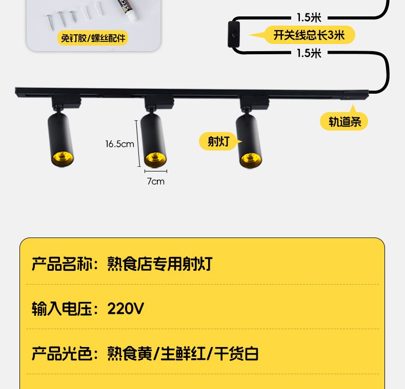 | 开关类型 | 按钮式 | 功率 | 1*30W【熟食黄】配1米轨道+免钉胶, 2*30W【熟食黄】配1米轨道+免钉胶, 3*30W【熟食黄】配1米轨道+免钉胶, 4*30W【熟食黄】配1.5米轨道+免钉胶, 1*30W【生鲜红】配1米轨道+免钉胶, 2*30W【生鲜红】配1米轨道+免钉胶, 3*30W【生鲜红】配1米轨道+免钉胶, 4*30W【生鲜红】配1.5米轨道+免钉胶, 1*30W【干货白】配1米轨道+免钉胶, 2*30W【干货白】配1米轨道+免钉胶, 3*30W【干货白】配1米轨道+免钉胶, 4*30W【干货白】配1.5米轨道+免钉胶, 单灯30W【熟食黄】不含轨道, 单灯30W【生鲜红】不含轨道, 单灯30W【干货白】不含轨道 |