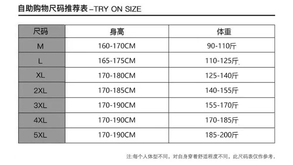 | 颜色 | 黑色, 灰色 | 尺码 | M, L, XL, 2XL, 3XL, 4XL, 5XL |