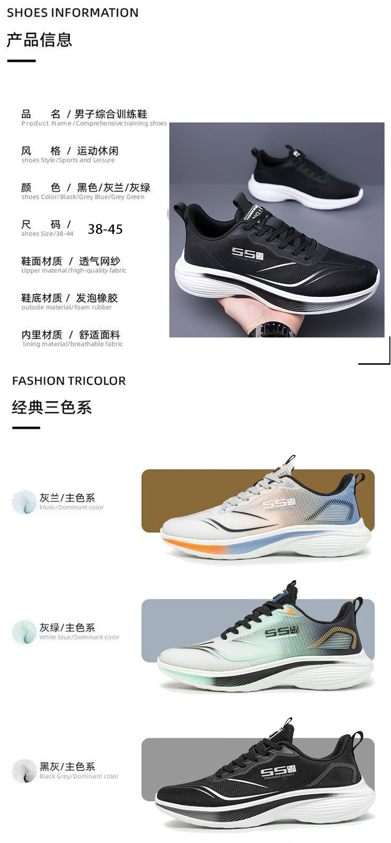 | 最晚发货时间 | 3天 | 颜色 | 白蓝色(网面), 白绿色(网面), 黑色(网面), 黑蓝网面, 白蓝(皮面), 白绿(皮面), 黑色(皮面) |