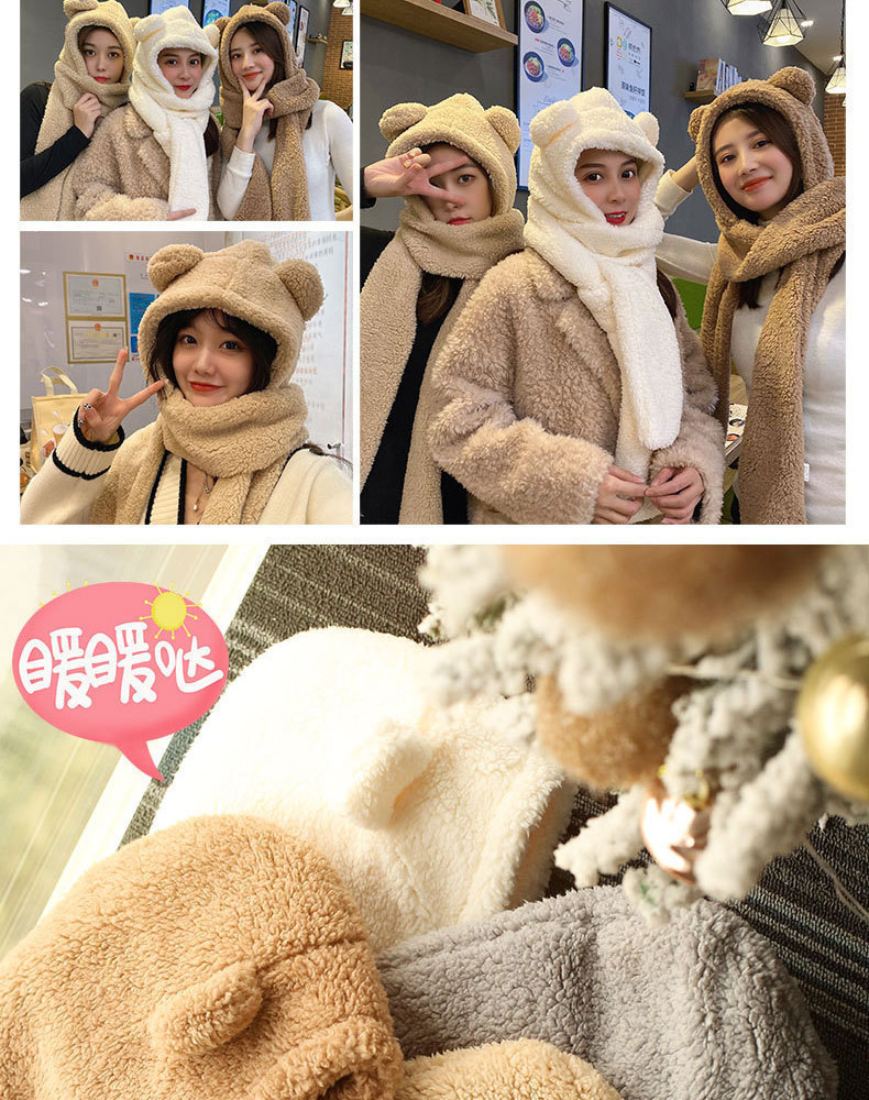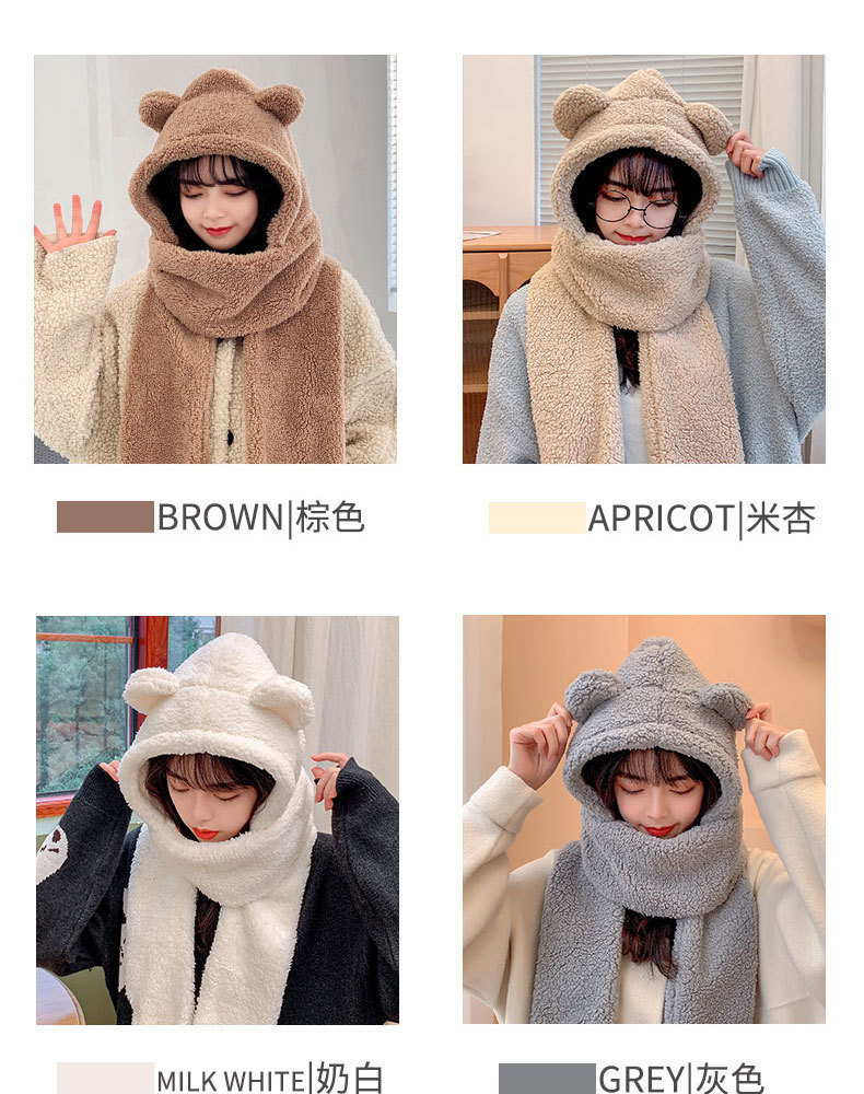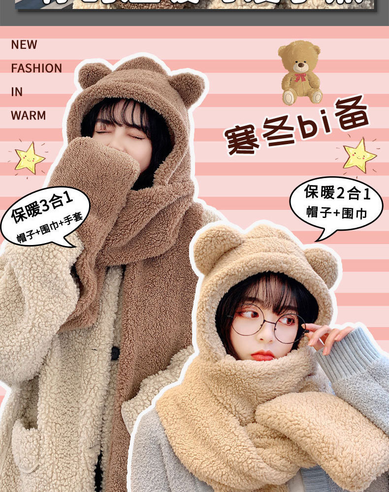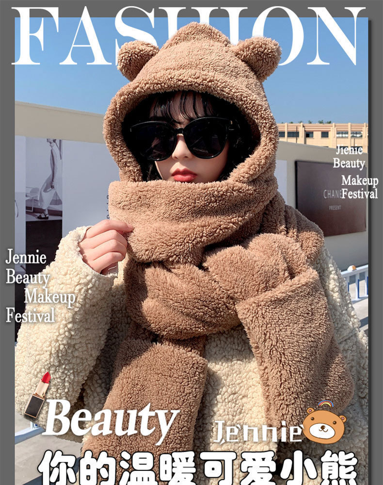 여성용 곰돌이 모자 가을 겨울용 털 스카프 일체형 후드 장갑 3종 세트 목도리 후드 포함