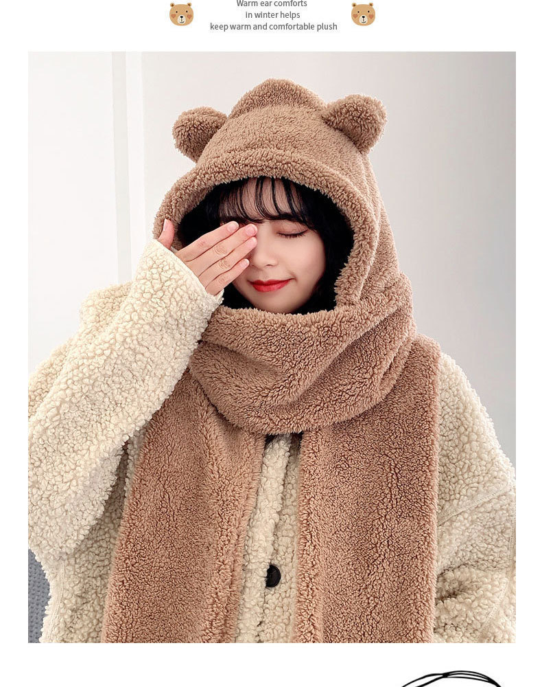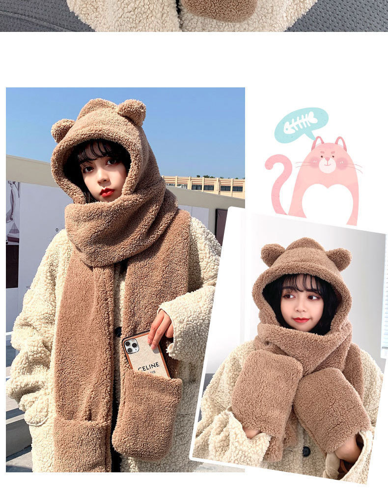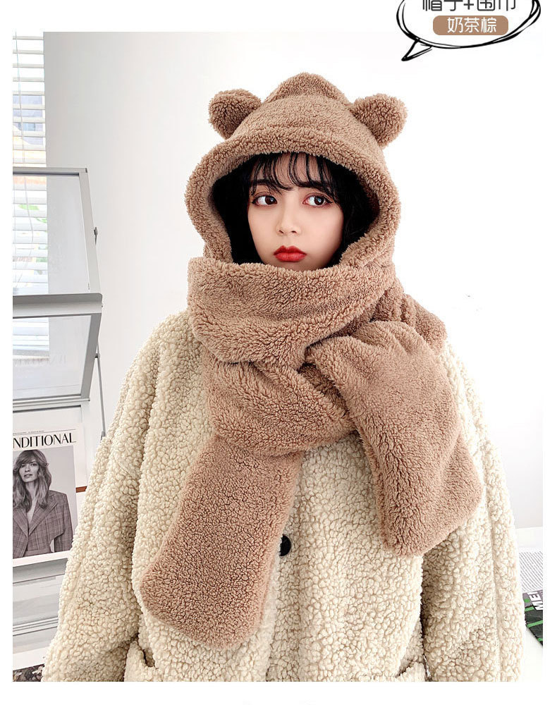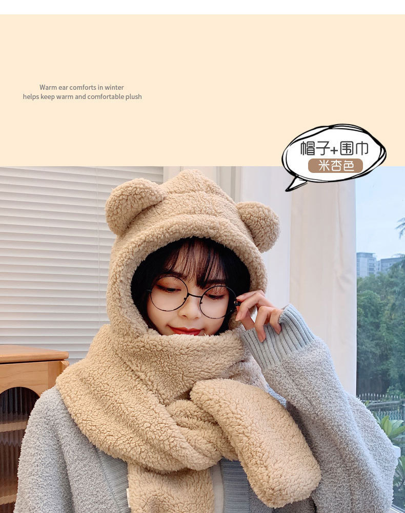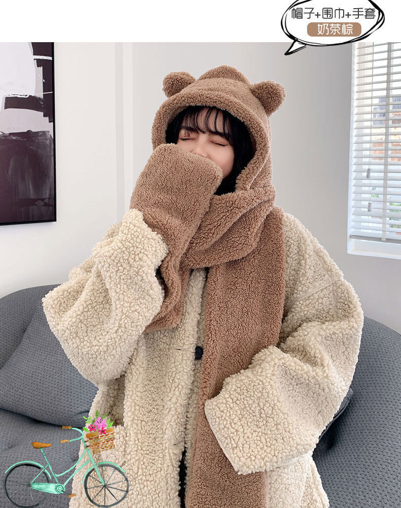 여성용 곰돌이 모자 가을 겨울용 털 스카프 일체형 후드 장갑 3종 세트 목도리 후드 포함