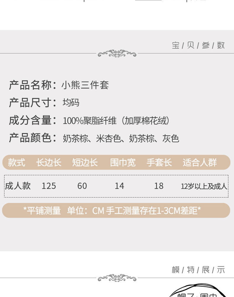 | 颜色 | 小熊三件套--奶白色, 小熊三件套--米白色, 小熊三件套--咖色, 小熊三件套--灰色 | 适合季节 | 冬季 |