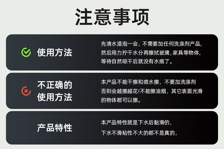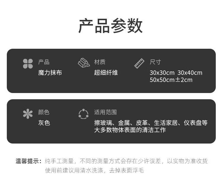 | 颜色 | 高质量魔力布, 高质量魔力布【白色】, 高质量魔力布【opp袋装1条】, 高质量魔力布【opp袋装3条】, 高质量魔力布【opp袋装5条】 | 规格 | 20*25厘米, 20*30厘米, 30*30厘米, 30*40厘米, 40*50厘米, 50*50厘米, 50*80厘米 |