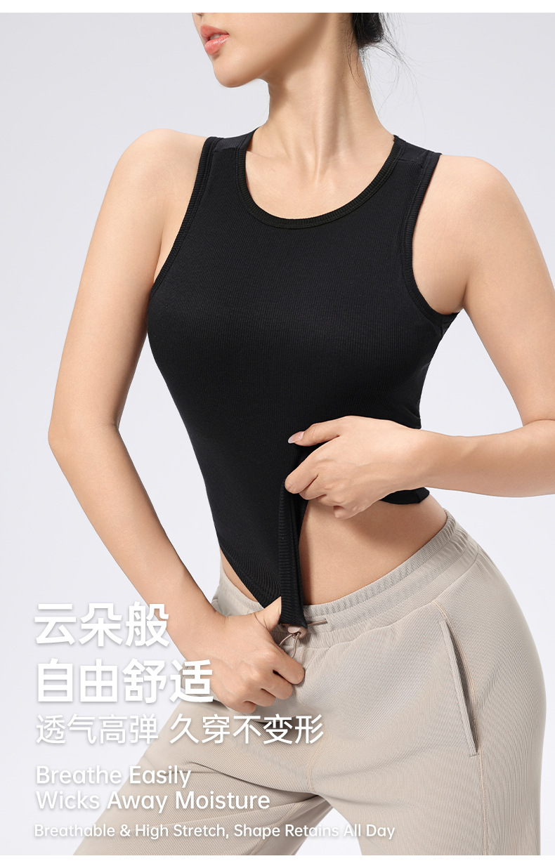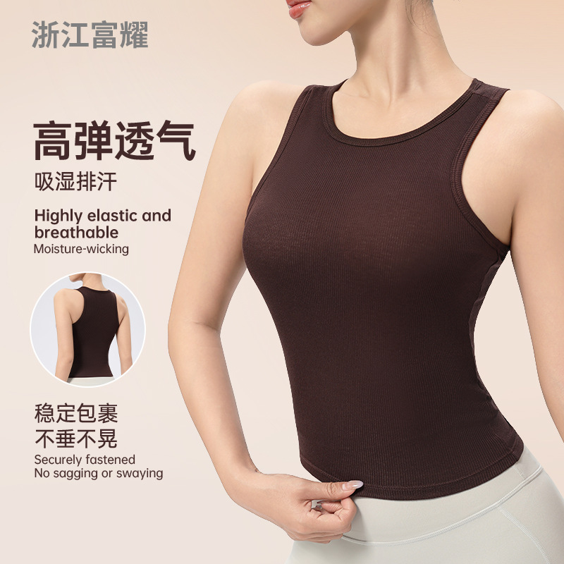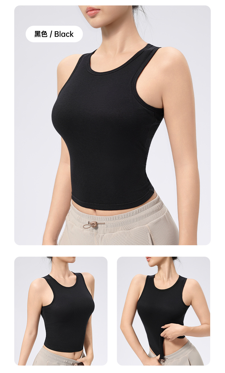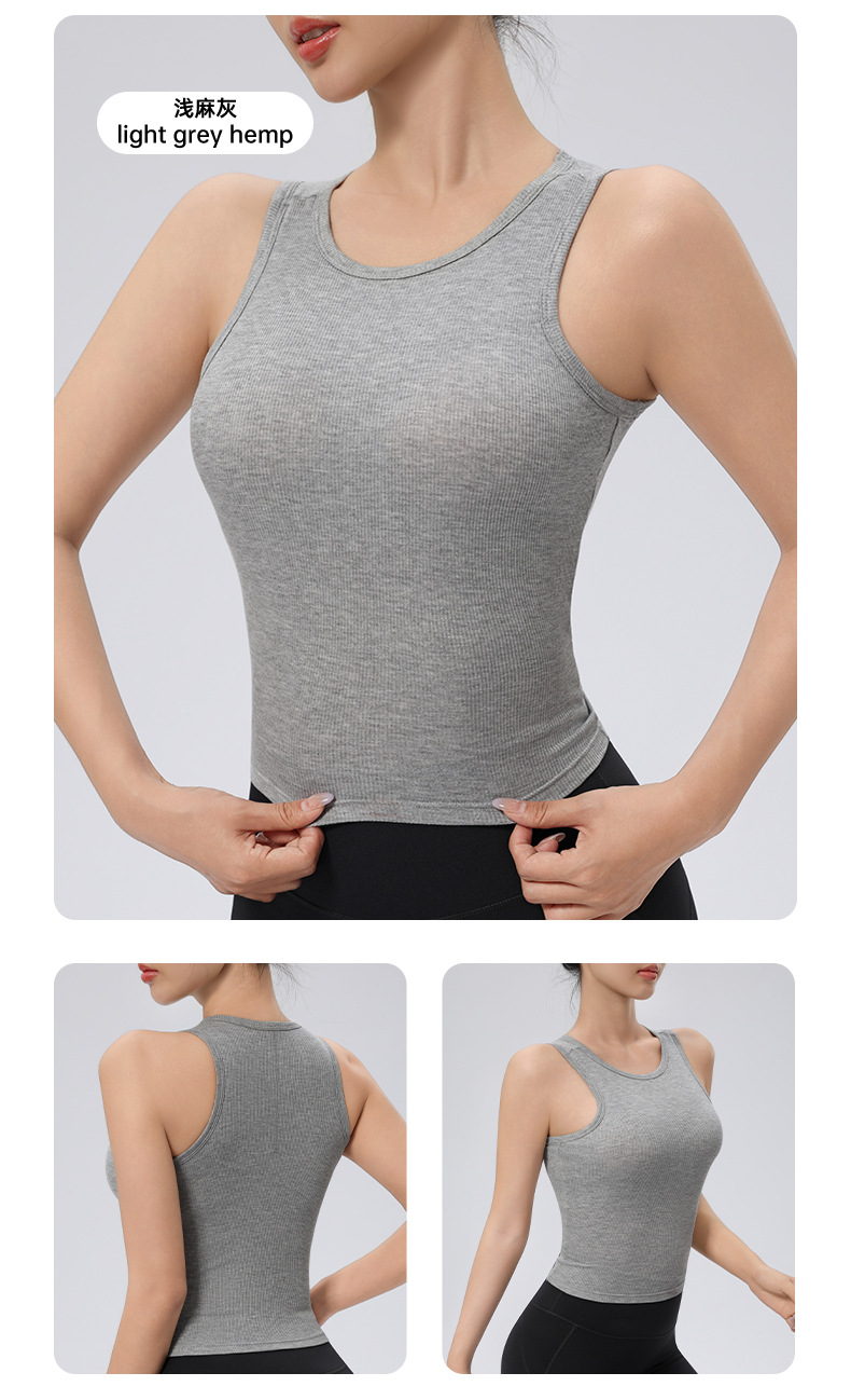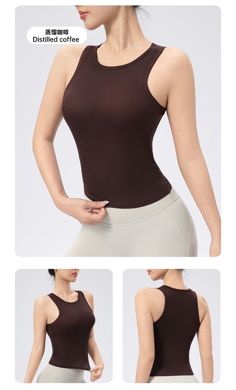 가슴 패드가 있는 여성용 골지 라운드 넥 스포츠 조끼, 다용도 슬림 요가 탑, 필라테스 민소매 요가복